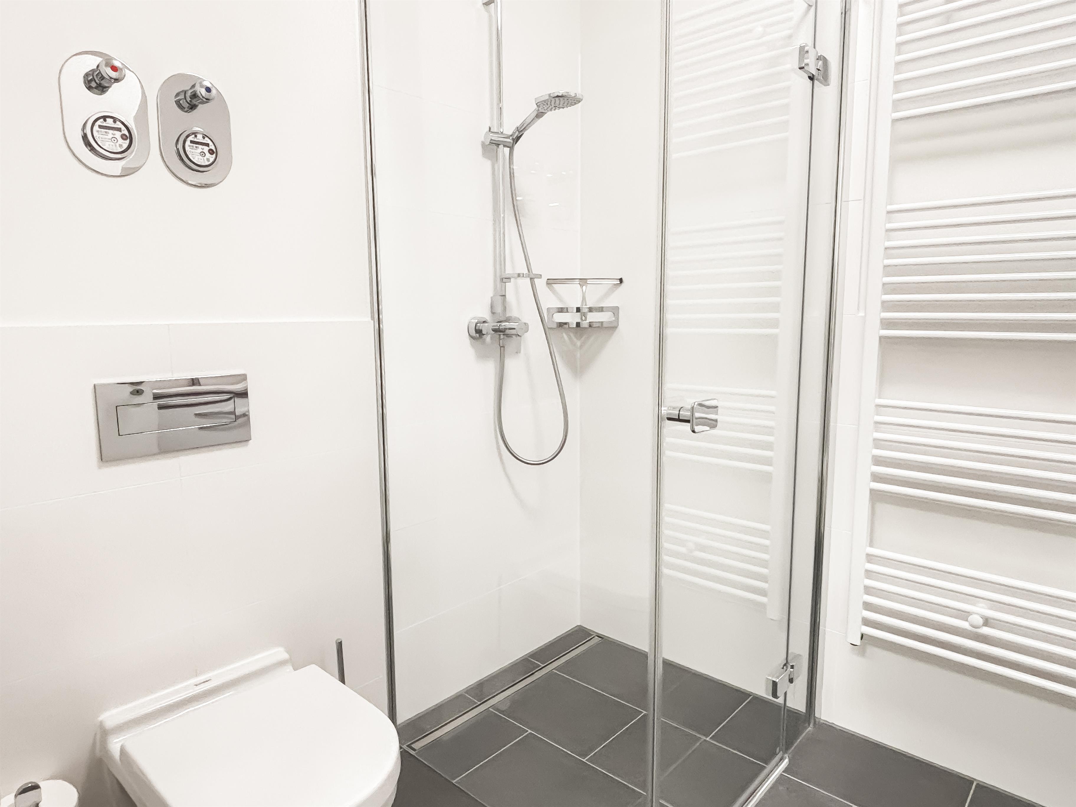 Im Badezimmer erwartet Sie eine Dusche, WC sowie ein Waschtisch mit großem Spiegel. Eine Waschmaschine steht ebenfalls zur Verfügung.