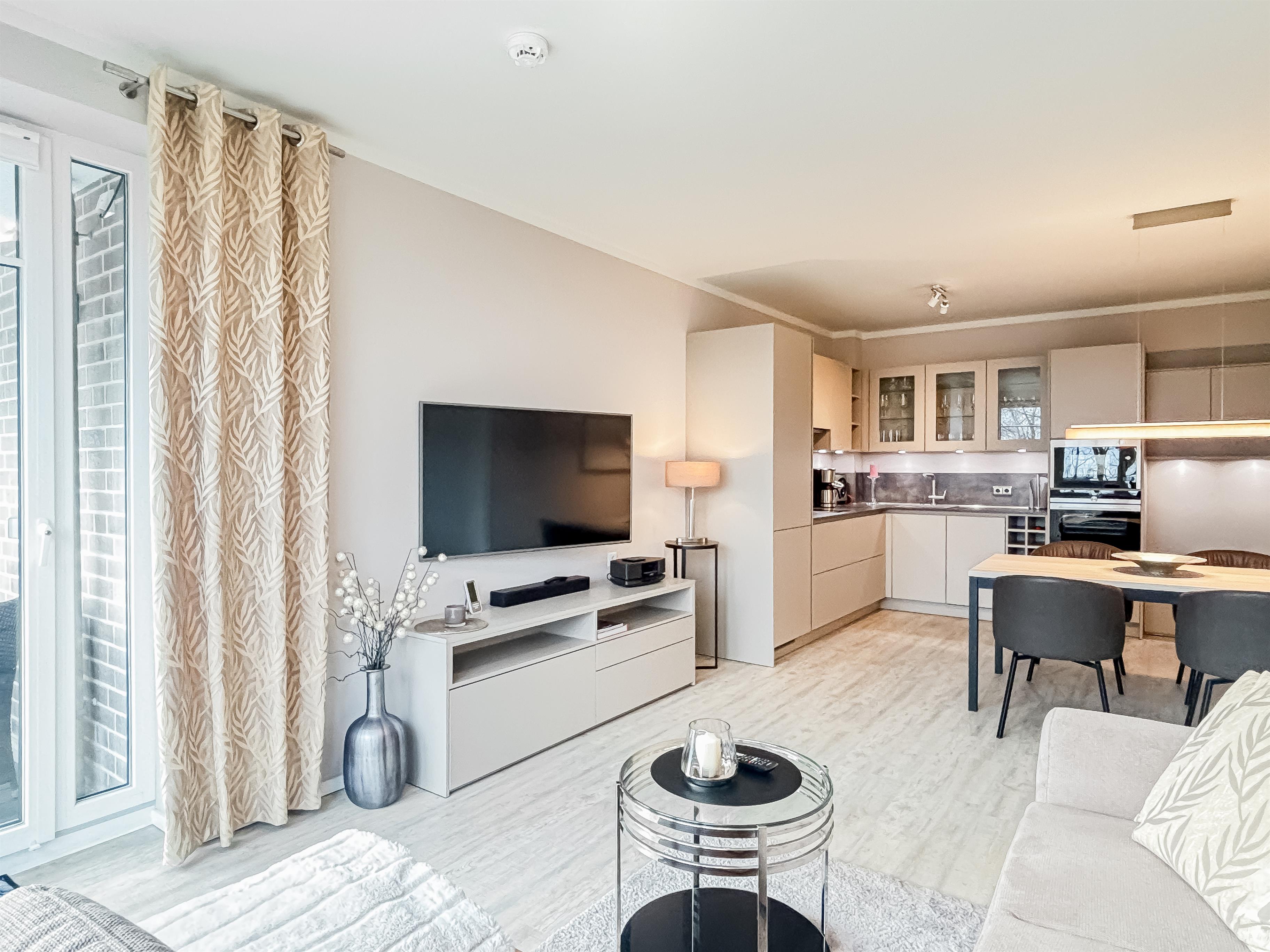 Das Herzstück der Wohnung ist der gemütliche Wohnbereich mit großem Esstisch, bequemer Couch und Flachbild-TV. Von hier aus gelangen Sie auf den möblierten Balkon – perfekt für entspannte Stunden im Freien.