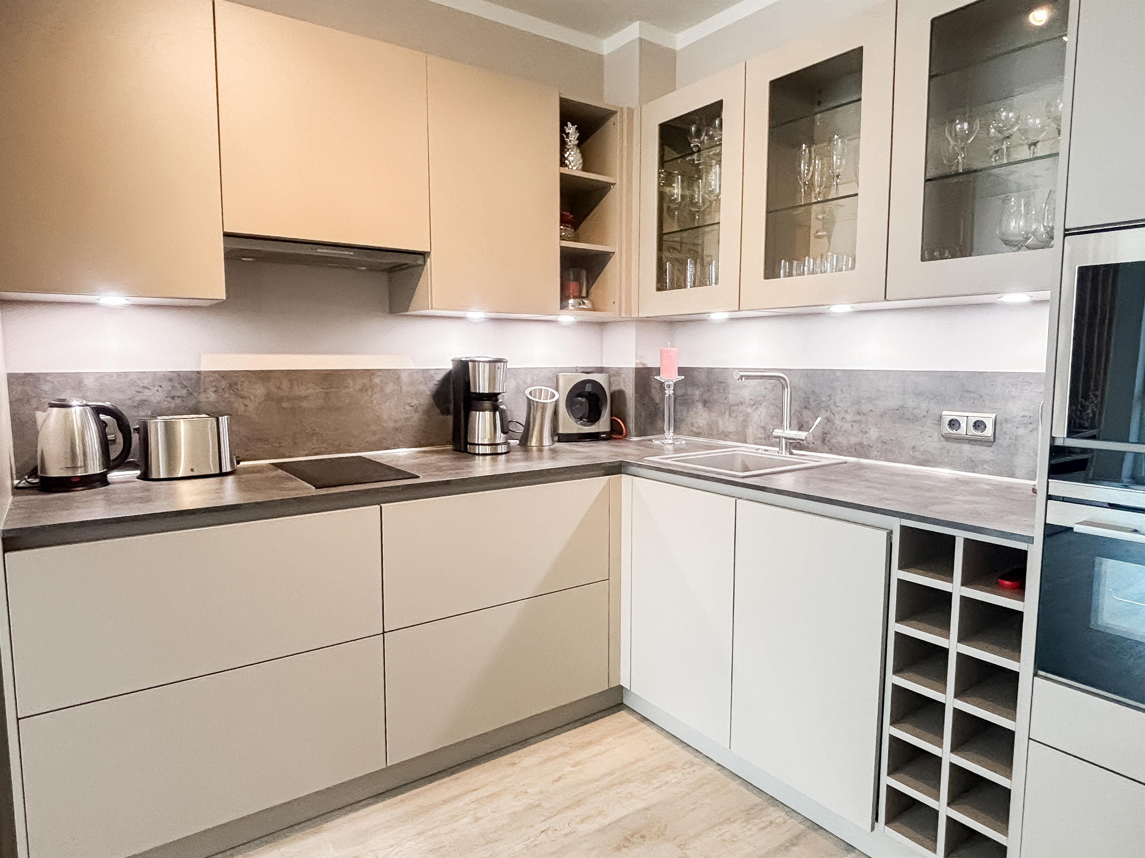 Die offene Küche ist modern ausgestattet mit Backofen, Mikrowelle, Geschirrspüler, Kaffeemaschine, Toaster, Wasserkocher und allem, was Sie für die Selbstverpflegung benötigen.