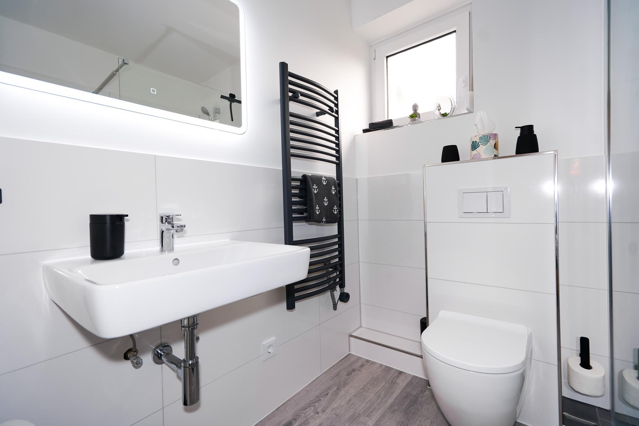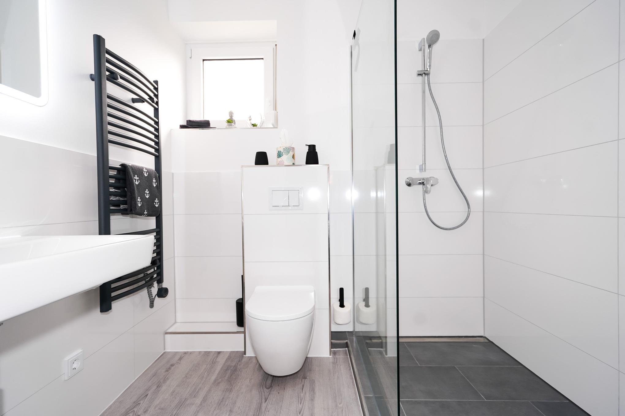 Das modernisierte Badezimmer verfügt über eine barrierefreie Dusche und eine Handtuchheizung.