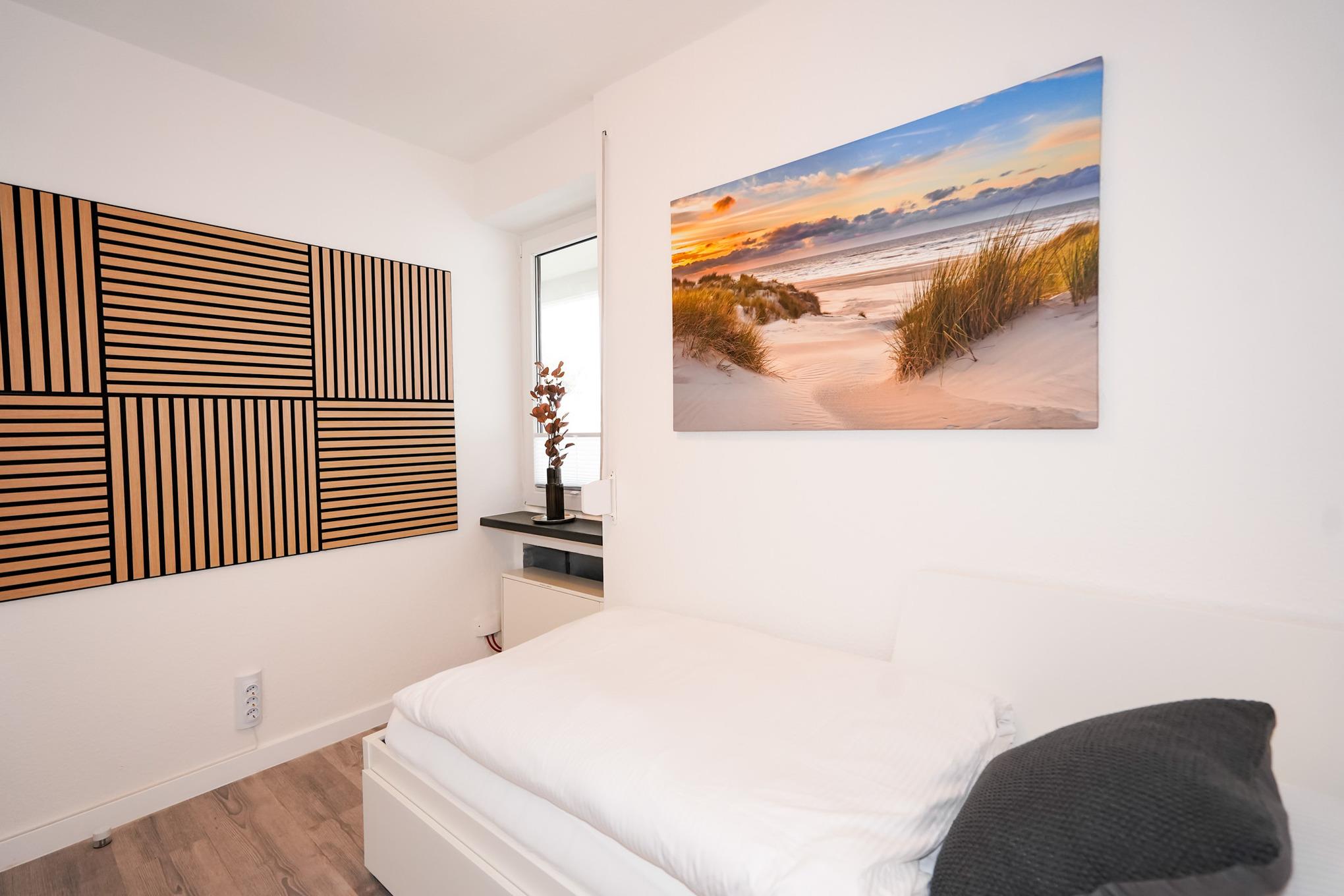 Das Hauptschlafzimmer verfügt über ein Doppelbett mit hochwertigen Matratzen (180x200) und einen großen Kleiderschrank. Durch das Schlafzimmer können Sie ebenfalls den Balkon betreten. Das zweite Schlafzimmer ist mit einem Einzelbett (90x200) ausgestattet. Alle Räume in der Wohnung lassen sich mit elektrischen Rollläden verdunkeln.