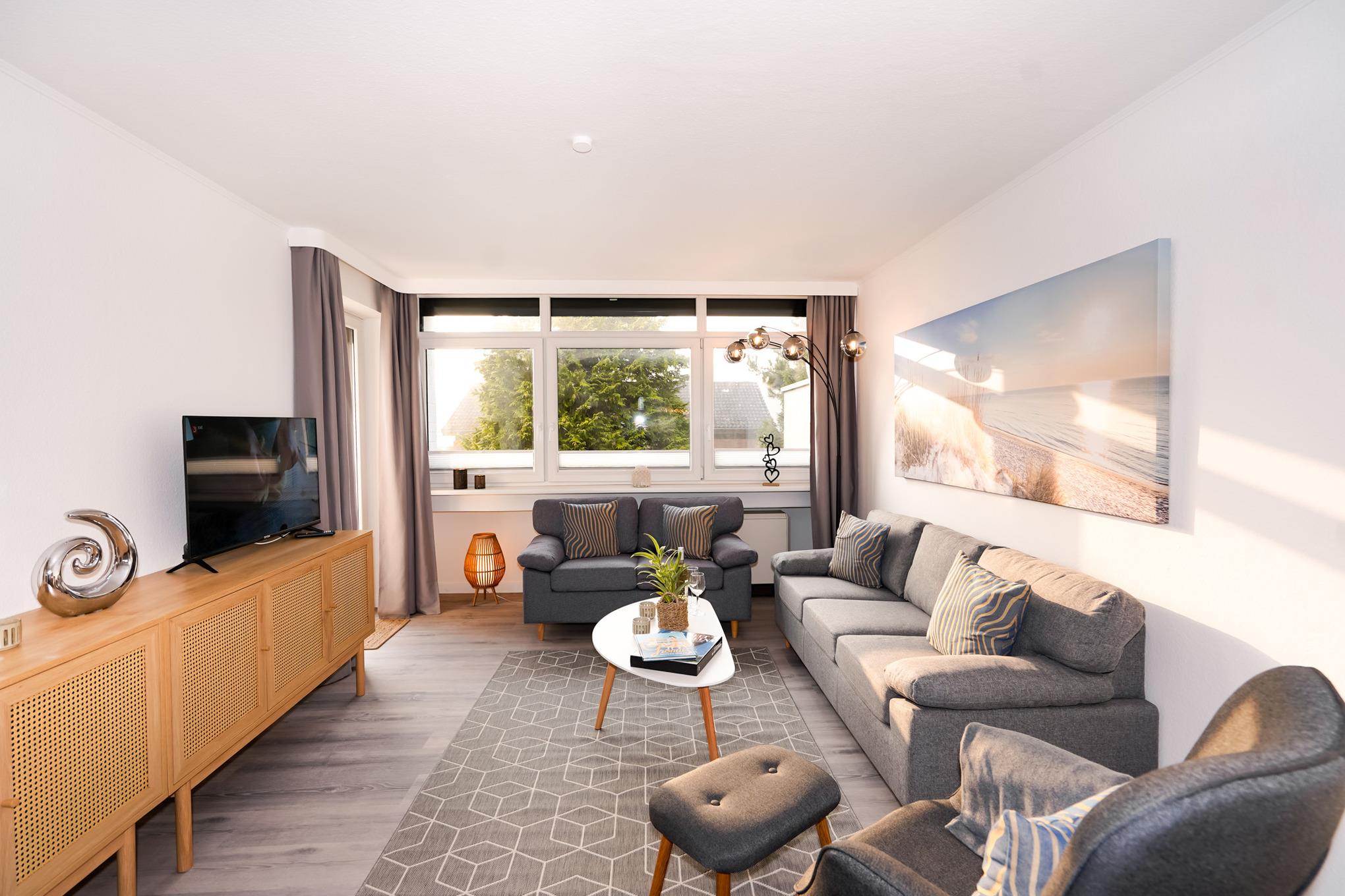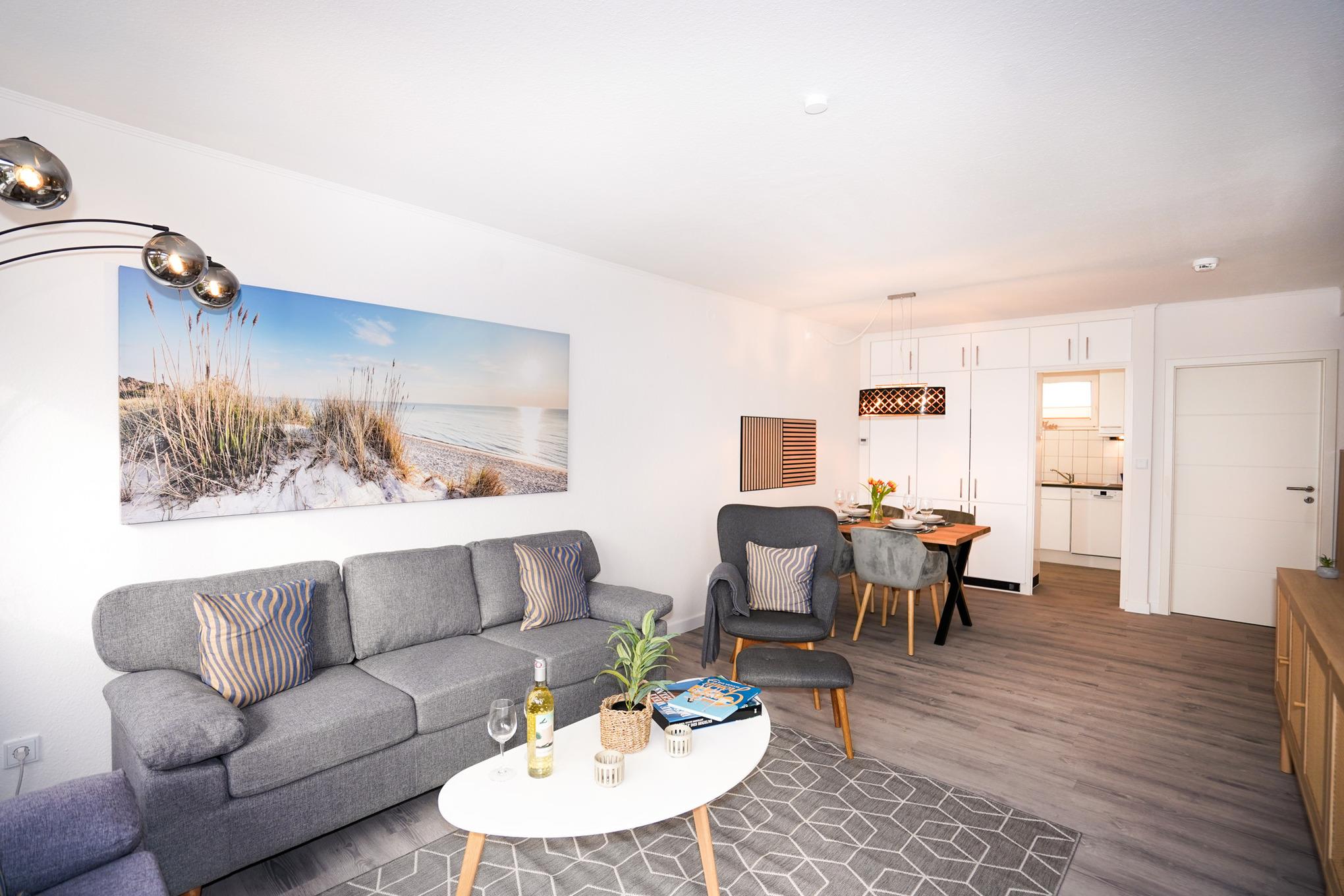 Der helle Wohn- und Essbereich, mit direktem Zugang zum Balkon, ist mit zwei gemütlichen Sofas, einem Sessel und einem großen Esstisch ausgestattet. Ein Fernseher und kostenloses W-LAN ergänzen die Ausstattung.