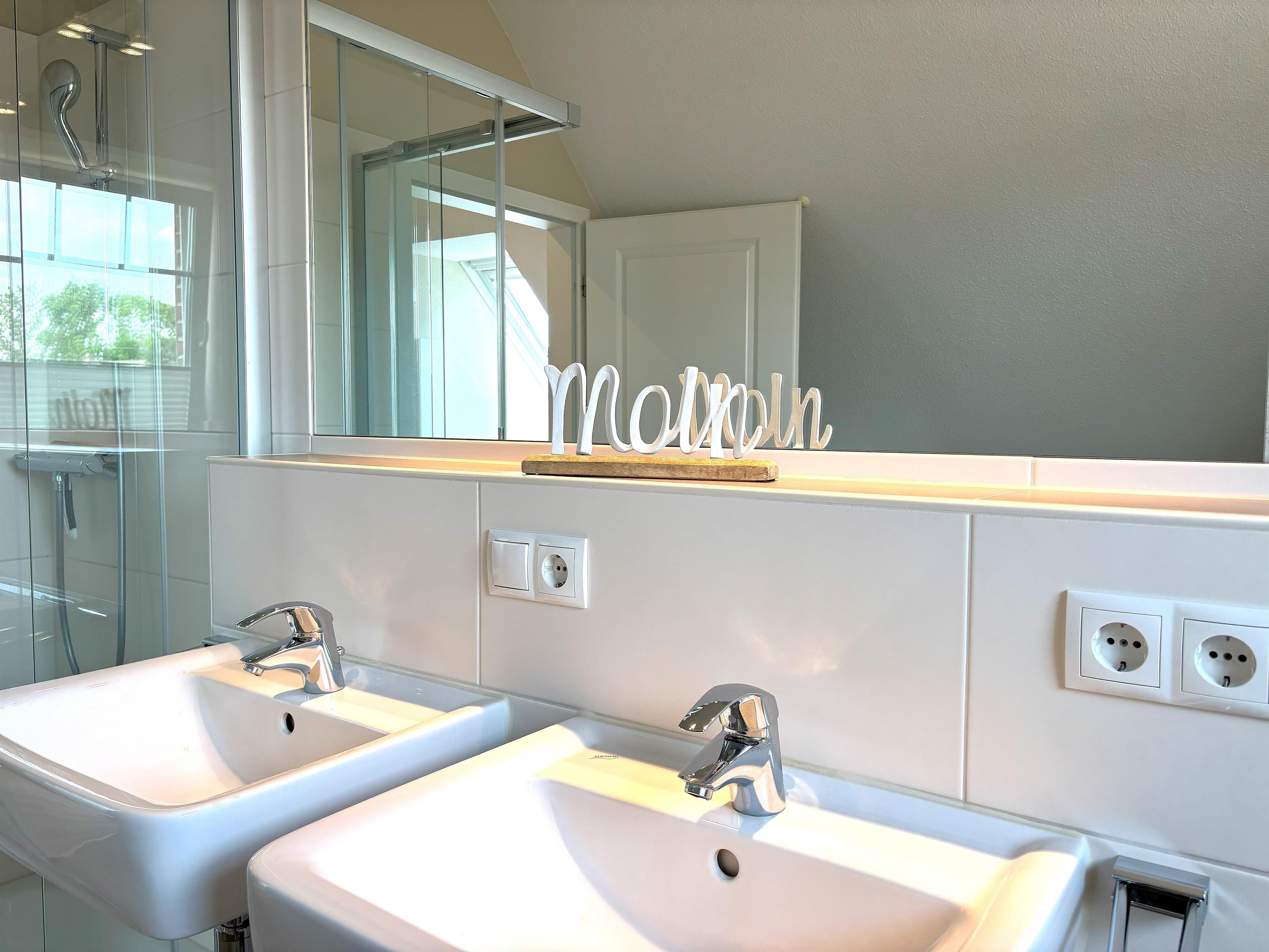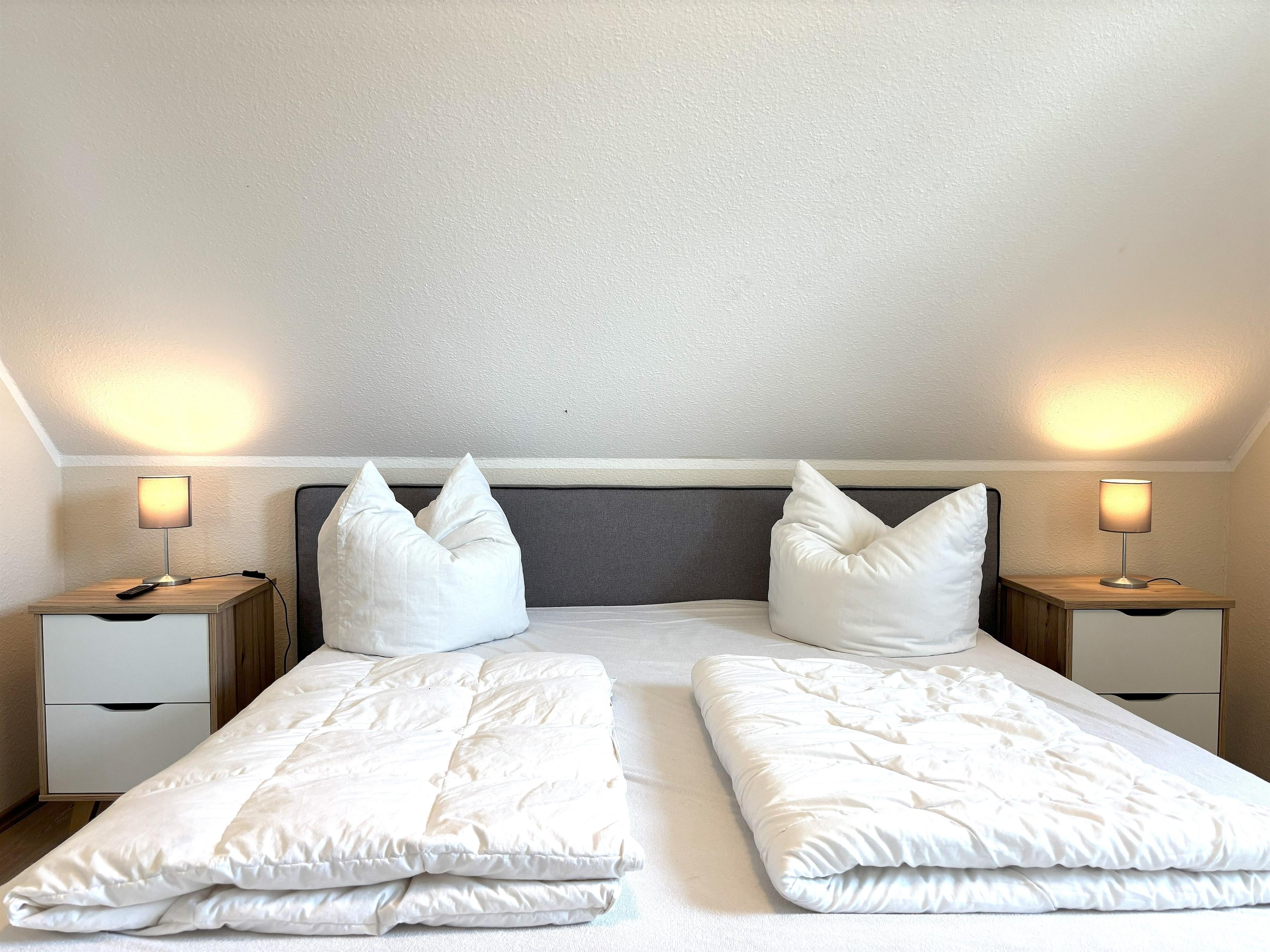 Im Obergeschoss gelangen Sie über eine Holztreppe in den Flurbereich. Hier finden Sie zwei eingerichtete Schlafzimmer: Schlafzimmer 1 verfügt über ein komfortables Doppelbett (1x180x200), einen Kleiderschrank, TV sowie Fenster mit Plissees und Rollläden für eine angenehme Nachtruhe. Schlafzimmer 2 ist mit zwei Einzelbetten (80x200) ausgestattet und bietet ebenfalls einen Kleiderschrank, TV, Fenster sowie Plissee und Rollladen.