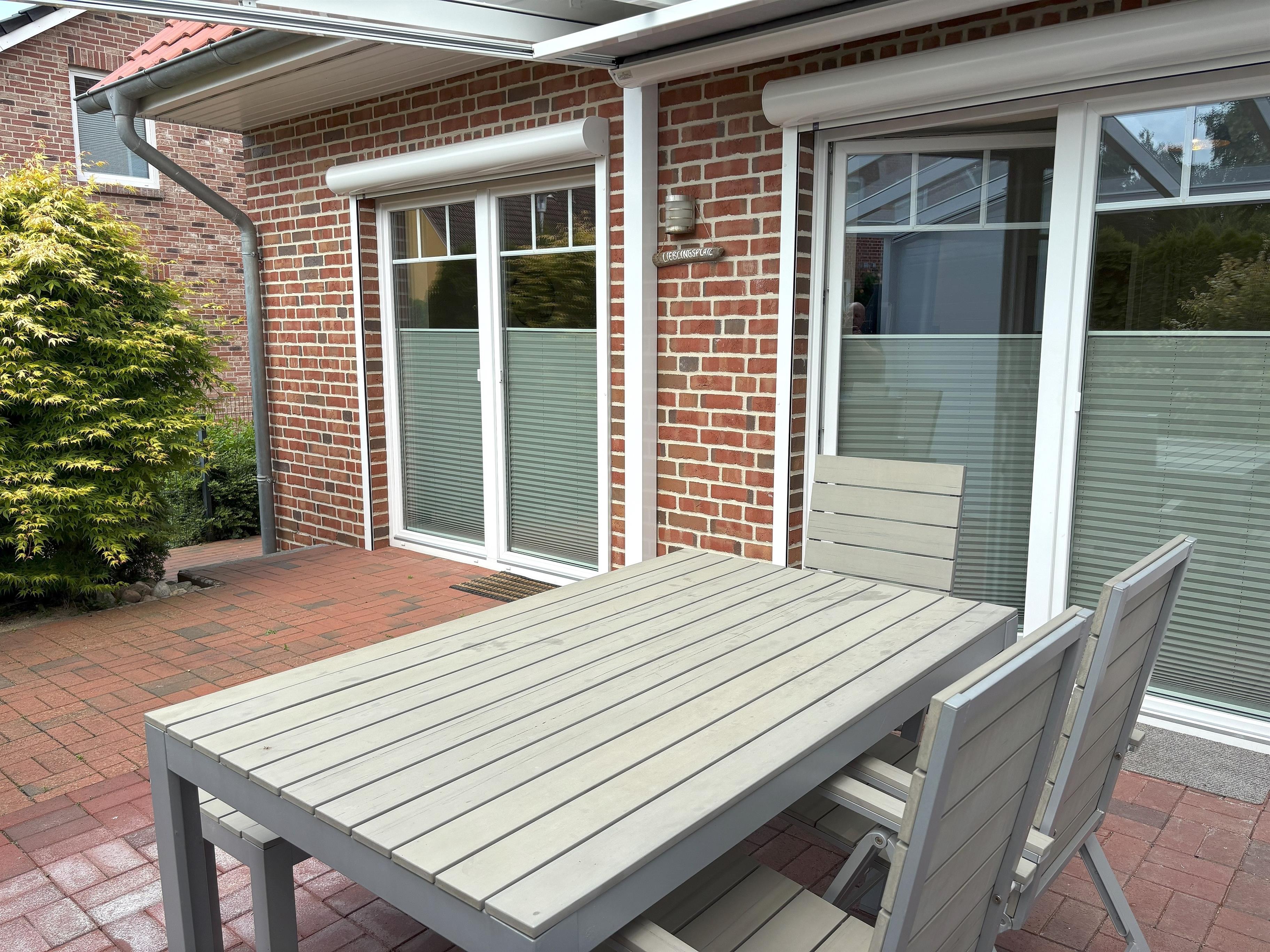 Genießen Sie entspannte Stunden auf der überdachten Südwestterrasse, die mit bequemen Möbeln, Kohlegrill bestückt ist und einen Blick auf das eingezäunte Grünstück bietet – ideal für Familien mit Kindern oder für Ihren vierbeinigen Freund.