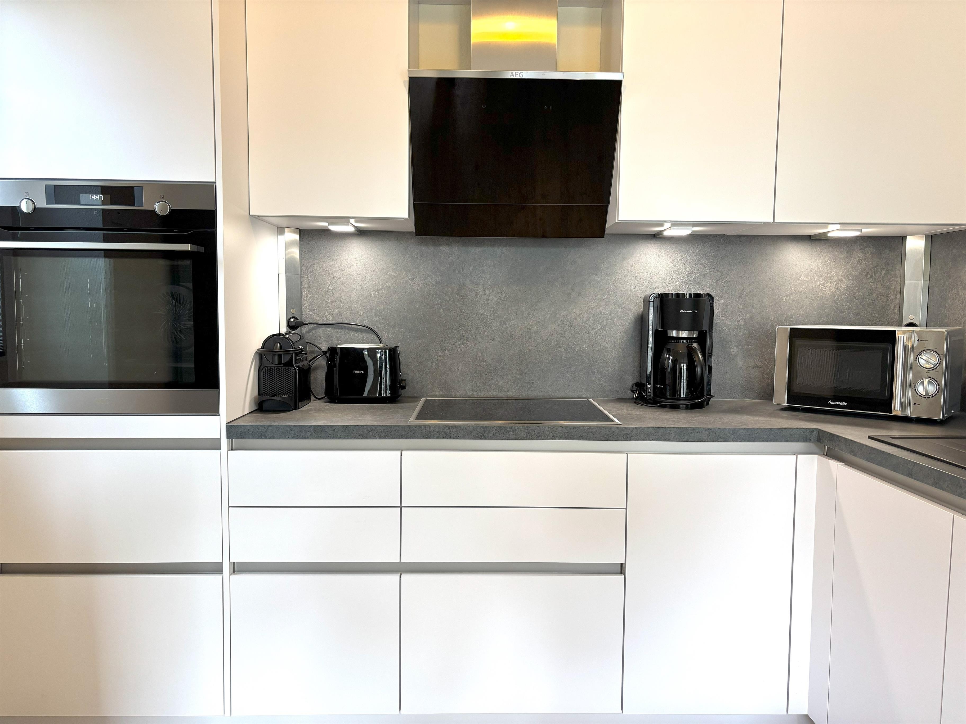 Der lichtdurchflutete Ess- und Wohnbereich lädt zum Verweilen ein und bietet einen Esstisch sowie einen gemütlichen Sofabereich mit TV. Die offene Küche ist mit modernen Geräten ausgestattet, darunter ein Backofen, Kühlschrank und Mikrowelle, und lässt keine Wünsche offen.