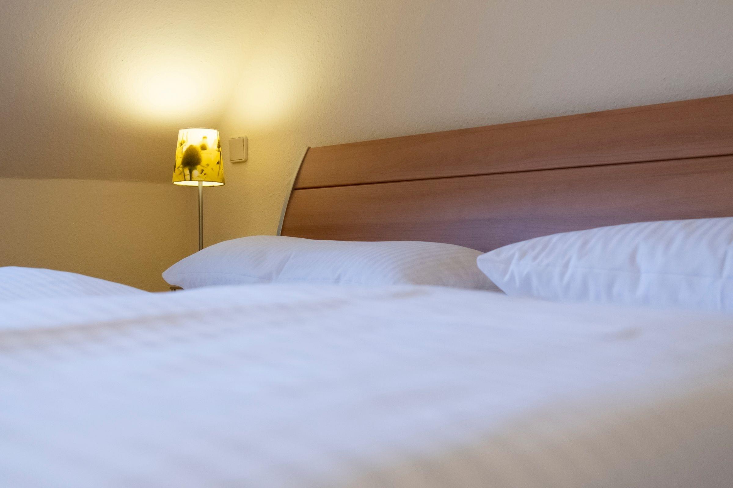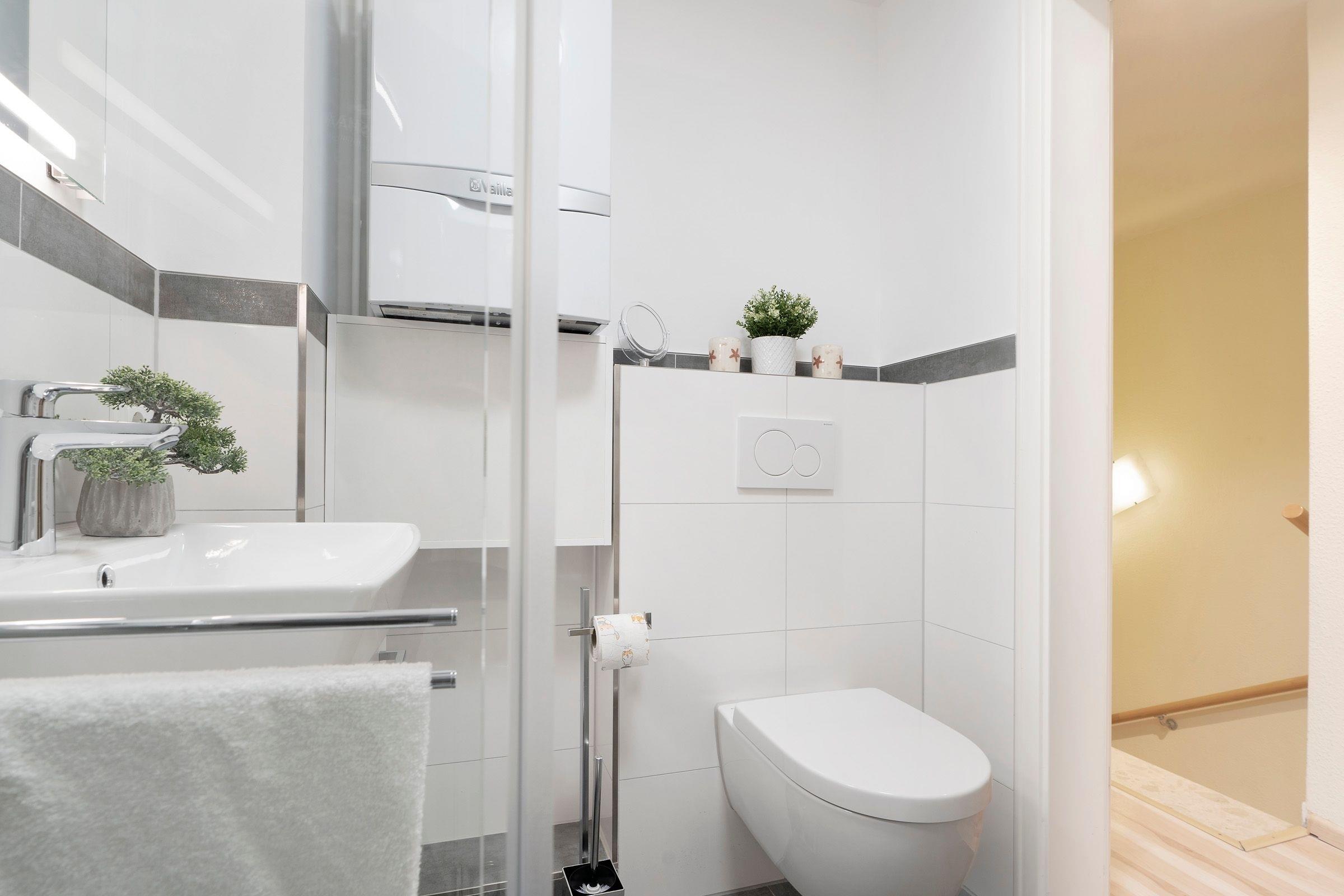 In der 1.Etage erwarten Sie Ihre Schlafräume mit jeweils einem Doppelbett (2 Matratzen, 90 x 200 cm) und das Vollbad mit WC.