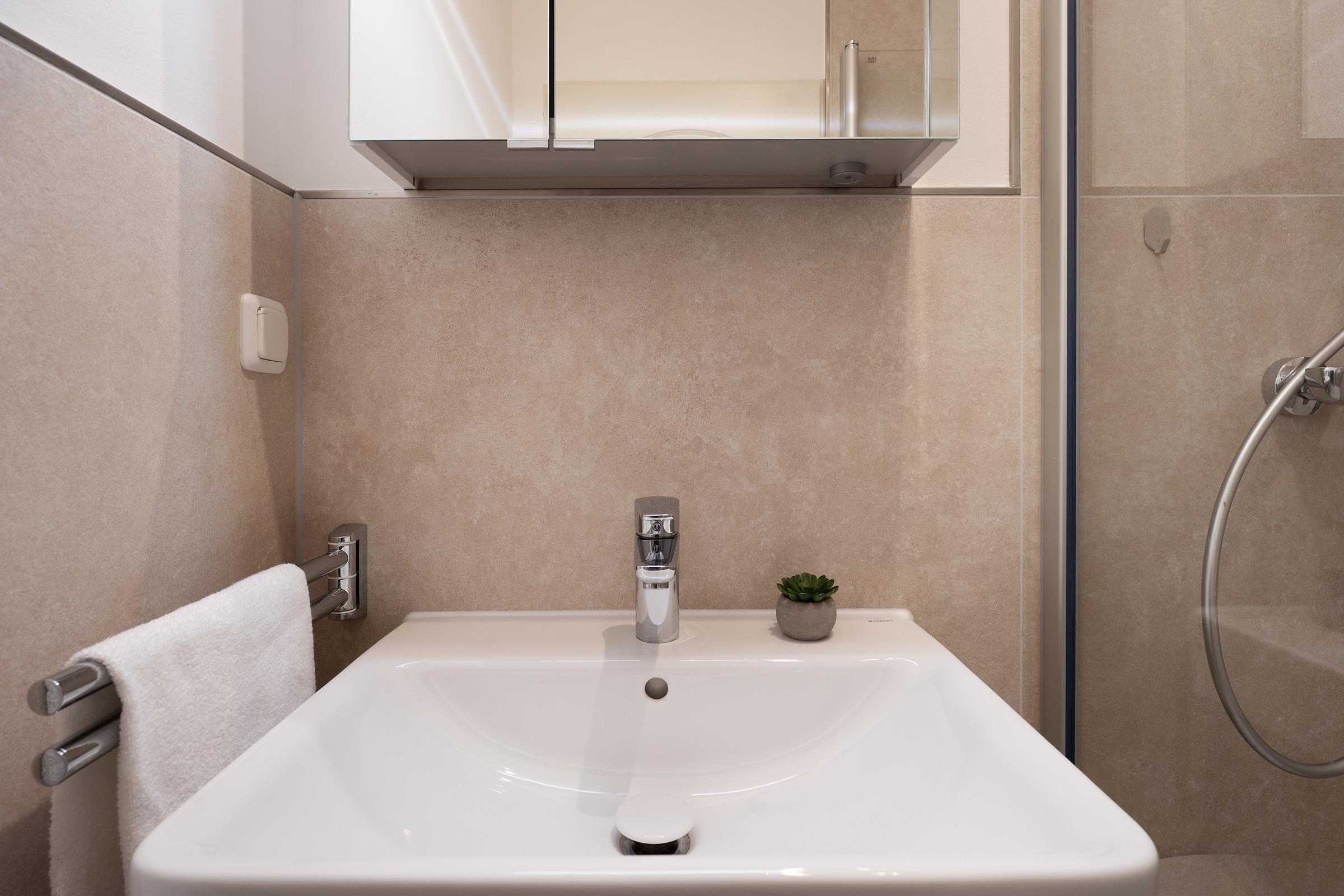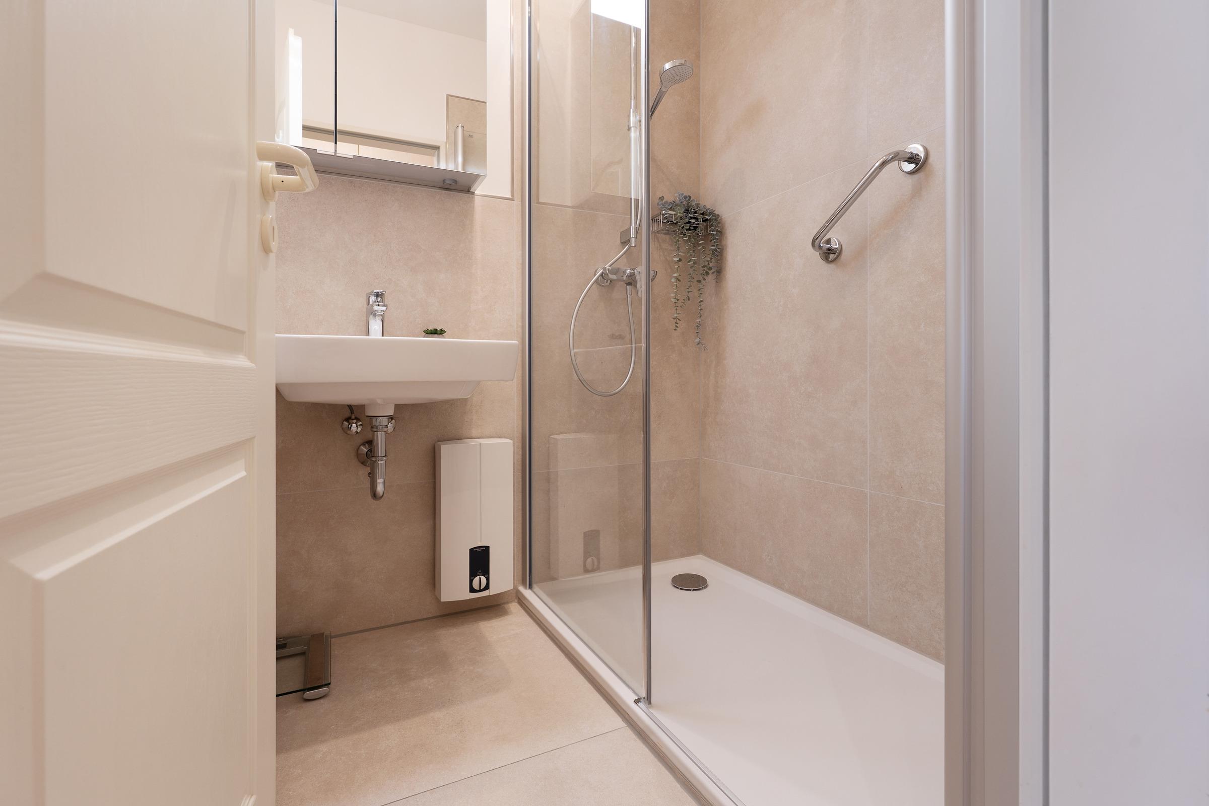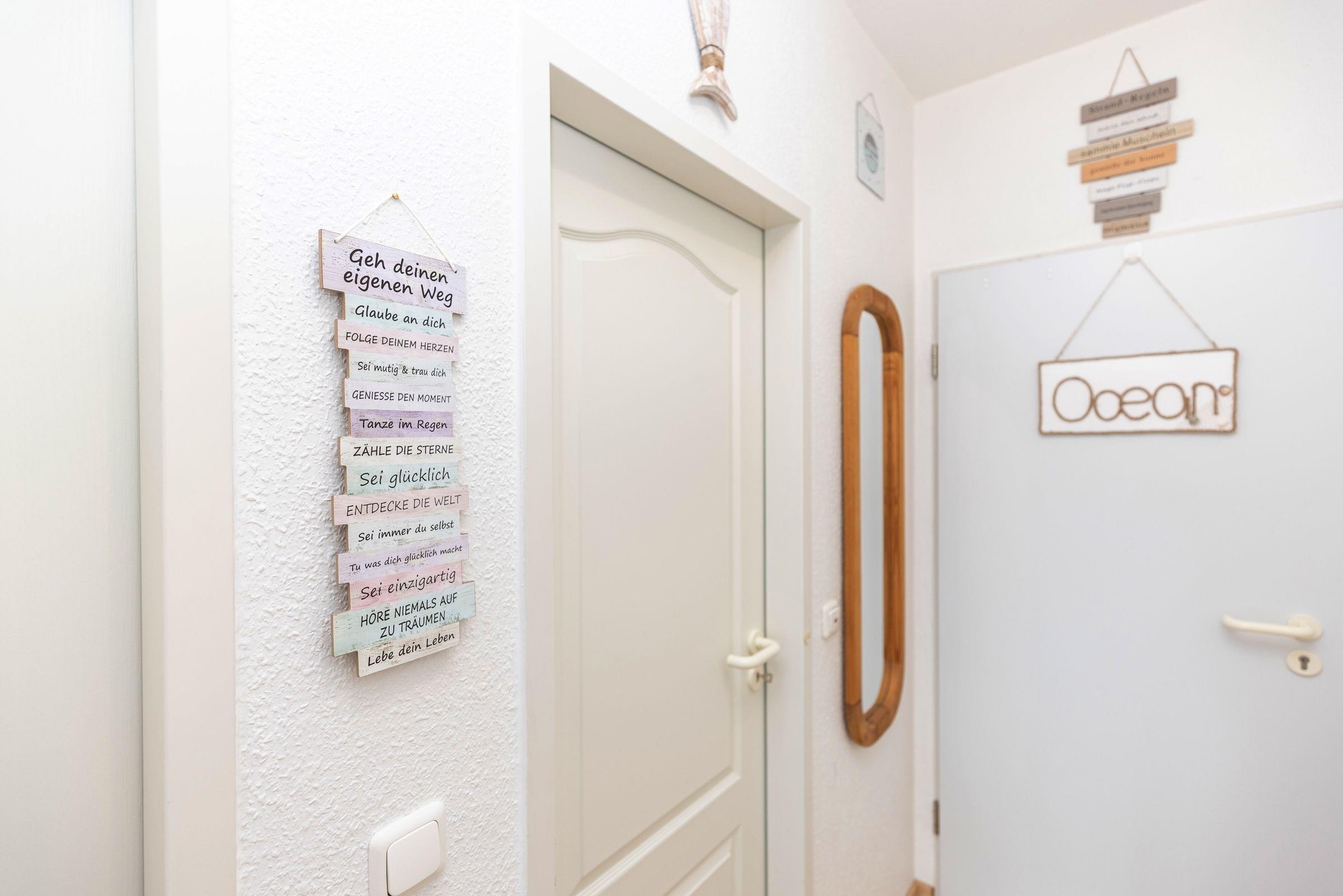 Vom Wohnzimmer gelangen Sie auf Ihre eingezäunte und grün umsäumte, möblierte Terrasse. Dort lassen sich selbst bei Regen die lauen Abende gemütlich im Strandkorb genießen, denn die Terrasse ist anteilig überdacht. Die kleine, aber feine Küche ist separat und mit Alltagshelfern wie Ceranherd, Kühlschrank mit Gefrierfach und Kaffeemaschine solide ausstaffiert. Die Ferienwohnung ist mit zwei Bädern ausgestattet: Einem Vollbad mit Badewanne sowie einem Gäste-WC.