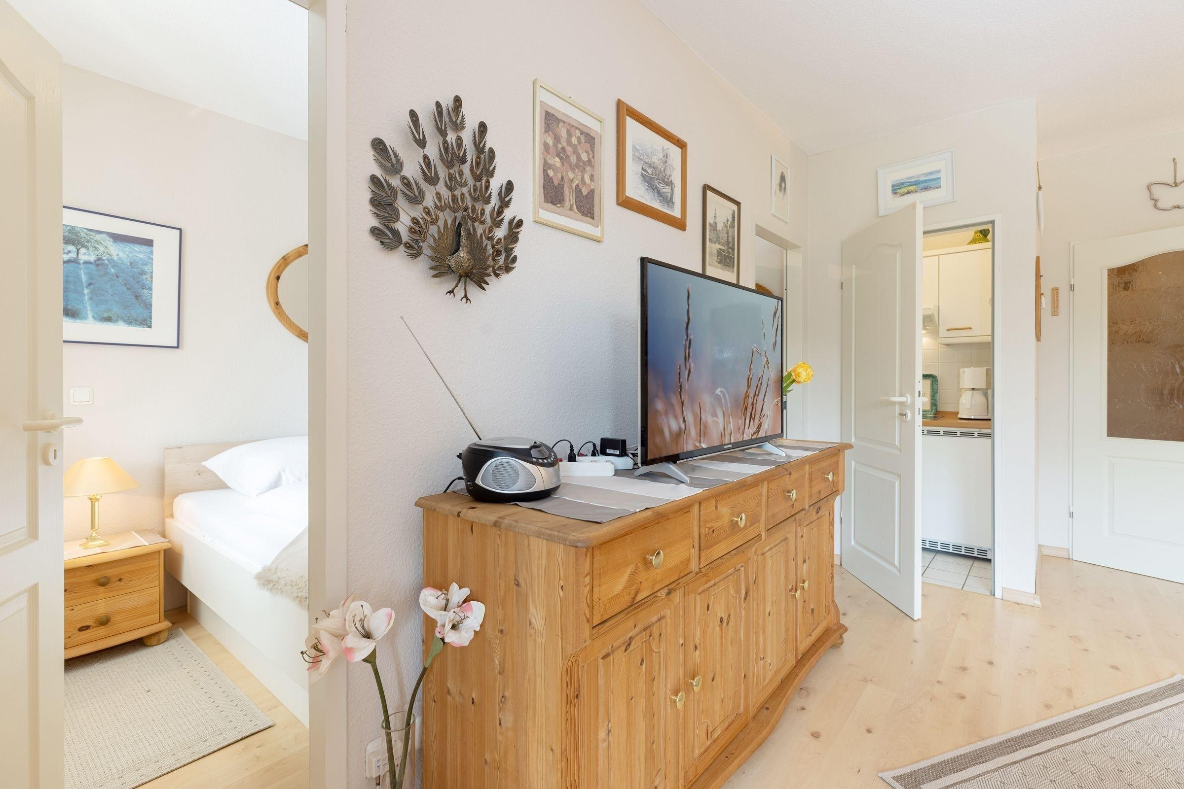 Durch den Flur betreten Sie das Wohnzimmer, welches mit einem Sofa (Liegefläche 85x185cm) und Sesseln sowie einem Essplatz für bis zu 4 Personen behaglich eingerichtet ist. Für Unterhaltung sorgen z. B. ein Flachbildfernseher und ein kostenfreier WLAN-Anschluss.