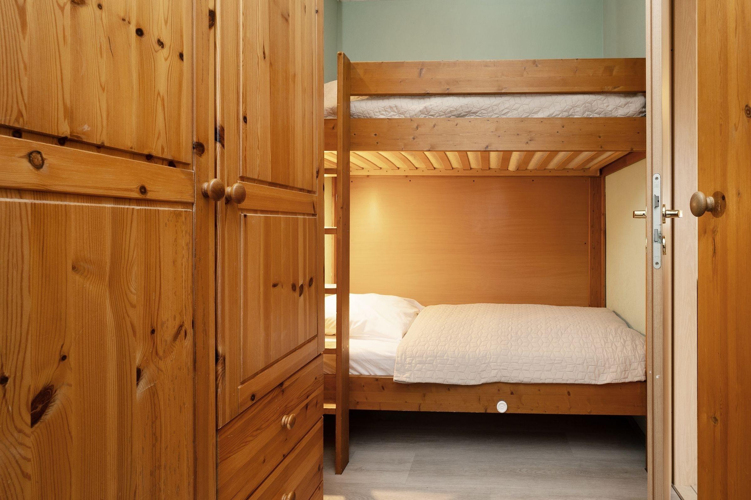 Schlafzimmer 2: 1 Etagenbett (2x 90x200 cm), 1 Einzelbett (90x200 cm), Kleiderschrank, Verdunkelung (Jalousie, innen/außen).