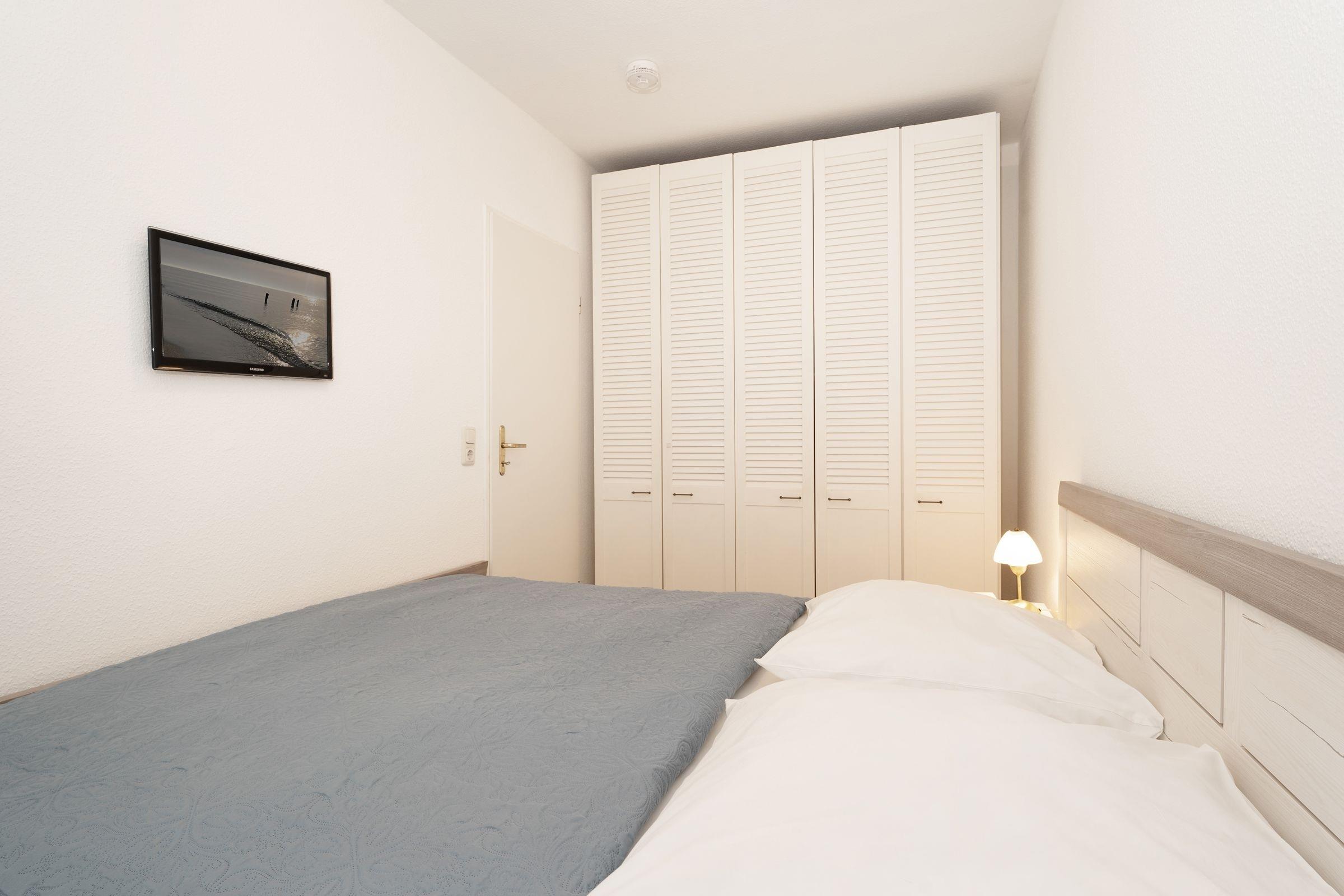 Schafzimmer: 1 Doppelbett (2x 90x200 cm), Kleiderschrank, Verdunkelung (Rollo, Gardinen)