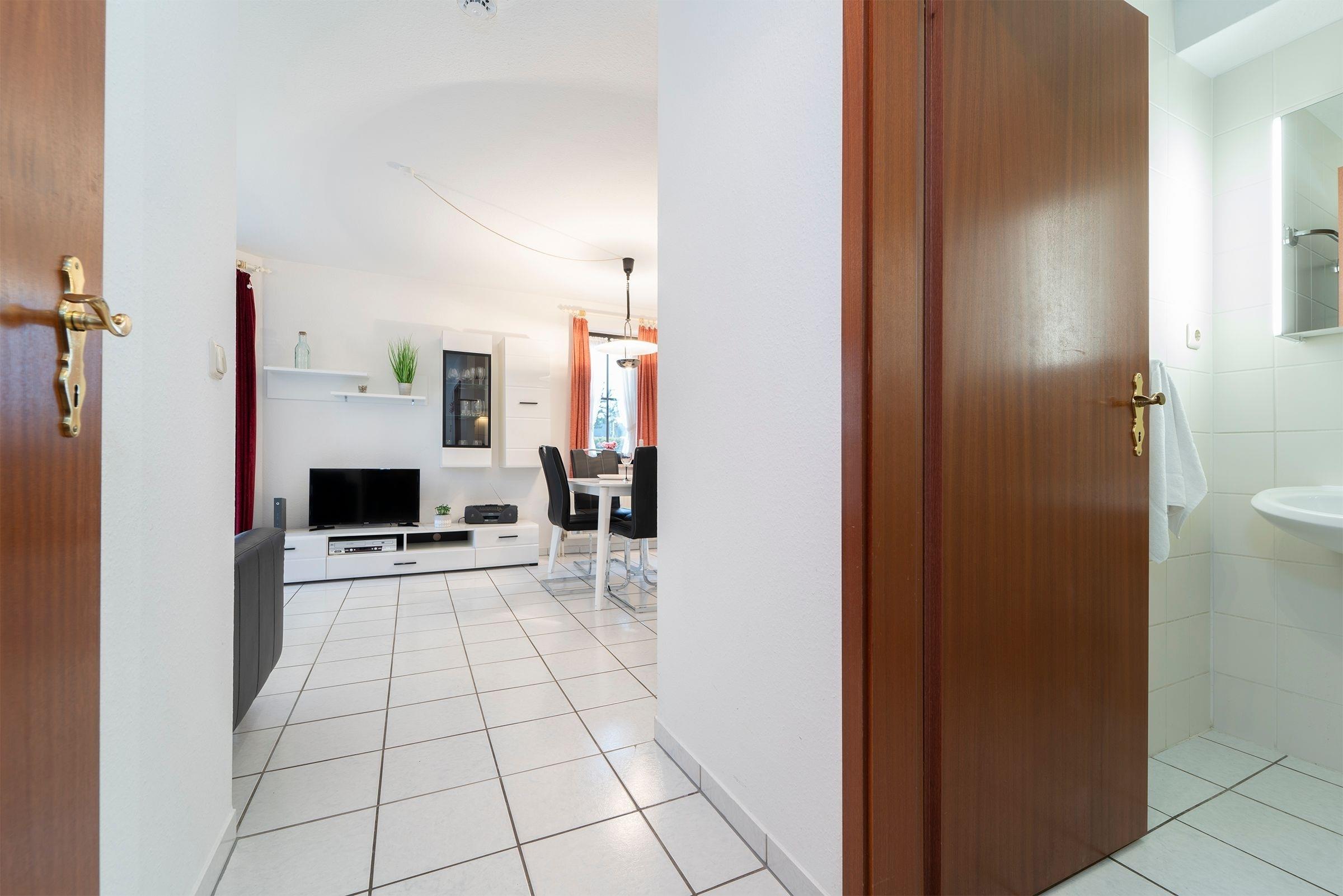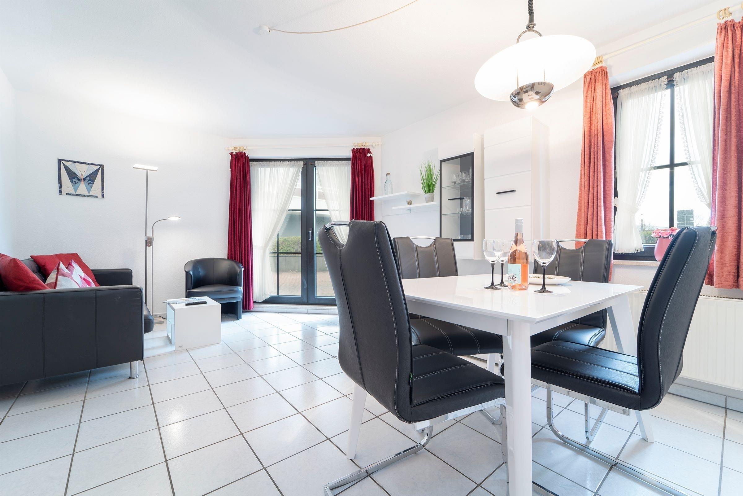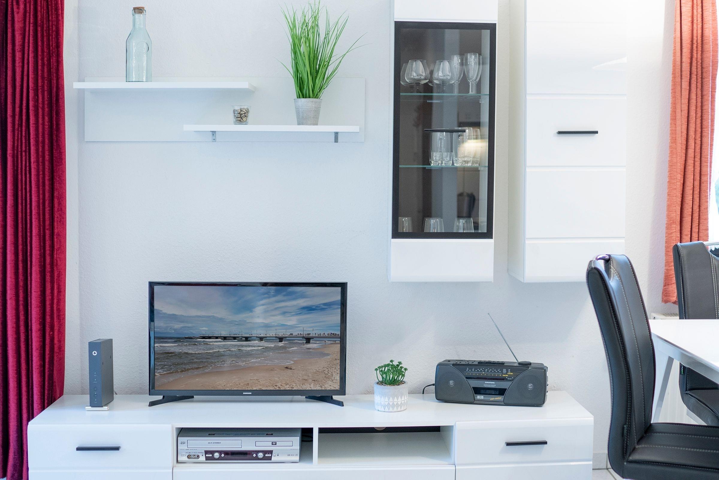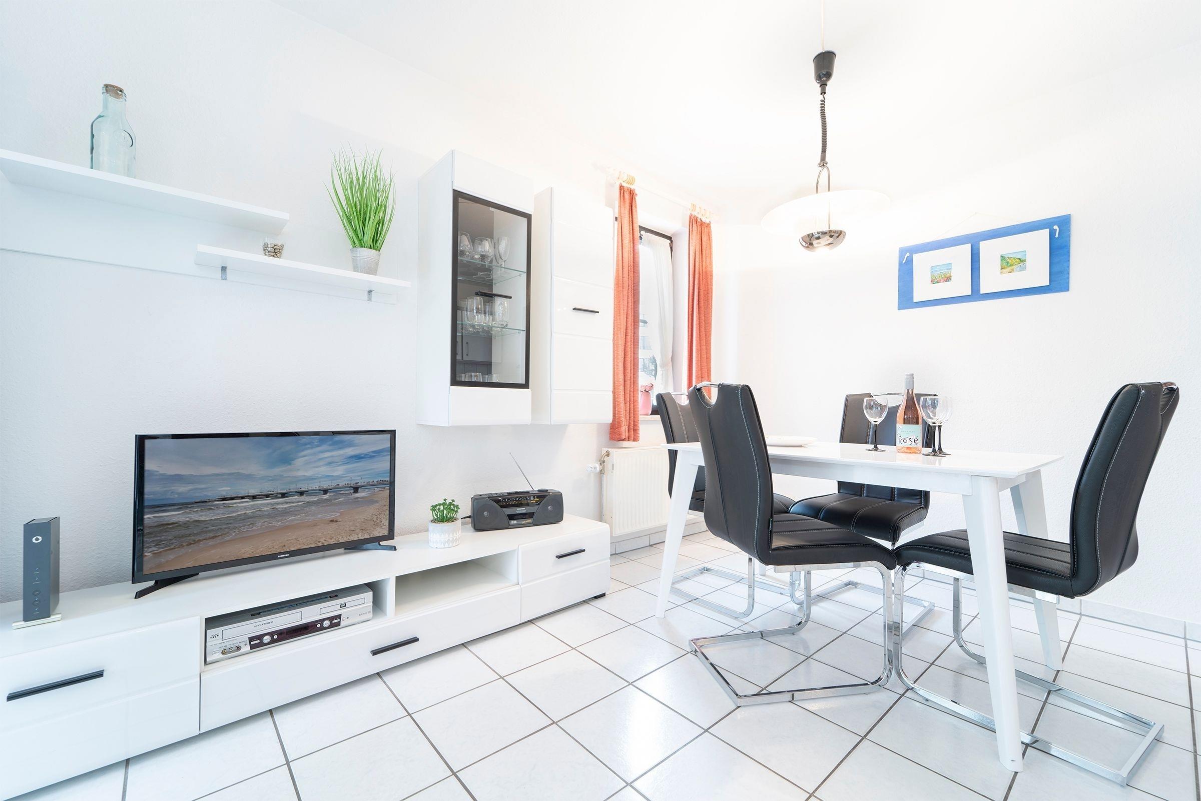 Durch einen kleinen Flur betreten Sie den Wohnraum mit integrierter, offener Küche. Mit der gemütlichen Couch, dem Flachbildfernseher, DVD-Player, dem WLAN-Anschluss und dem großzügigen Esstisch haben Sie viele Möglichkeiten Ihren Urlaub bunt zu gestalten. In der überschaubaren Küche mit 2-Plattenherd, Kühlschrank mit Gefrierfach, Kaffeemaschine, Wasserkocher und Toaster können Sie sich kleine Mahlzeiten zaubern. Auf einer kleinen möblierten Terrasse können Sie die frische Ostseeluft schnuppern. Zur Nachtruhe ziehen Sie sich in das separate Hauptschlafzimmer mit Doppelbett (2x 90x200 cm) und großem Kleiderschrank zurück. Ein zweites Schlafzimmer für einen dritten Urlaubsgast lädt mit einem Einzelbett (90x200 cm) zum Träumen ein. Nach einer Dusche im hellgefliesten Bad können Sie dynamisch in den Urlaubstag starten.