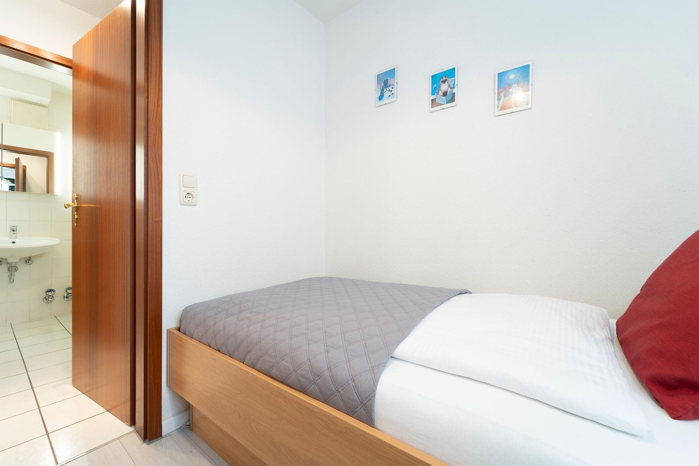 Schlafzimmer 2: 1 Einzelbett (90x200 cm), Kleiderschrank, Verdunkelungsmöglichkeit.