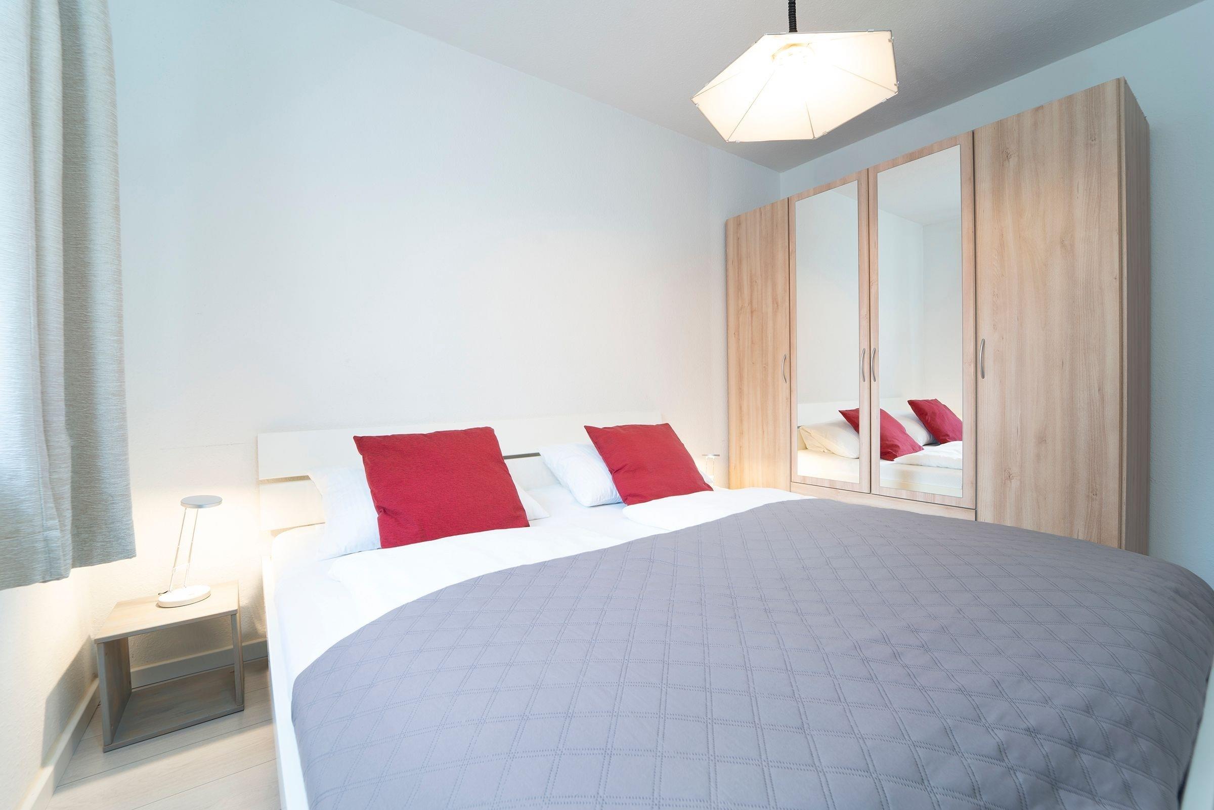 Schlafzimmer 1: 1 Doppelbett (2x 90x200 cm), Kleiderschrank, Verdunkelungsmöglichkeit.