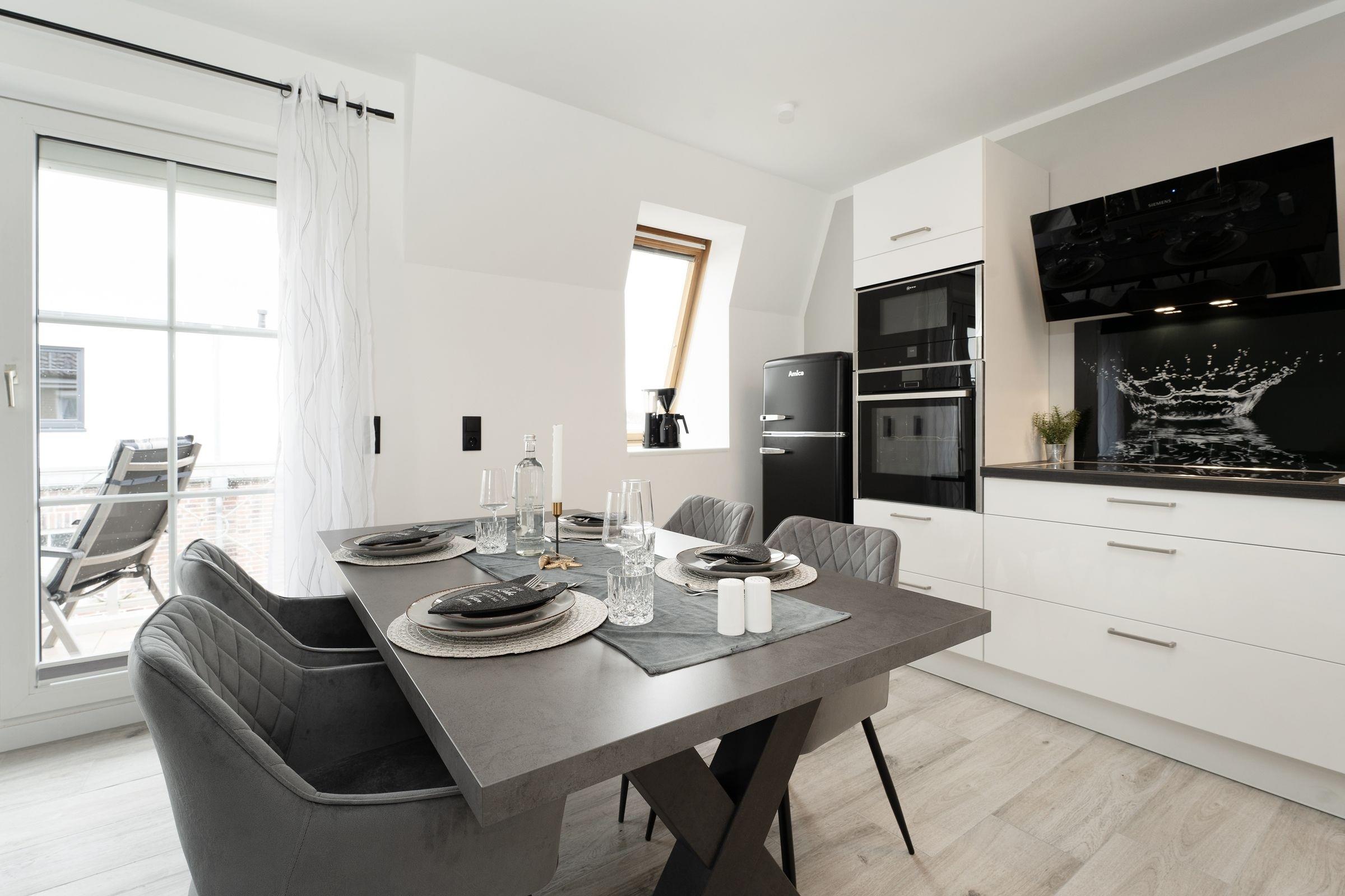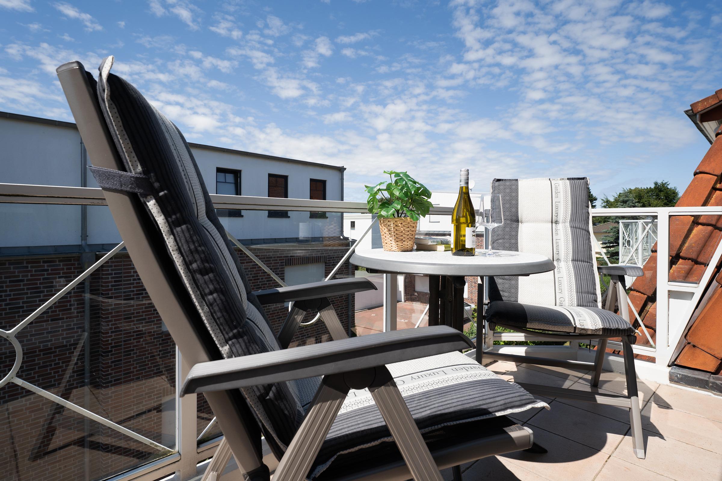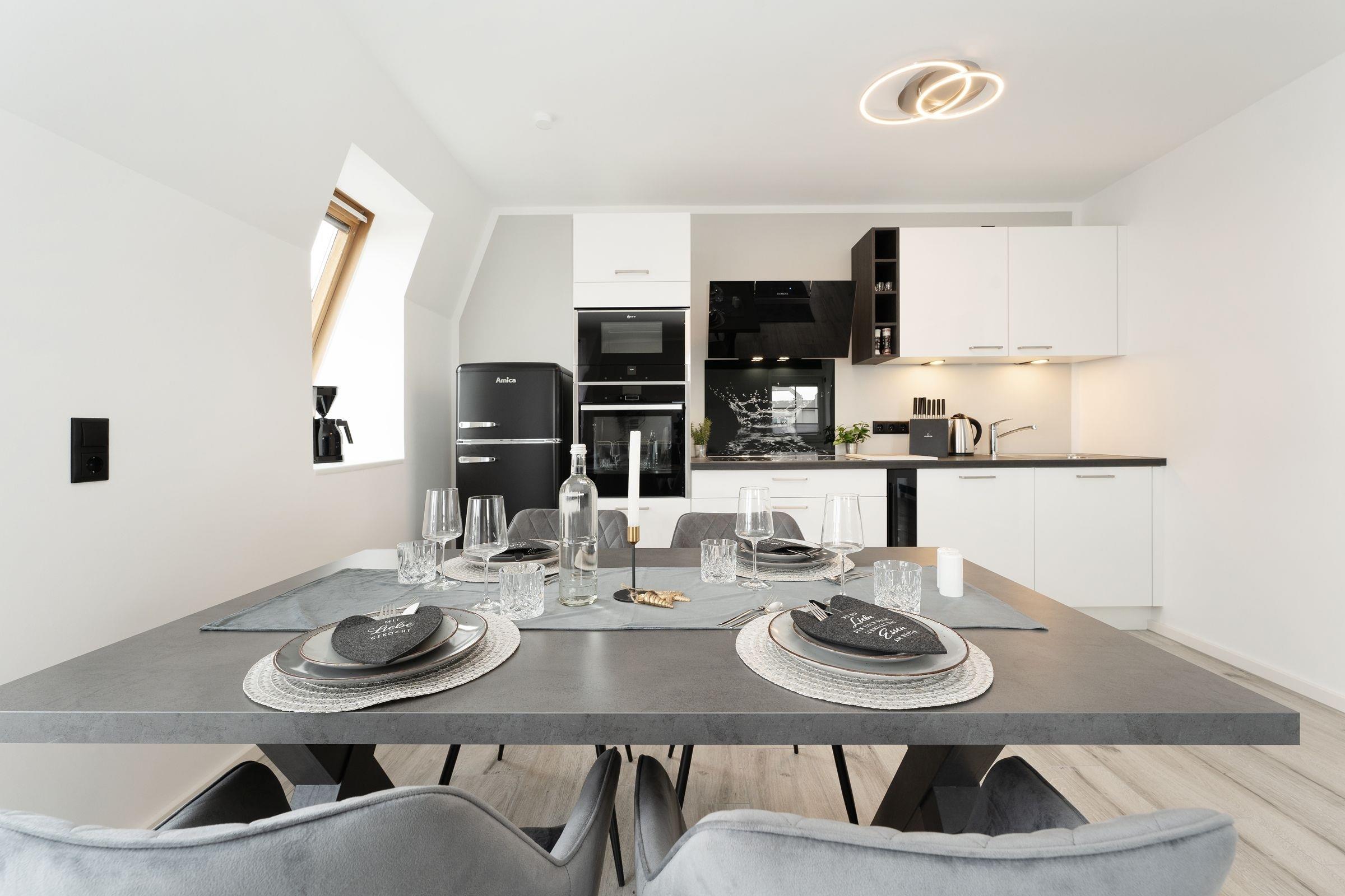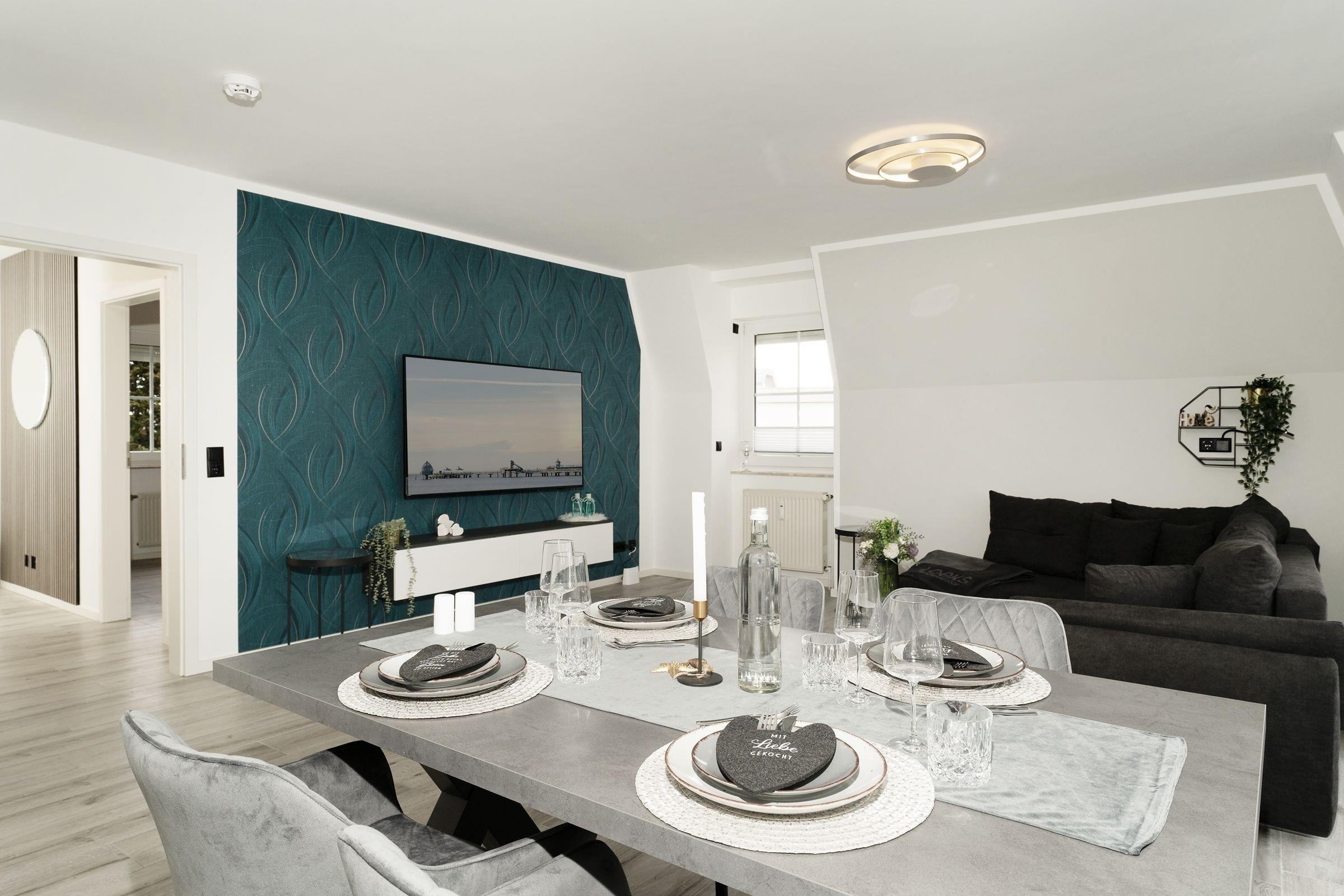 Urlaub der Extraklasse: Hier trifft Qualität auf modernen Schick – die Einrichtung der gesamten Wohnung wurde stilsicher und liebevoll ausgesucht. Vom Flur mit Garderobe und LED-Spiegel können Sie alle Räume betreten. Machen Sie es sich im lichtdurchfluteten Wohnzimmer auf der Sofalandschaft gemütlich und lassen Sie sich musikalisch von Alexa oder dem internetfähigen TV-Gerät unterhalten. Oder genießen Sie ein gutes Buch an der frischen Seeluft auf dem möblierten Balkon mit Sonnenmarkise. Die offene, hochwertig ausgestattete Küche lädt zum gemeinsamen Kochen ein. Neben Extras wie Induktionsherd und Geschirrspüler punktet die Küche mit einem Weinkühlschrank, der 7 Flaschen Ihres Lieblingsweins kühlt. Angenehm nächtigen werden Sie im rückenfreundlichen Boxspring-Doppelbett (180x200 cm) im Schlafzimmer. Zudem lässt sich das Sofa im Wohnbereich in ein komfortables Bett (150x230 cm) verwandeln. Das edle Bad überzeugt mit bodengleicher Dusche und Handtuchwärmer. Praktisch: Verbinden Sie Ihr Handy über Bluetooth mit dem Badezimmerspiegel und starten Sie mit Ihrer Lieblingsmusik in den neuen Urlaubstag.