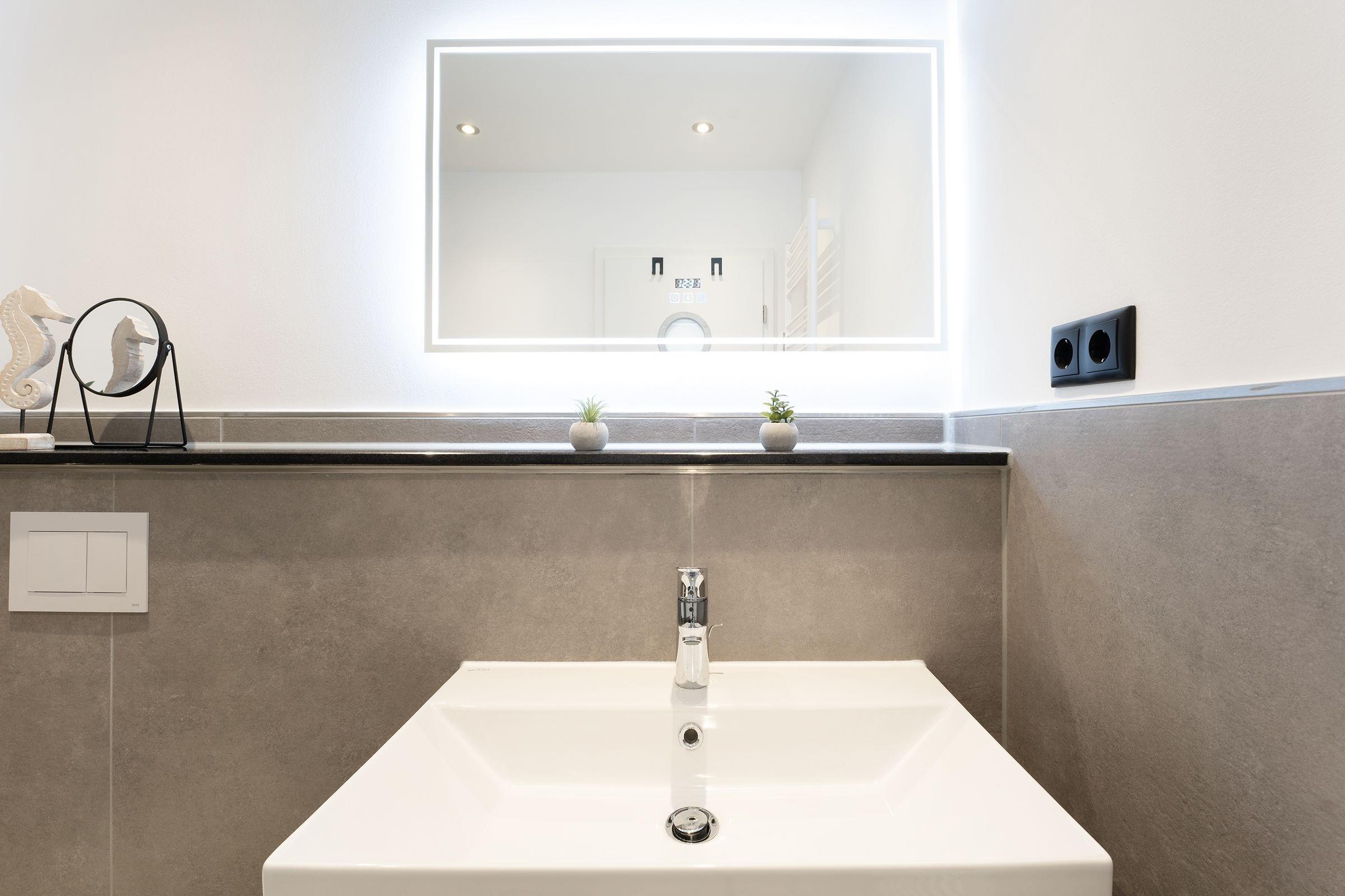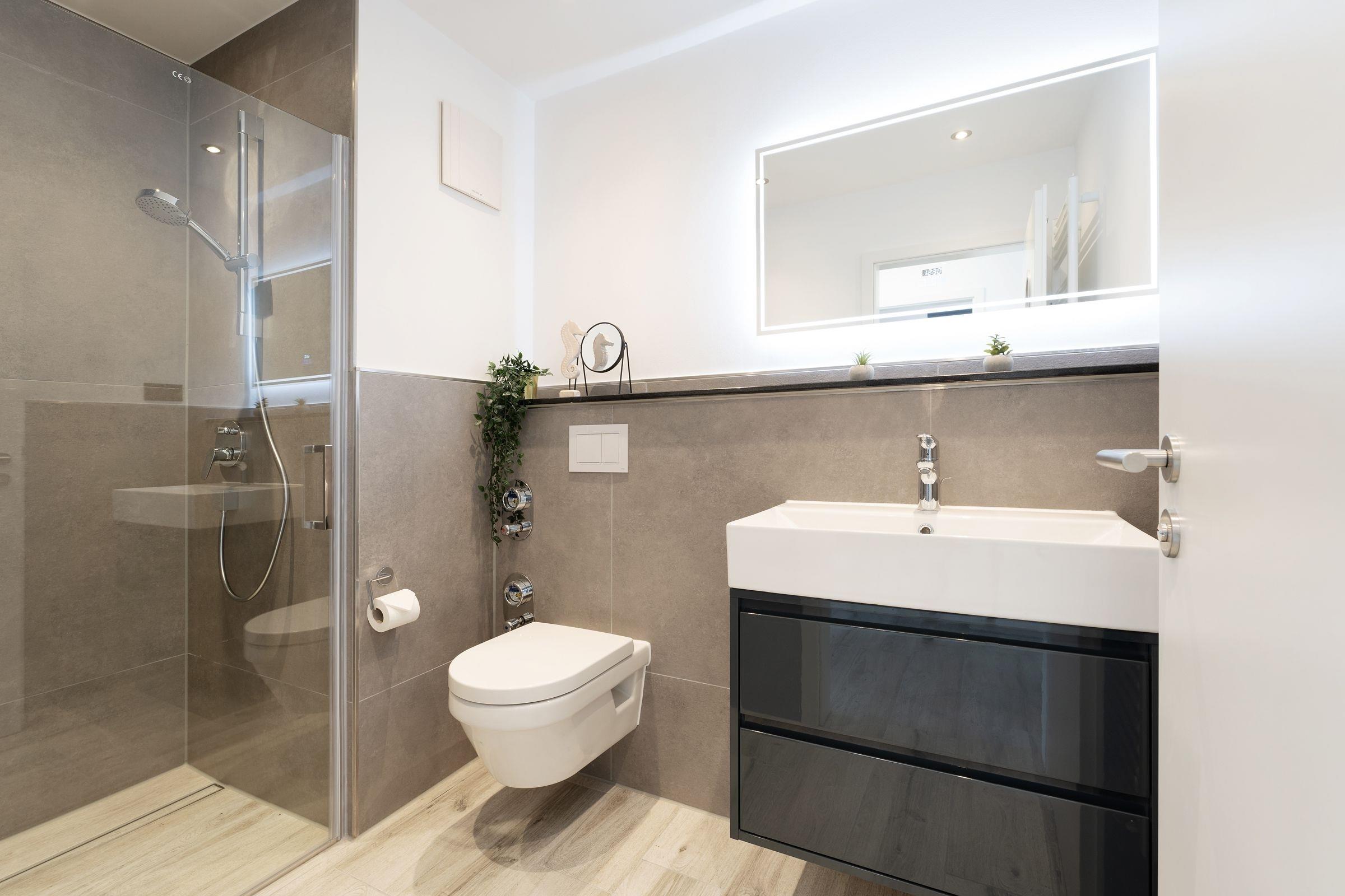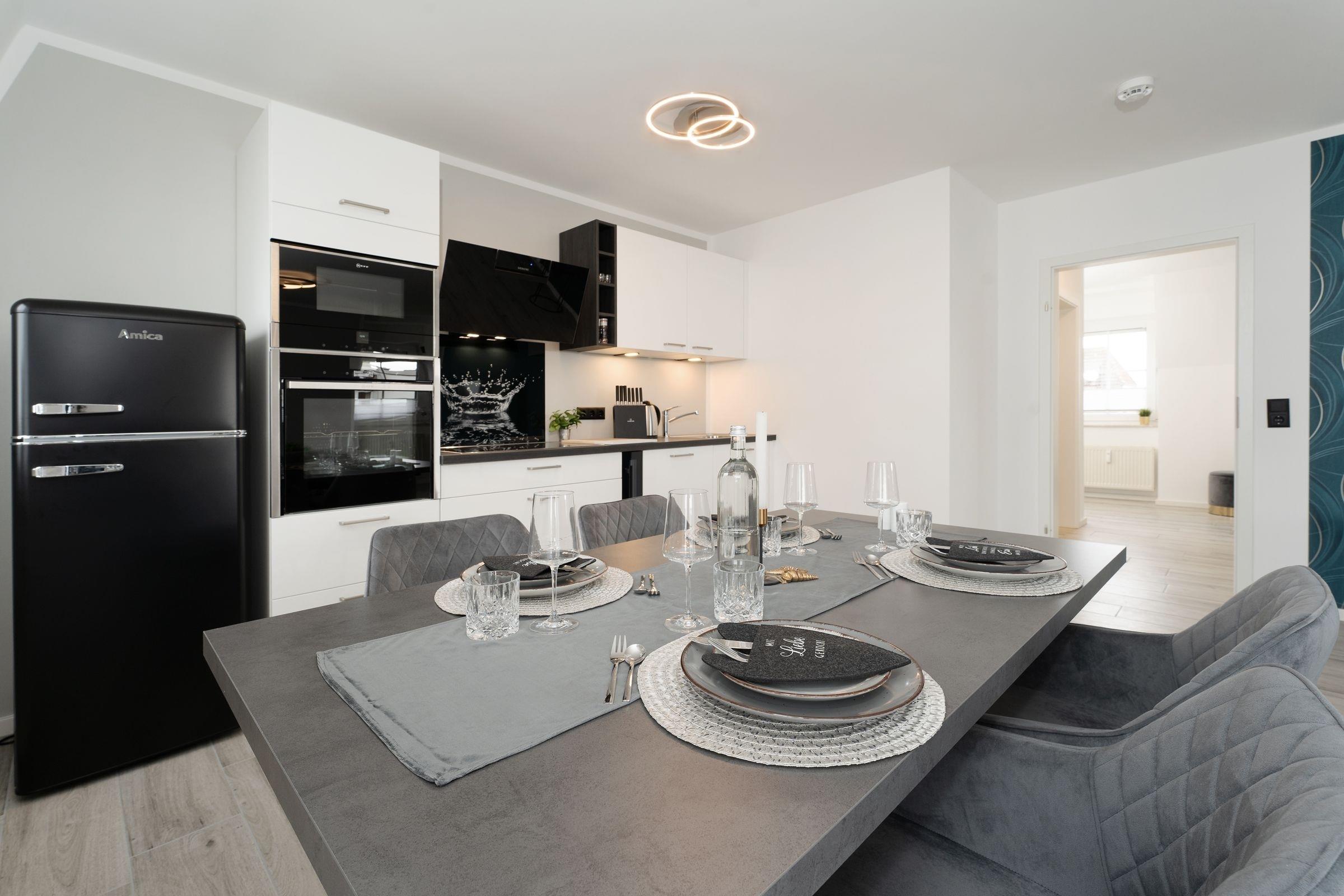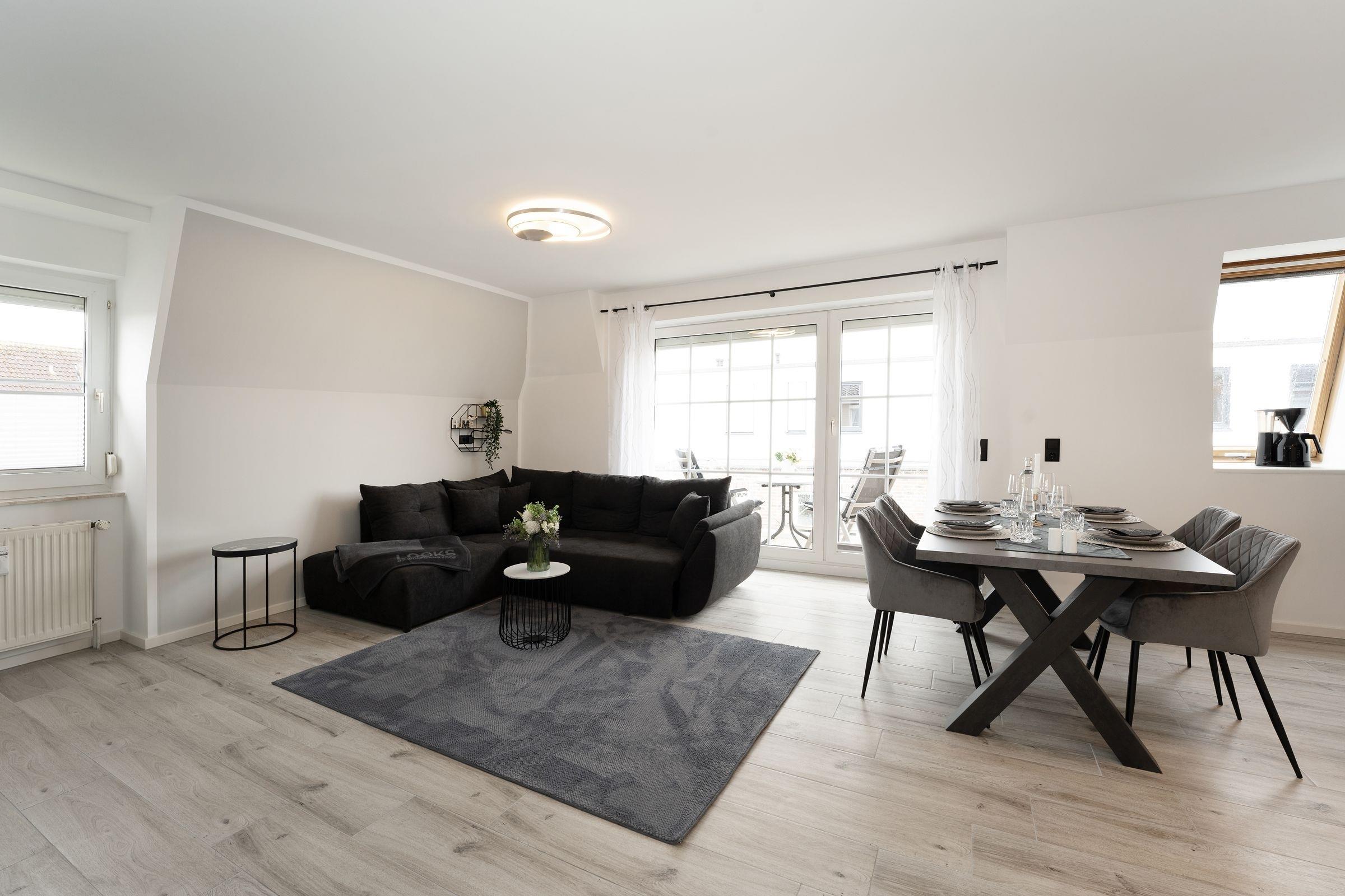 Urlaub der Extraklasse: Hier trifft Qualität auf modernen Schick – die Einrichtung der gesamten Wohnung wurde stilsicher und liebevoll ausgesucht. Vom Flur mit Garderobe und LED-Spiegel können Sie alle Räume betreten. Machen Sie es sich im lichtdurchfluteten Wohnzimmer auf der Sofalandschaft gemütlich und lassen Sie sich musikalisch von Alexa oder dem internetfähigen TV-Gerät unterhalten. Oder genießen Sie ein gutes Buch an der frischen Seeluft auf dem möblierten Balkon mit Sonnenmarkise. Die offene, hochwertig ausgestattete Küche lädt zum gemeinsamen Kochen ein. Neben Extras wie Induktionsherd und Geschirrspüler punktet die Küche mit einem Weinkühlschrank, der 7 Flaschen Ihres Lieblingsweins kühlt. Angenehm nächtigen werden Sie im rückenfreundlichen Boxspring-Doppelbett (180x200 cm) im Schlafzimmer. Zudem lässt sich das Sofa im Wohnbereich in ein komfortables Bett (150x230 cm) verwandeln. Das edle Bad überzeugt mit bodengleicher Dusche und Handtuchwärmer. Praktisch: Verbinden Sie Ihr Handy über Bluetooth mit dem Badezimmerspiegel und starten Sie mit Ihrer Lieblingsmusik in den neuen Urlaubstag.