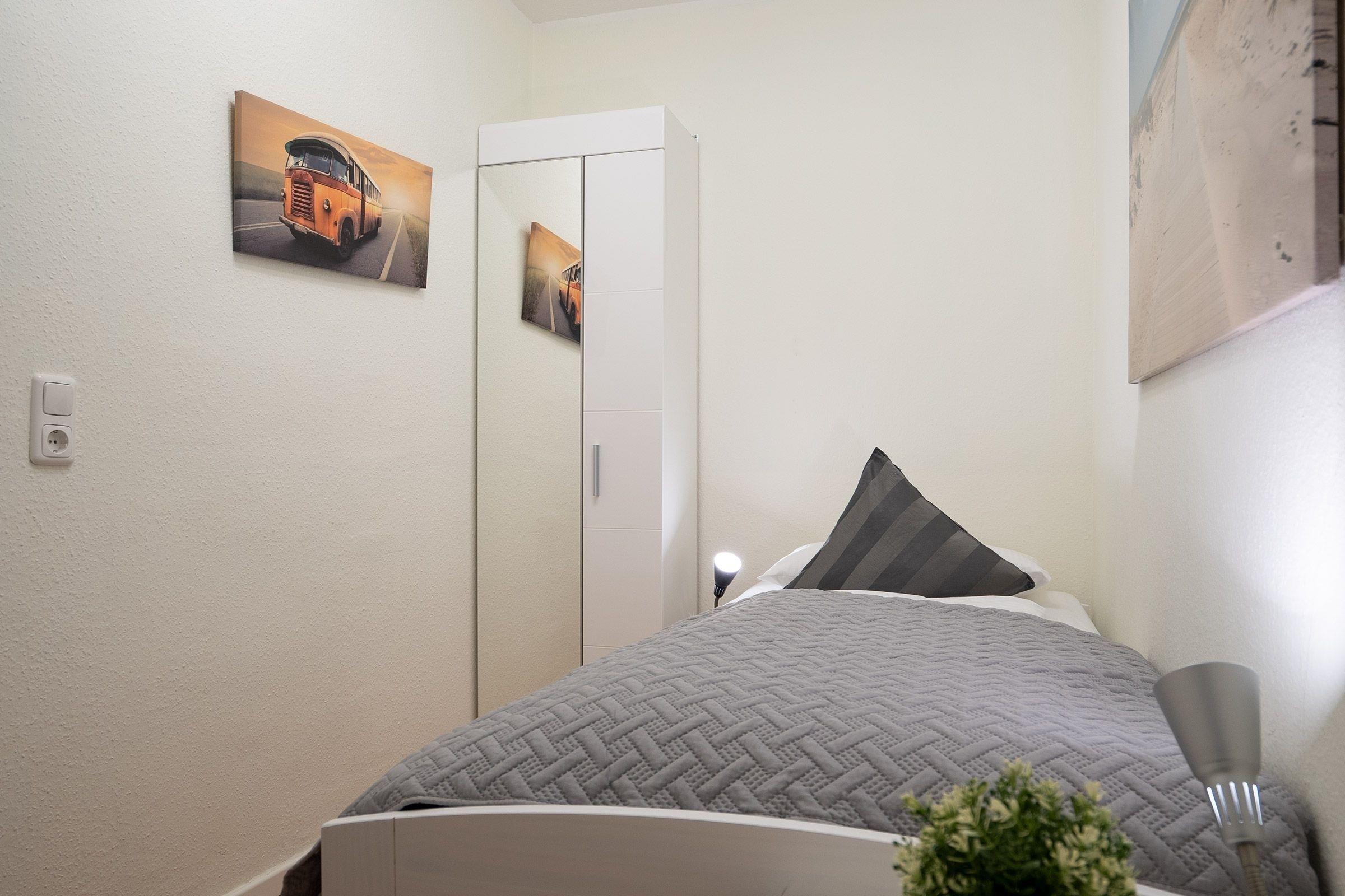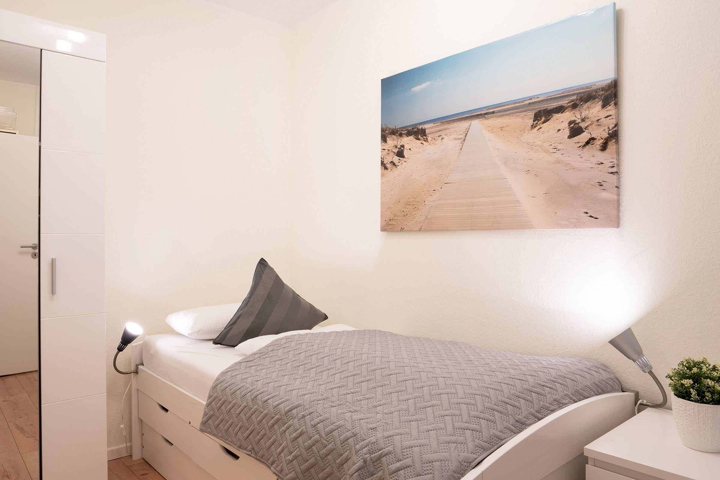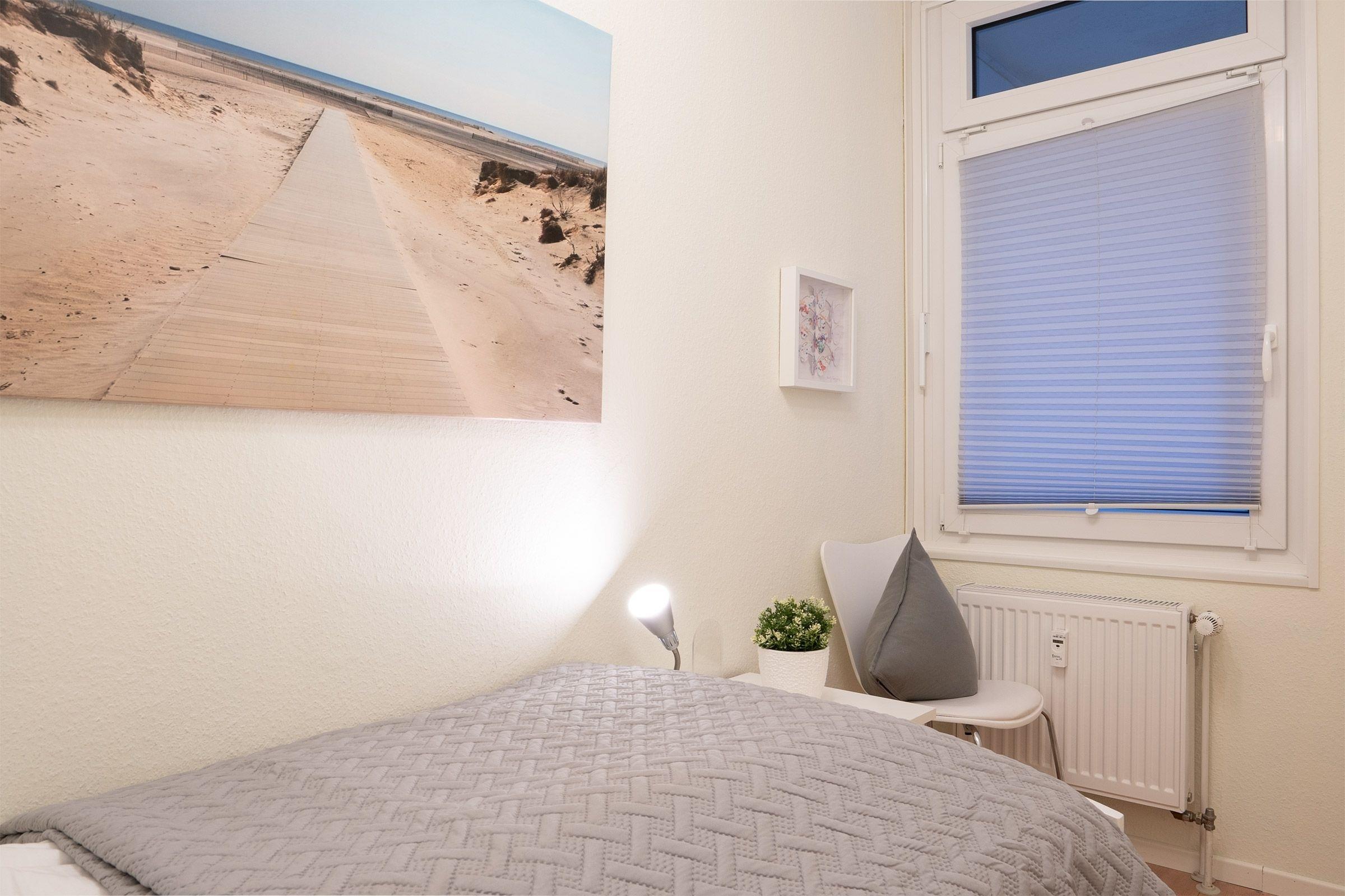 Schlafzimmer: 1 Einzelbett (90x200 cm), Verdunkelung (Plissee)