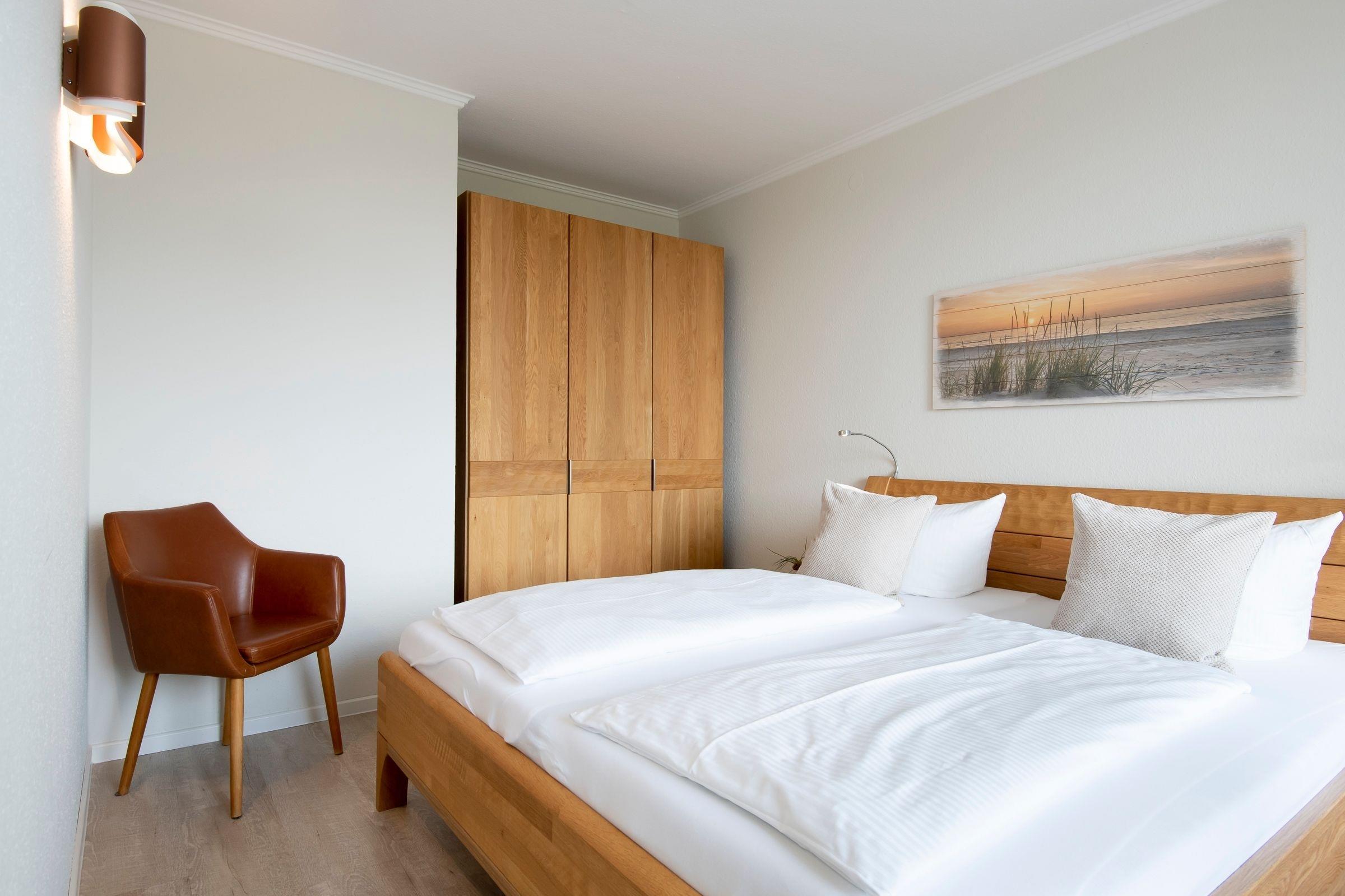 Auf ca. 45 m² Wohnfläche befinden sich das kombinierte Wohn-/Esszimmer, das Schlafzimmer mit einem Doppelbett (2x 90x200 cm) und der Balkon in Süd-Ost-Lage mit wunderschönem direkten Blick auf die Ostsee. Eine gut ausgestattete Küche, ein Bad mit Dusche und WC, ein Abstellraum sowie ein WLAN-Anschluss stehen Ihnen zur Verfügung. Das Schlafzimmer kann mit Rollläden verdunkelt werden. Die Fußböden sind gefliest bzw. mit modernen Design-Planken versehen. Für viele Stunden an der frischen Luft können alle Gäste den Gemeinschaftsgarten der Anlage nutzen.