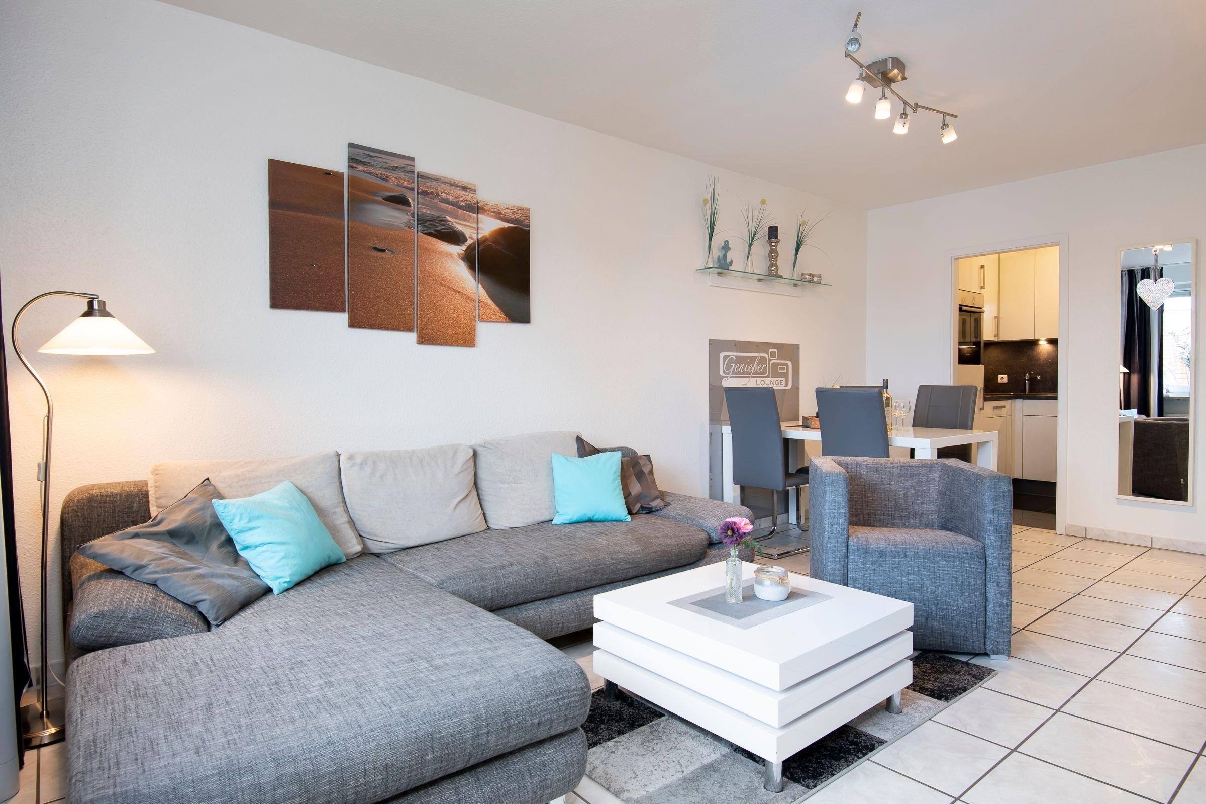 Es erwartet Sie ein modern eingerichtetes Wohnzimmer mit Eckgarnitur (als vollwertige Schlafmöglichkeit für 2 Personen schnell umzubauen ca. 130x240 cm), ein Essplatz für 4 Personen, ein 42-Zoll-Flachbildschirm, WLAN sowie eine Infotainment - Bar (Steckplatz f. i-Phone oder i-Pad, alle Geräte auch über Bluetooth). Hier bleiben keine Wünsche offen. Das Schlafzimmer ist mit einem großen Schrank, einem Doppelbett (2x 180x200 cm) und einem Flachbildschirm ausgestattet. Der Fahrstuhl und die Inneneinrichtung der Wohnung mit Duschhocker, erhöhtes WC, mobilen Handgriffen und ebenerdiger Dusche ( nur eine kleine Kante von 3 cm zum Einstieg) machen das Appartement auch für Personen mit Einschränkungen (Geh-Wagen oder Delta-Rad) interessant und ohne Probleme nutzbar. Des Weiteren gehört ein überdachter Balkon mit Südostausrichtung zur Wohnung.