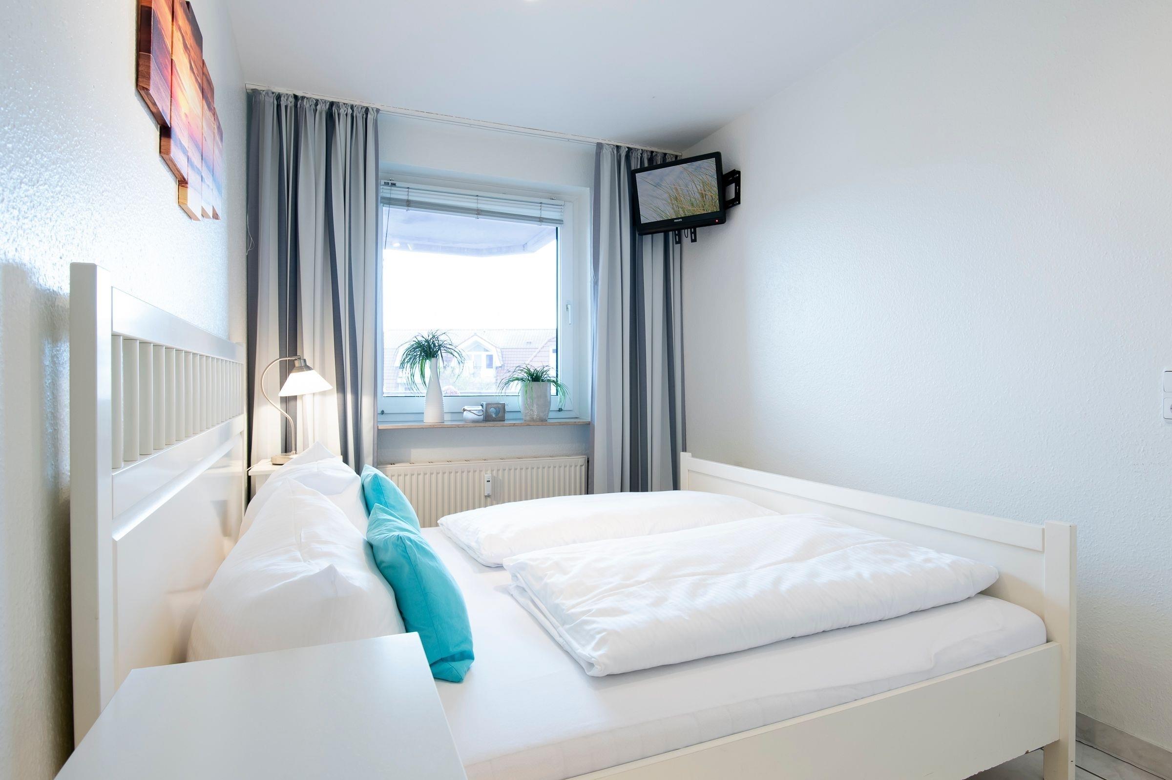 Schlafzimmer: 1 Doppelbett (180x200 cm), (Verdunklungsgardinen + Lamellenjalousien)