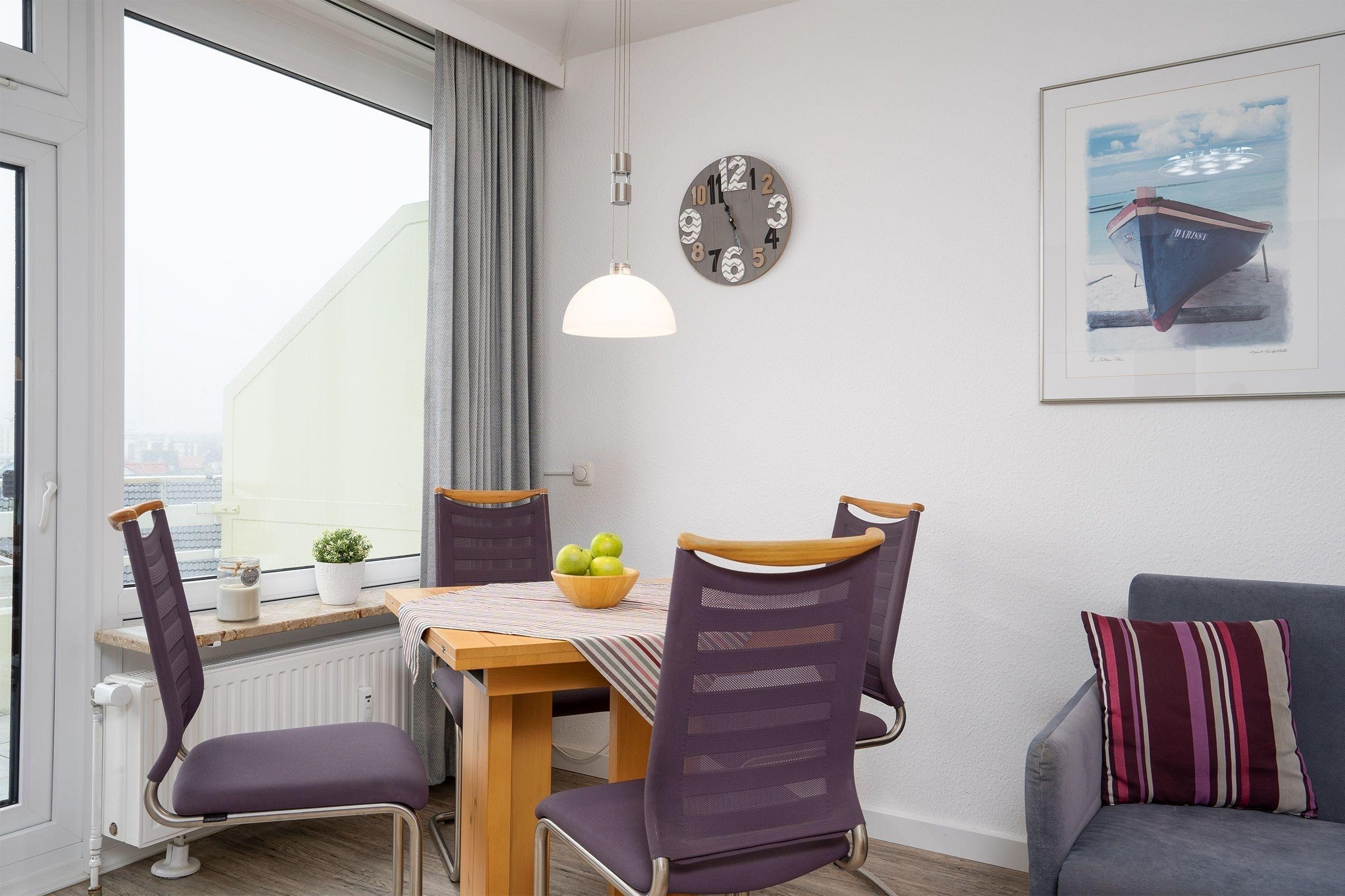 Ein geschmackvoll und gemütlich eingerichtetes Wohn-/ Esszimmer mit komfortabler Schlafcouch (in Komforthöhe, Liegefläche ca. 140x195 cm) und direktem Zugang auf den Balkon. Genießen Sie einen wunderbaren Ausblick vom möblierten und geschützten Balkon, eine ausfahrbare Markise schützt an sonnigen Tagen vor zu starker Sonneneinstrahlung.
