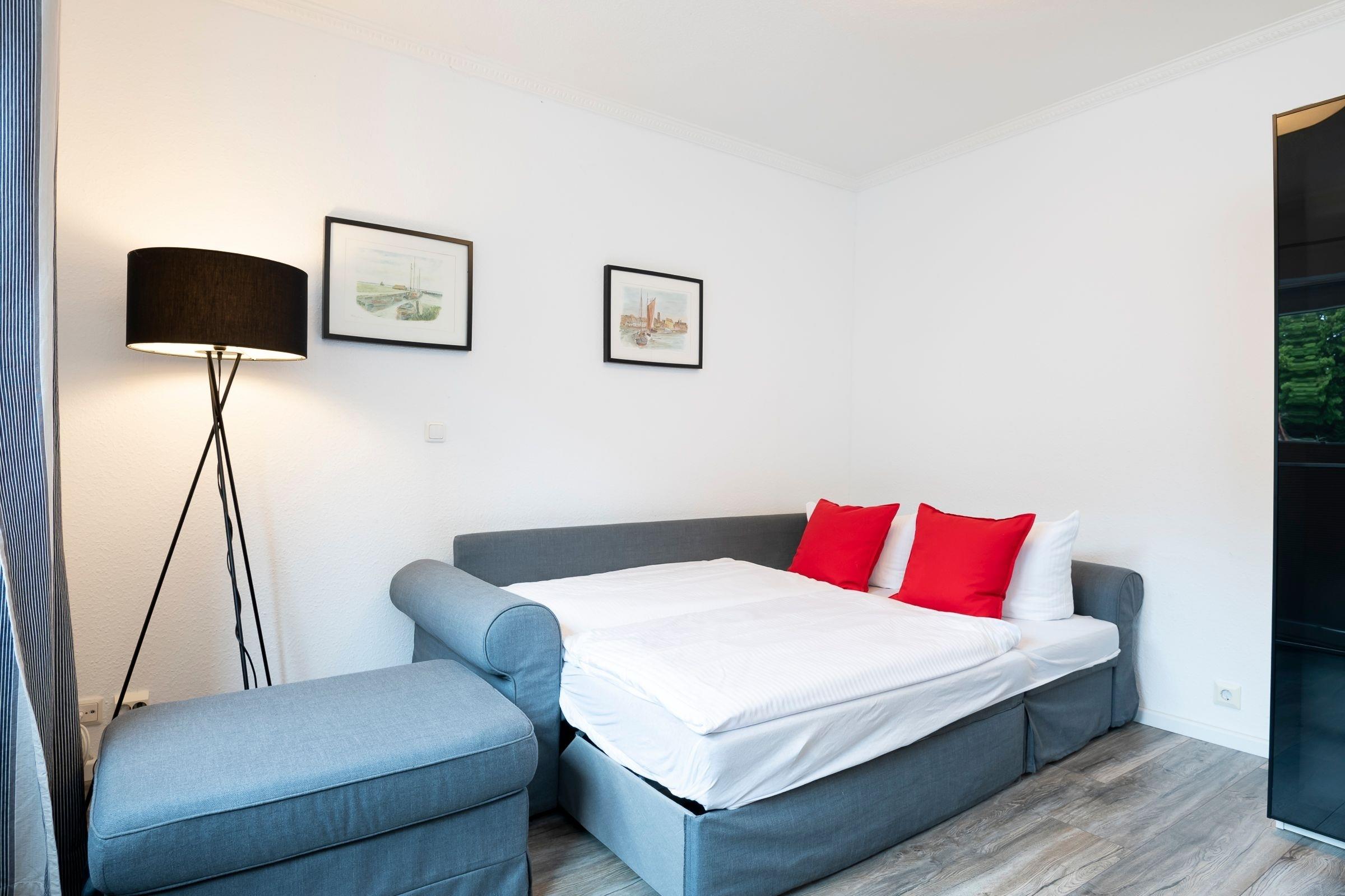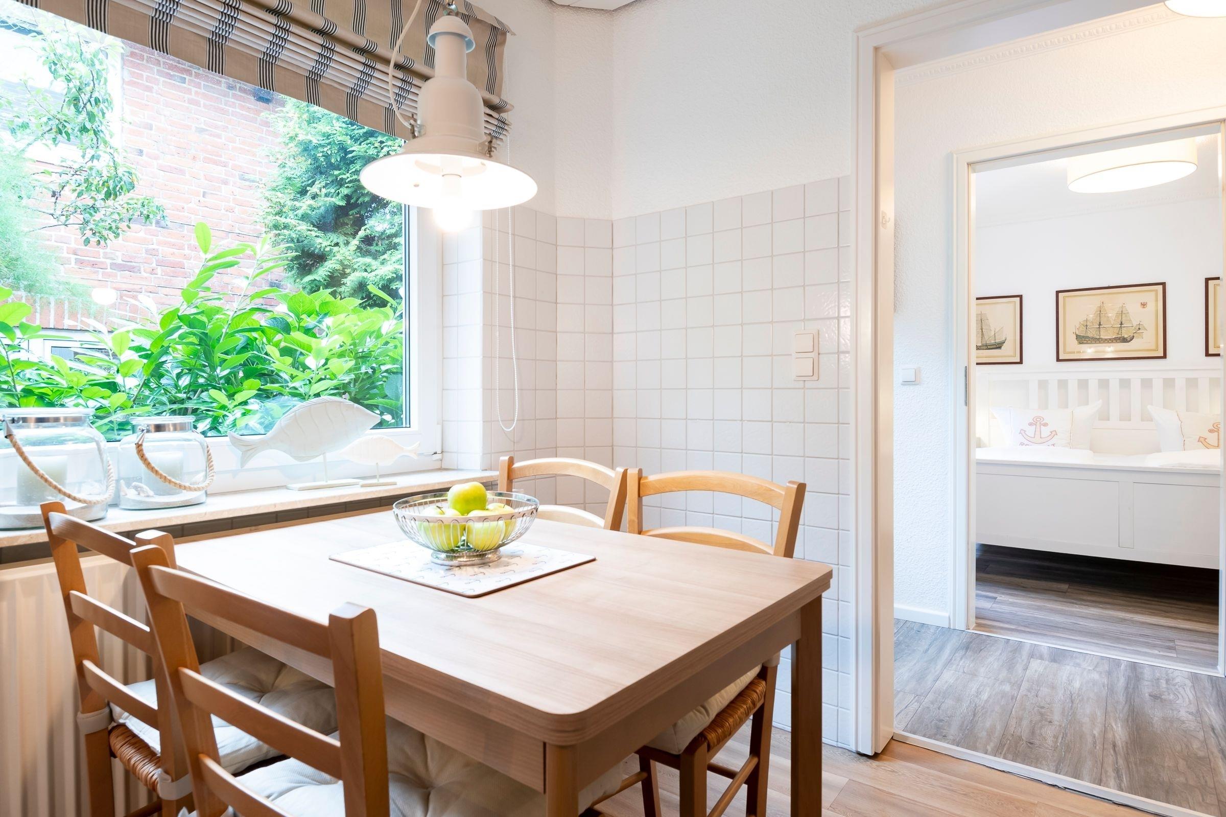 Der helle Eingangsbereich führt in alle Räume. Linkerhand liegt das separate Schlafzimmer im zeitlos schönen Landhausstil. Es liegt ruhig auf der Rückseite des Hauses und ist mit Flat-TV, komfortablem Doppelbett (2x 90x200 cm), sowie großzügigem Schiebetürenkleiderschrank für Ihre Urlaubsgarderobe ausgestattet. Rechts geht es dann in die separate, gut ausgestattete Küche mit Annehmlichkeiten wie ein neues Induktionskochfeld mit Backofen, Mikrowelle, neue Spülmaschine und Nespresso-Kaffeemaschine mit Milchaufschäumer. Ein gemütlicher Esstisch für 4 Personen sorgt für Geselligkeit und nette Runden. Geradeaus führt der Flur in das tageslichthelle Bad mit Dusche, Badewanne, Waschbecken mit beleuchtetem Spiegel und WC, herrlich großzügig gestaltet und klassisch weiß gefliest startet man hier gern in den Tag. Ihre Reisegarderobe können Sie hier in einem neu installierten Waschtrockner (Waschmaschine inklusive Trockner) reinigen.