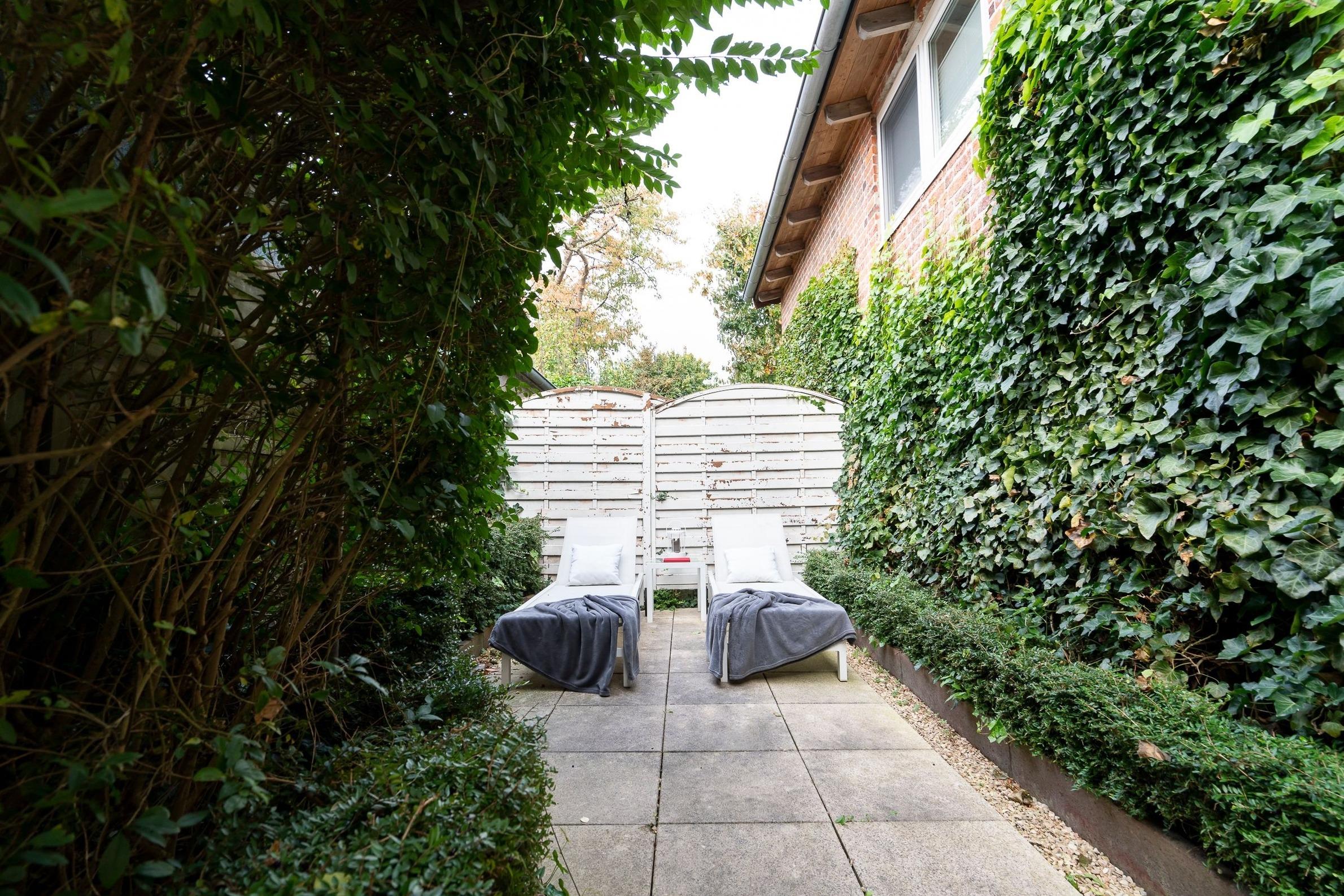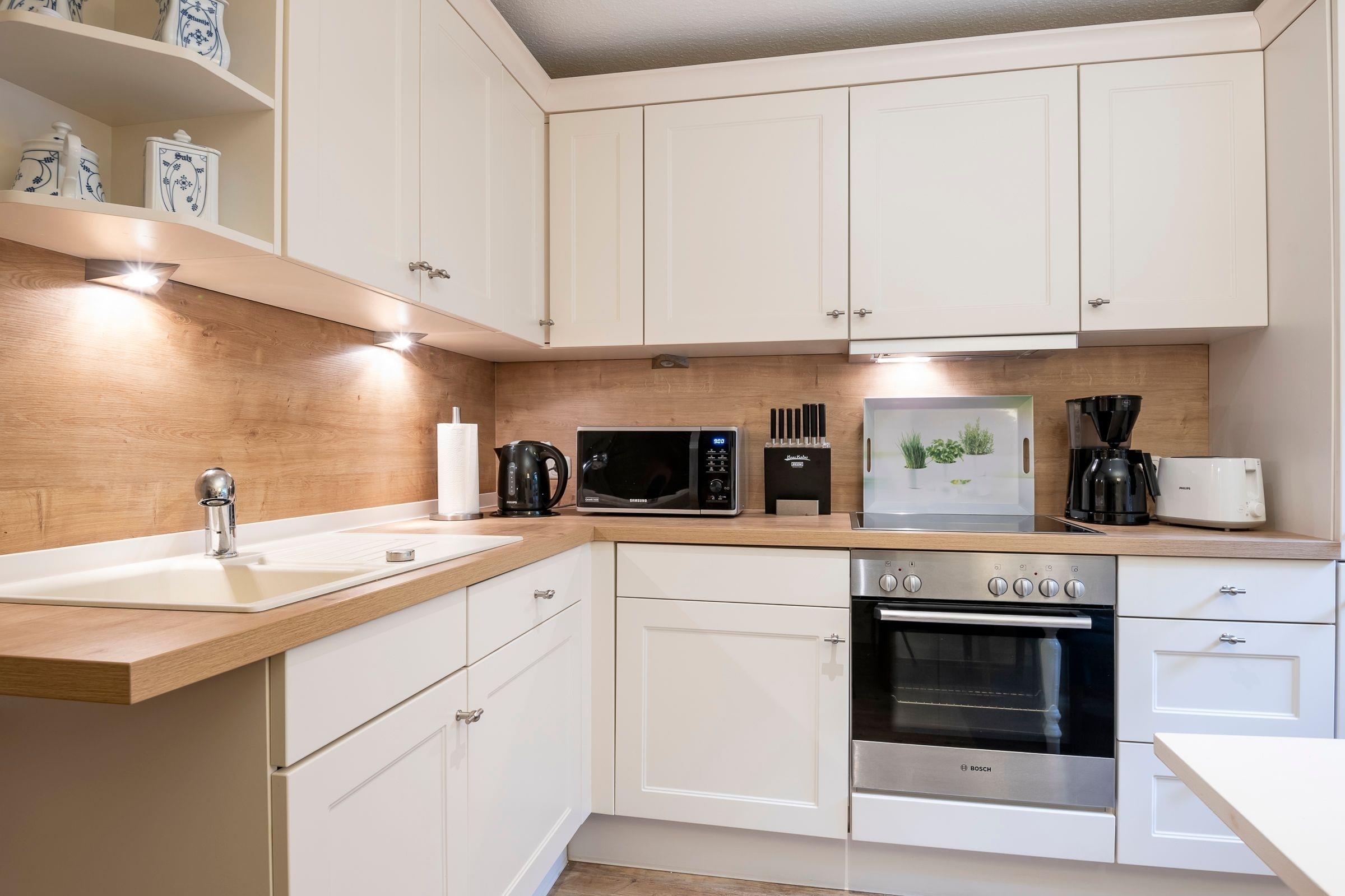 Harmonisch fügt sich das große, geschmackvolle Wohnzimmer mit Sitzlandschaft in dieses Bild ein. In der separaten modernen, hellen Küche mit einem Essplatz für bis zu 4 Personen finden Sie eine volle Ausstattung vor - Herd mit Backofen, Mikrowelle, Kühlschrank mit Gefrierfach, Spülmaschine, Nespresso-Kaffeemaschine, Wasserkocher und Toaster. Sie haben weiterhin die Möglichkeit in Ihrer eigenen Loungeecke im Außenbereich bei einem Glas Wein auf 2 bequemen Liegen den Tag ausklingen zu lassen. Ein Holzkohlegrill für schöne BBQ Abende steht ebenfalls bereit. Ein großes komfortables Boxspringbett (2x 90x200 cm) im Hauptschlafzimmer lädt zum Träumen und Entspannen ein. Das zweite Schlafzimmer bietet mit einem gemütlichen Doppelbett (2x 80x200 cm) zwei weitere Schlafmöglichkeiten. Beide Schlafzimmer sind mit verdunkelnden Plissees und Vorhängen ausgestattet. Das stilvolle Badezimmer rundet dieses Feriendomizil mit Dusche, großem Spiegel, WC und Bidet, Ablageflächen und Fön ab.