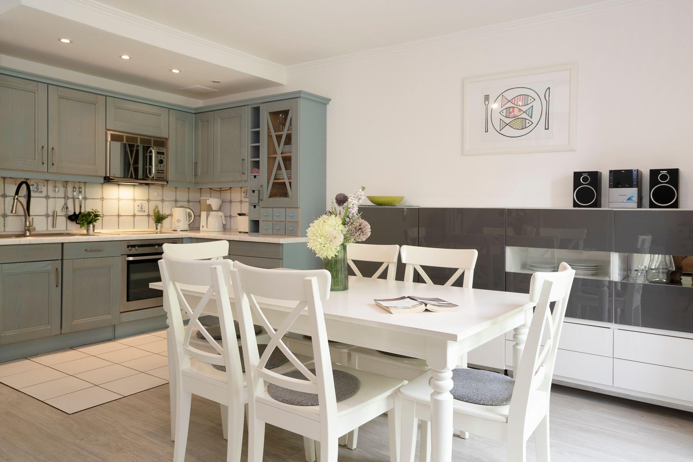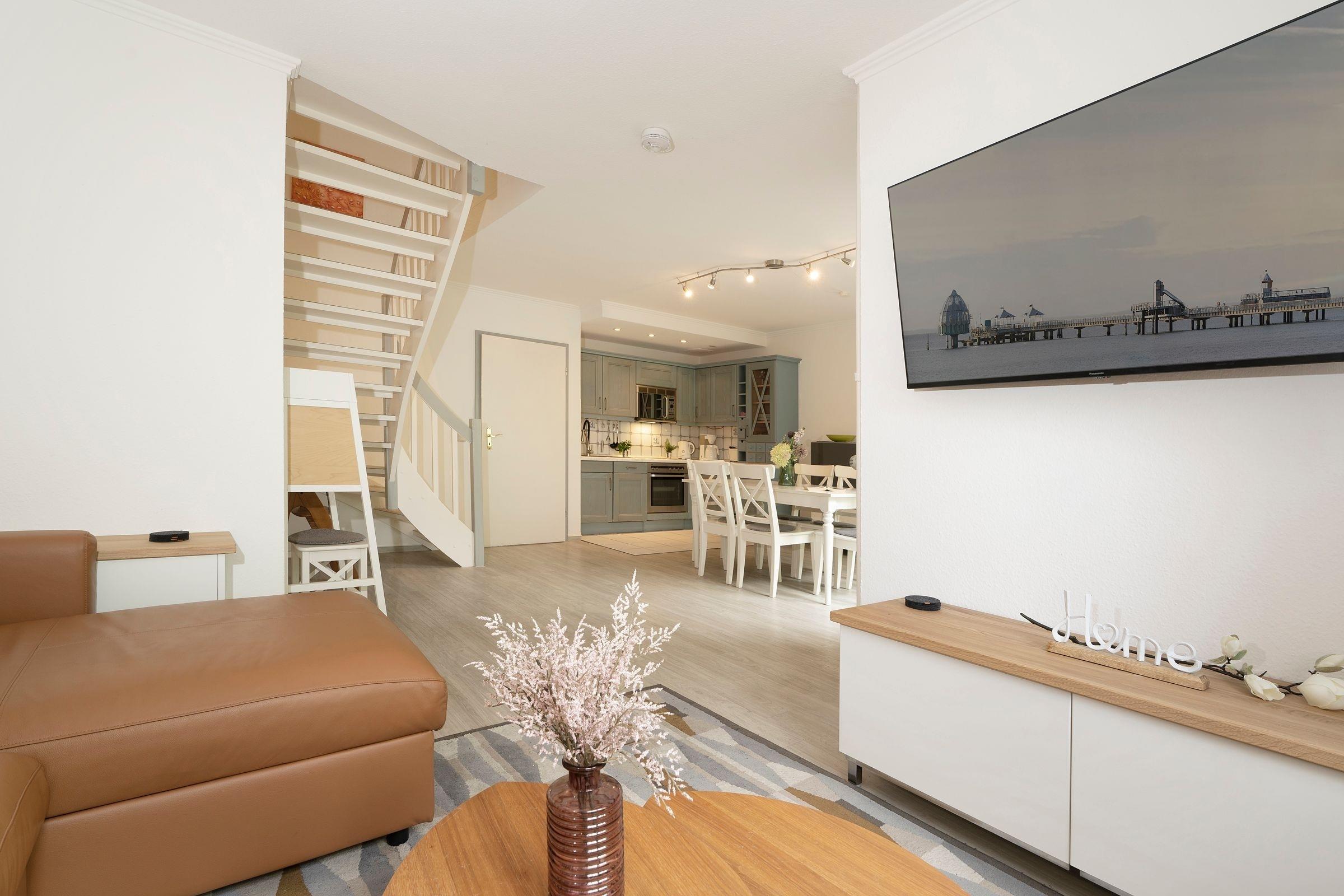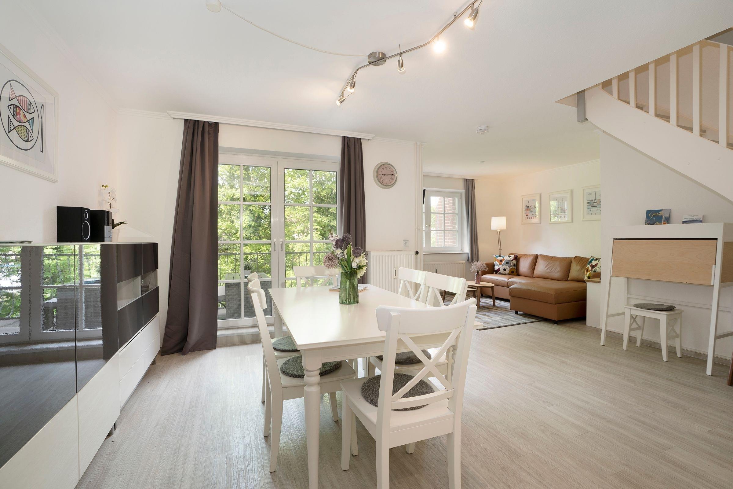 1.OG: Ein großzügiger, offen gestalteter Wohn-/ Essbereich mit Küche und Ausgang zum möblierten Balkon mit Südausrichtung bildet das Herzstück dieser Wohnung. Der klare und luftige Landhausstil im gesamten Logis verströmt eine moderne Gemütlichkeit, hier fühlt man sich einfach wohl! Im Wohnbereich sorgt ein Flachbildfernseher auch an Regentagen für gute Unterhaltung und der großzügige Essbereich ist ideal für gesellige Runden. Zudem befindet sich auf dieser Etage sowohl ein Schlafzimmer mit komfortablem Doppelbett (durchgängige Matratze 160cm x 200 cm) und verspiegeltem Kleiderschrank, als auch das Vollbad mit Badewanne, Waschtisch und WC.