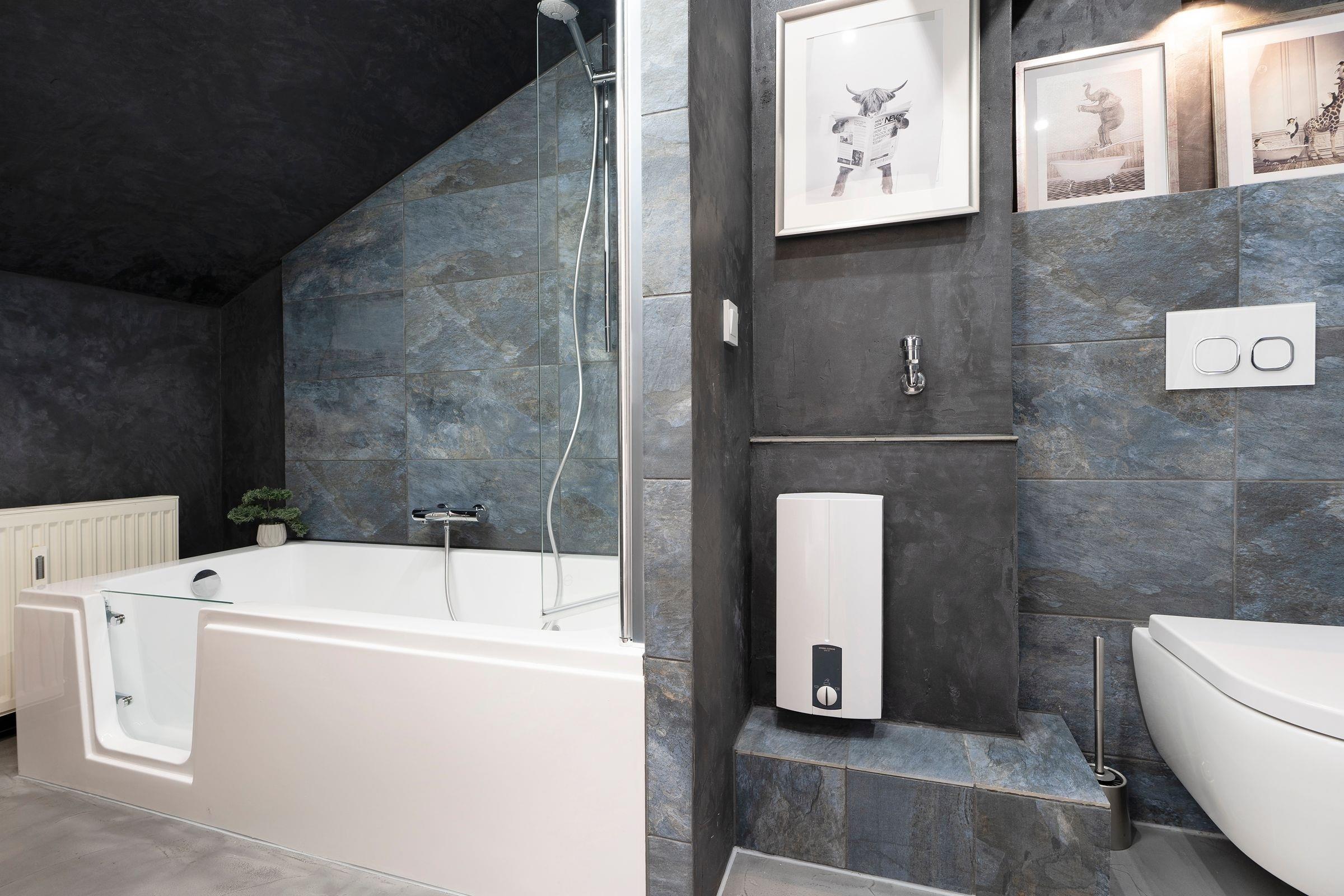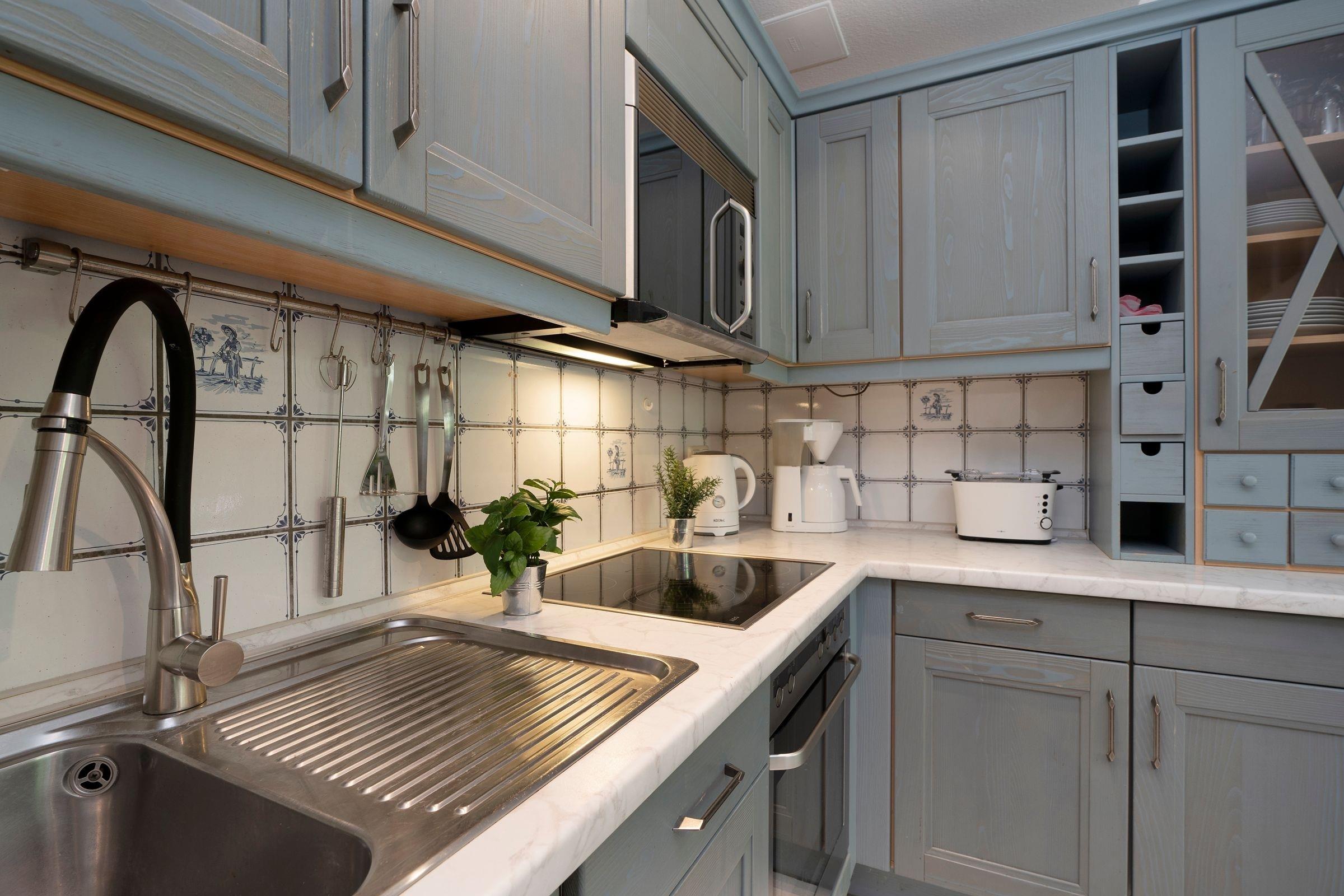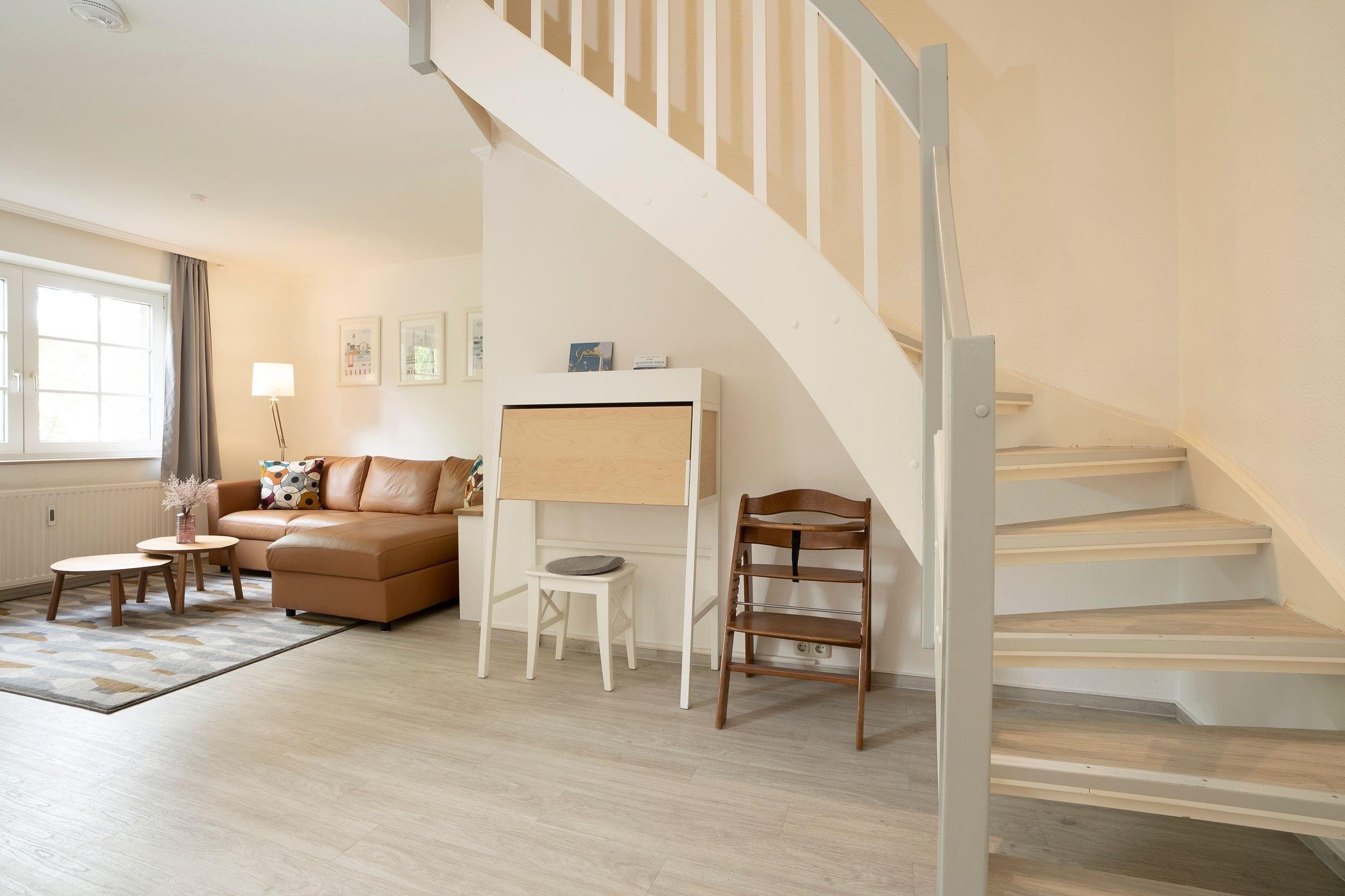1.OG: Ein großzügiger, offen gestalteter Wohn-/ Essbereich mit Küche und Ausgang zum möblierten Balkon mit Südausrichtung bildet das Herzstück dieser Wohnung. Der klare und luftige Landhausstil im gesamten Logis verströmt eine moderne Gemütlichkeit, hier fühlt man sich einfach wohl! Im Wohnbereich sorgt ein Flachbildfernseher auch an Regentagen für gute Unterhaltung und der großzügige Essbereich ist ideal für gesellige Runden. Zudem befindet sich auf dieser Etage sowohl ein Schlafzimmer mit komfortablem Doppelbett (durchgängige Matratze 160cm x 200 cm) und verspiegeltem Kleiderschrank, als auch das Vollbad mit Badewanne, Waschtisch und WC.