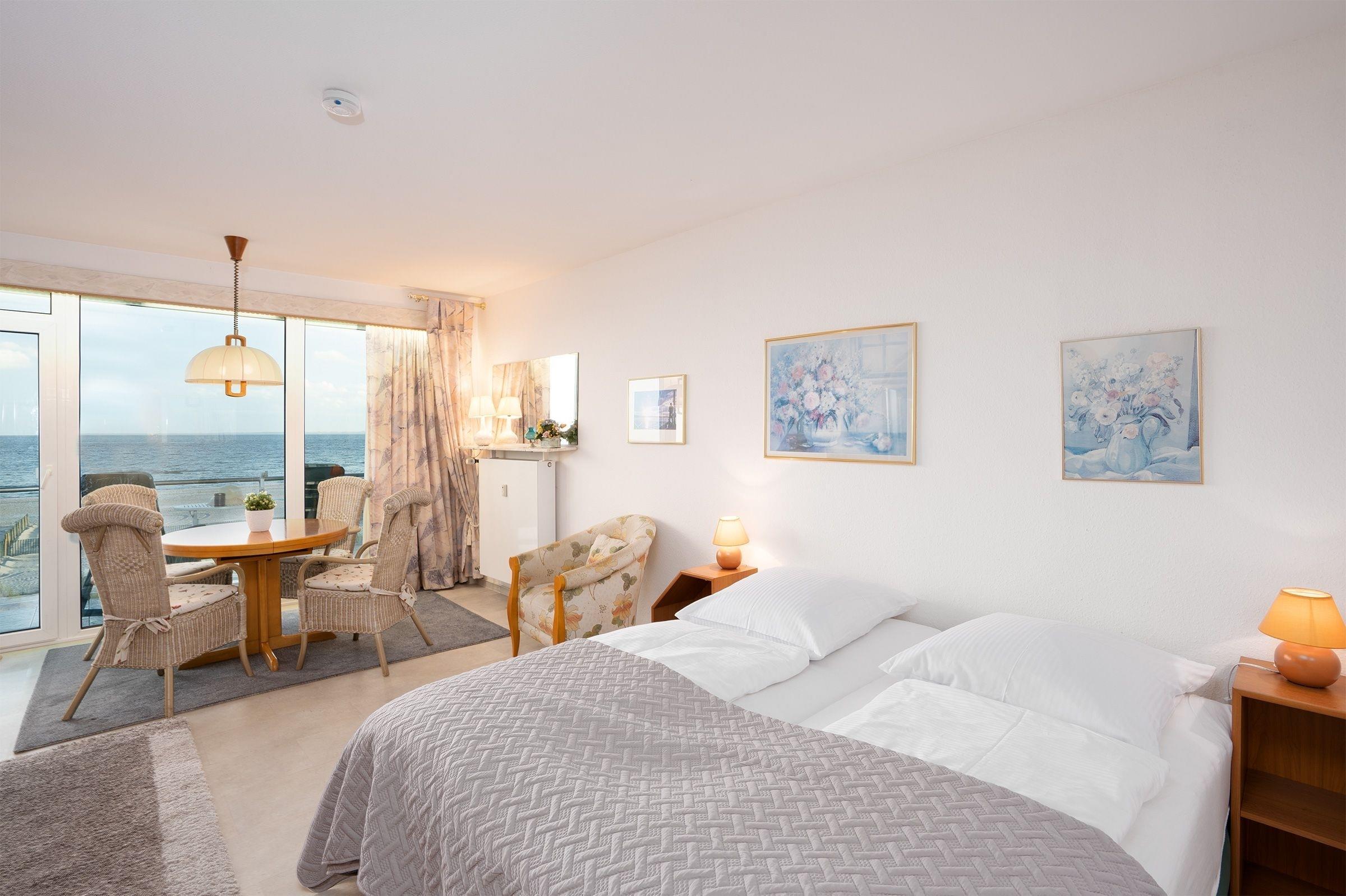 Im lichtdurchfluteten kombinierten Wohn-/Schlafraum befinden sich ein hochwertiges Doppelbett (2x 90x200 cm) und ein Essplatz für max. 2 Erwachsene und 1 Kind. Eine gut ausgestattete Küche und ein hell gefliestes Duschbad erwarten Sie. Der fantastische Panorama-Blick auf die Ostsee wird Sie begeistern.