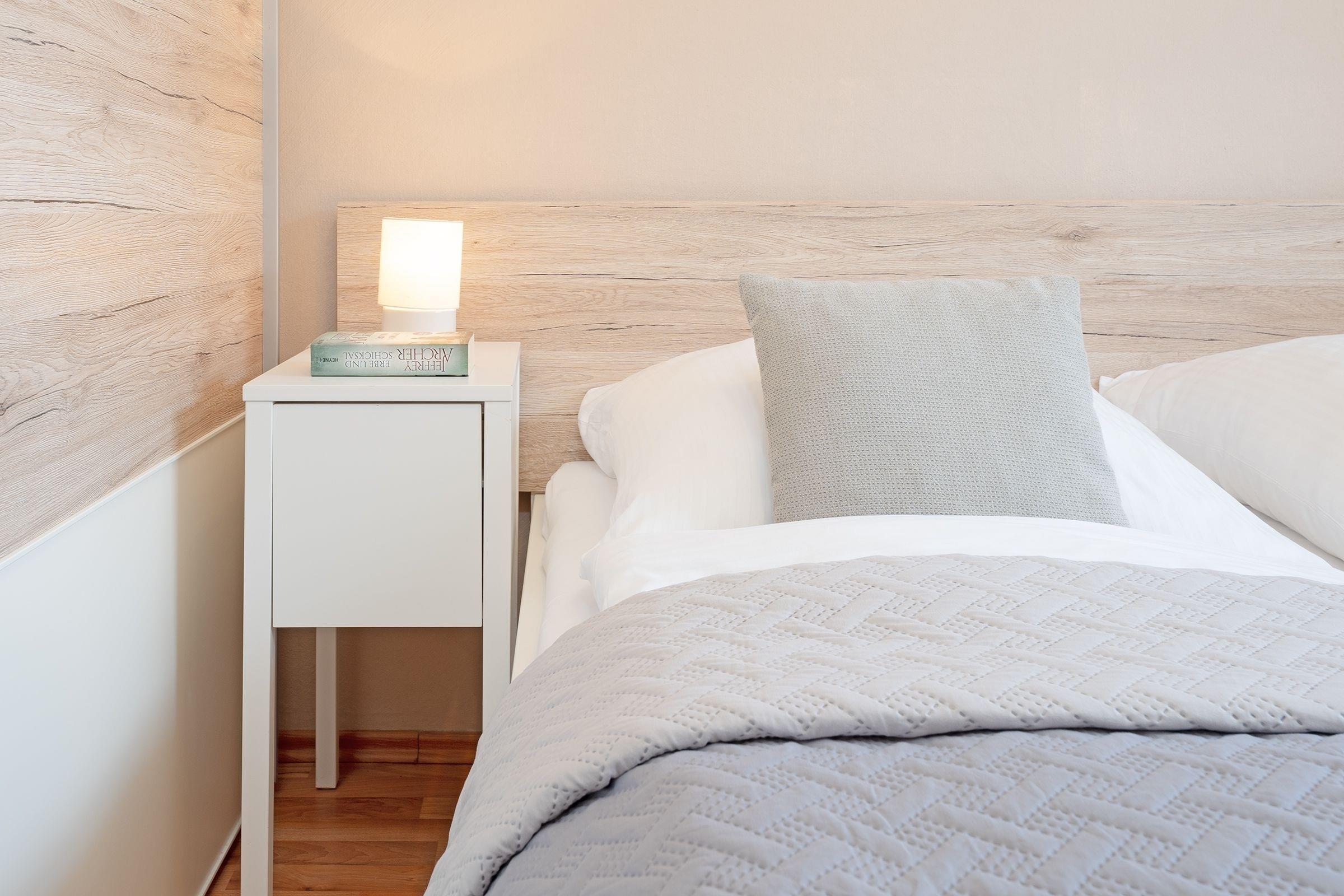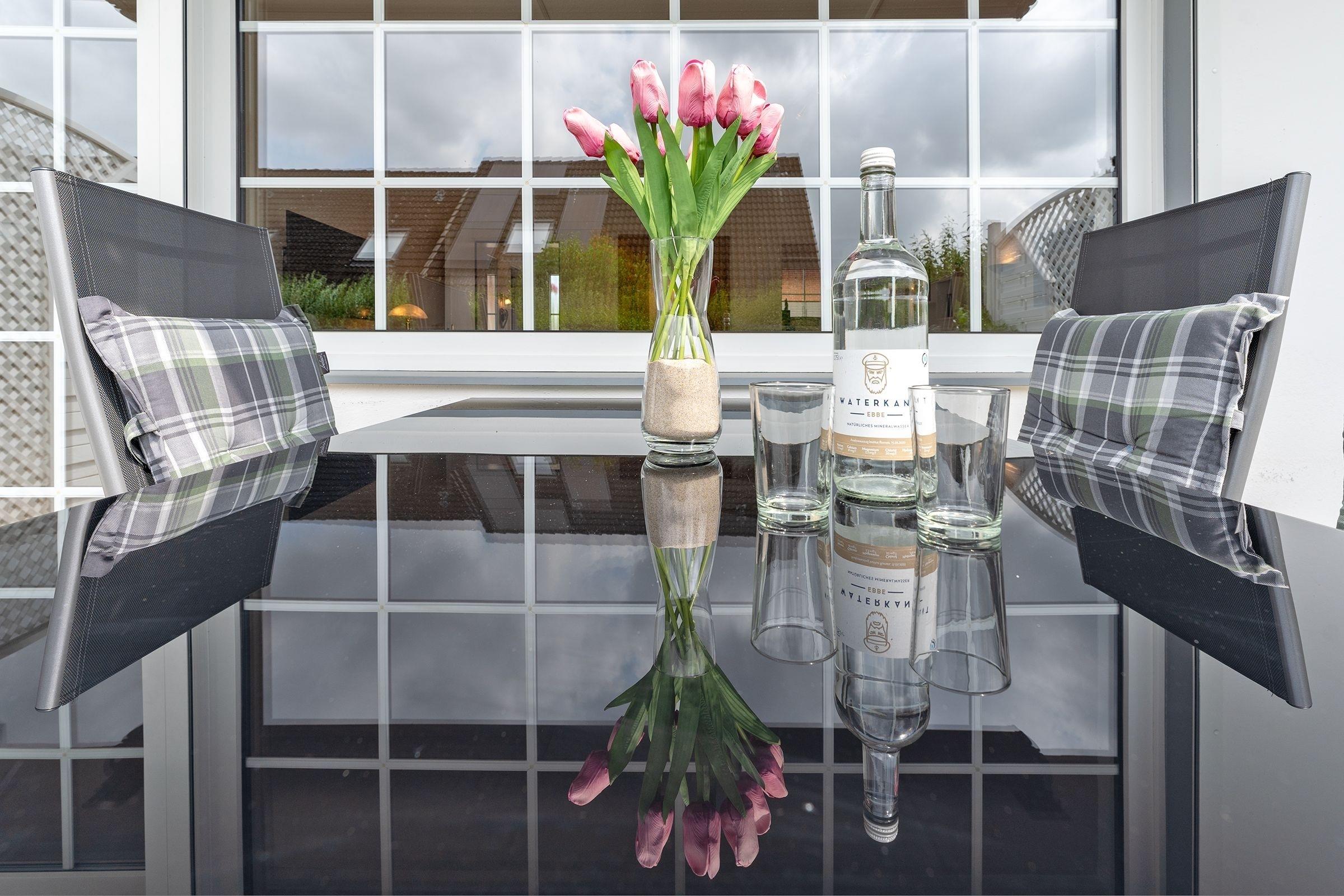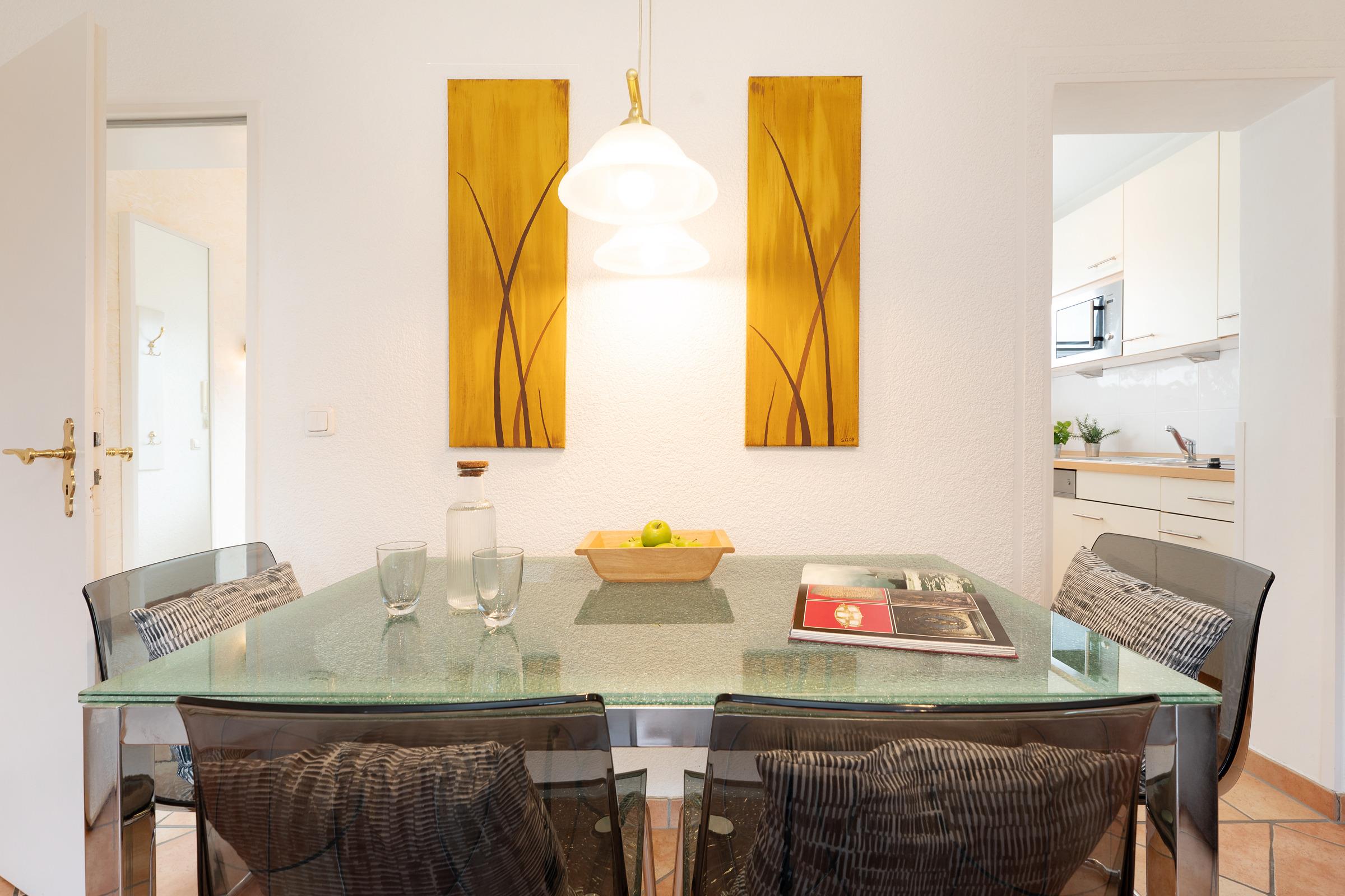 Hier bieten wir Ihnen Erholung pur auf ca. 38 m² Wohnfläche mit wunderschöner Terrasse. Im geschmackvollen Wohnbereich können Sie mit Ihrer Familie spannende Kinoabende verbringen, ein Flat-TV sorgt hier für Unterhaltung. Das große Sofa (2x 80x200 cm) kann zur Nacht in ein gemütliches Bett verwandelt werden. Am Esstisch haben Sie ausreichend Platz, um zu spielen oder gemeinsam zu essen. Ein kostenloser WLAN-Anschluss ermöglicht es Ihnen, Urlaubsfotos nach Hause zu schicken. Von hier aus gelangen Sie auch auf die schöne, möblierte Terrasse mit kleinem Garten (nicht komplett eingezäunt), auf der Sie bei einem Glas Wein erholsame Stunden verbringen können. In der separaten Küche mit 2 Platten-Ceranfeld, Mini-Backofen, Mikrowelle, Kühlschrank mit Gefrierfach und Spülmaschine wird es Ihnen auch im Urlaub Freude machen gemeinsam mit der Familie zu kochen. Im separaten Schlafzimmer mit Schiebetürenschrank lädt ein Doppelbett (2x 80x200 cm) zum Träumen ein. Das Tageslichtduschbad mit viel Stauraum rundet die Ausstattung dieser Ferienwohnung ab.