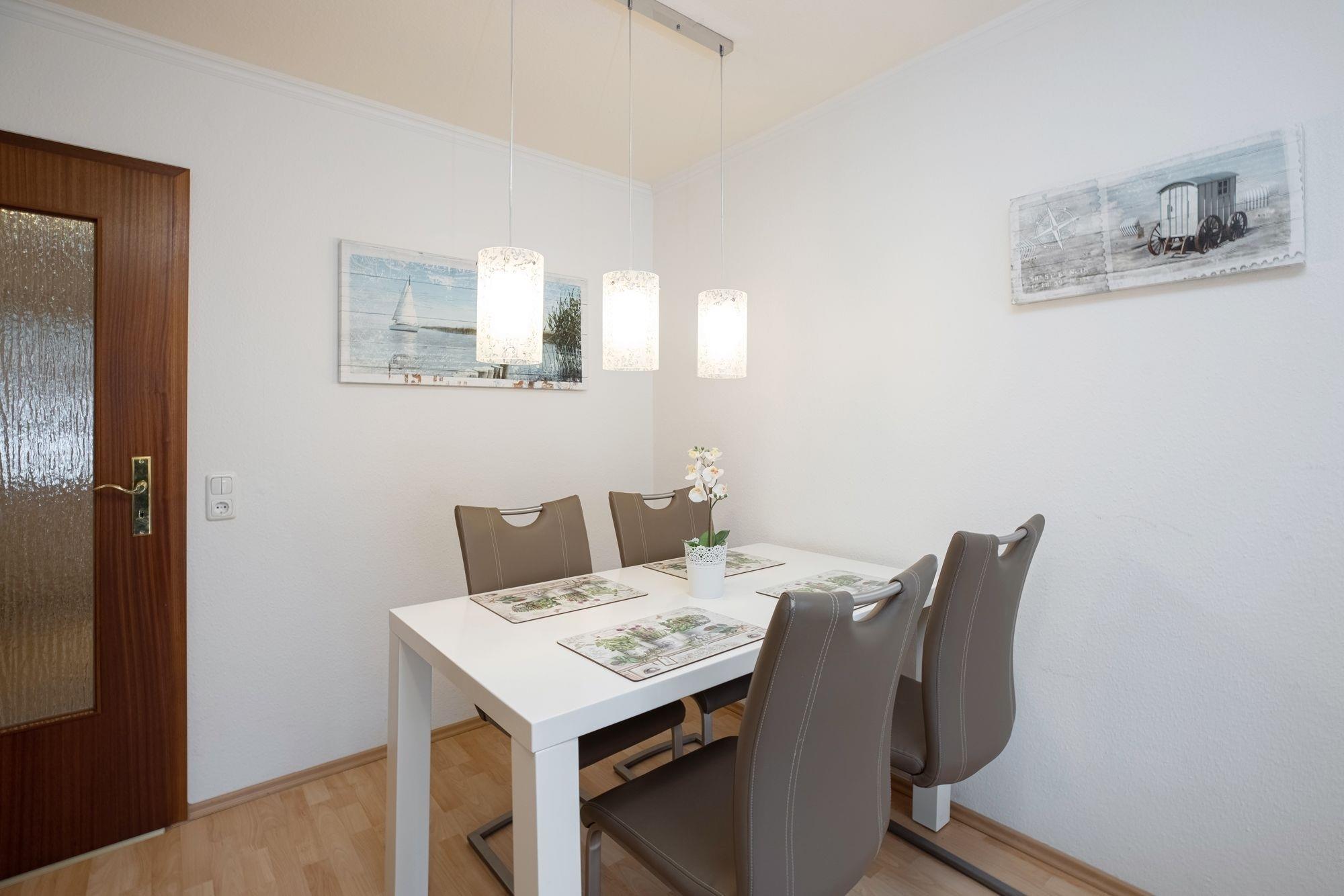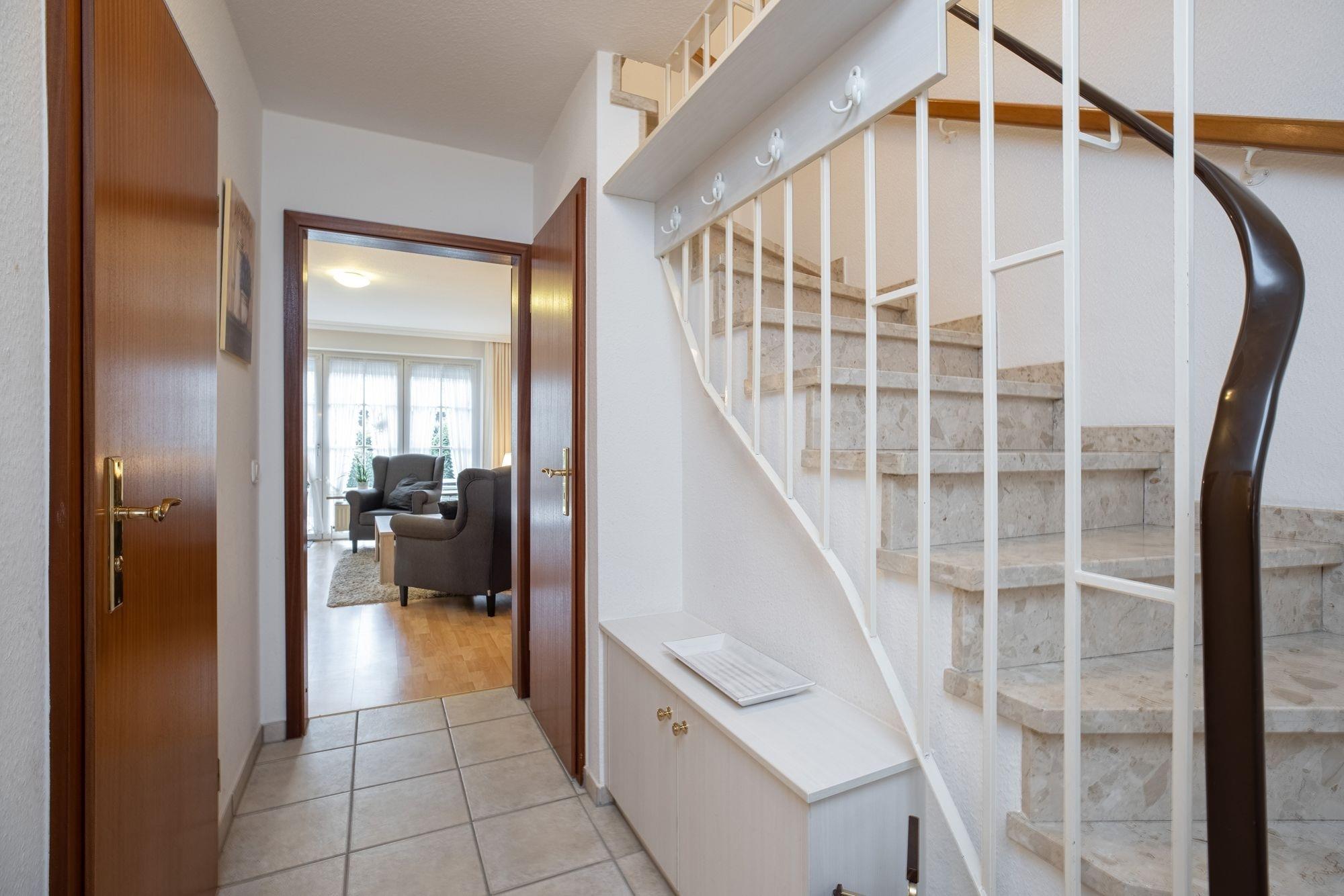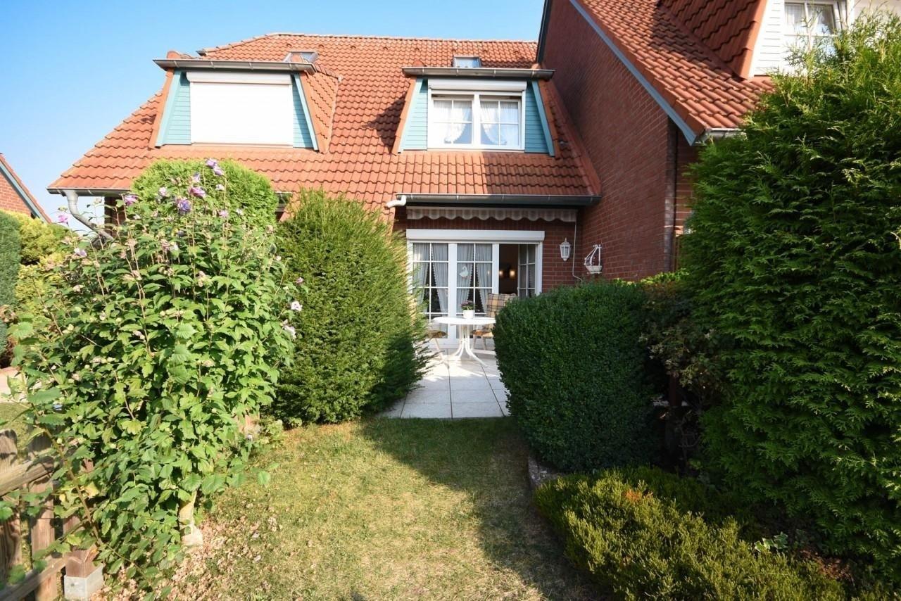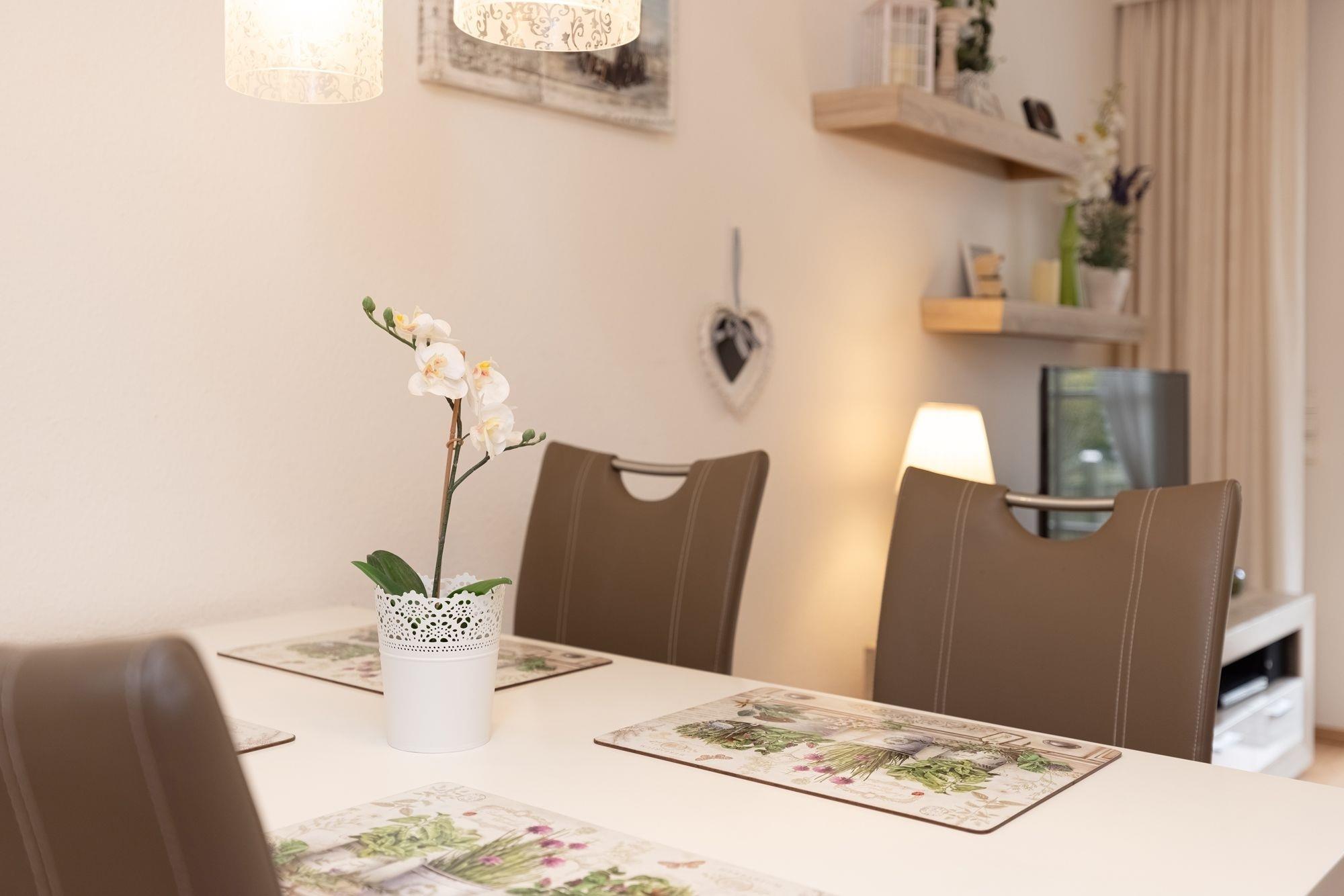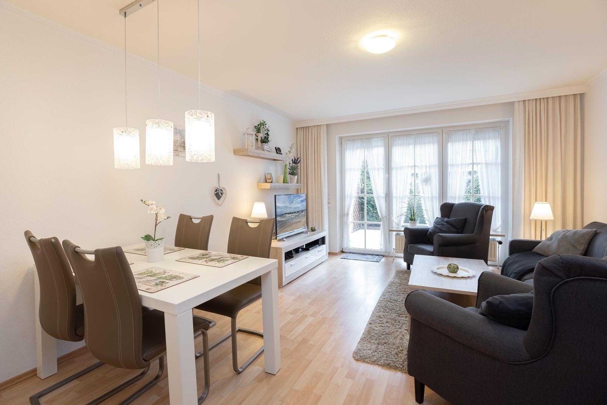 Im Erdgeschoss befindet sich der großzügige Wohn- und Essbereich mit einem Sofa und zwei Sesseln (erst 2020 erneuert), einem Flachbildfernseher und einem Esstisch für vier Personen. Die Fenster im Wohnbereich verfügen über Außenjalousien. Vom Wohnzimmer führt ein direkter Zugang auf die schöne, möblierte Terrasse mit Gartenanteil. Wollen Sie dem Trubel am Strand einmal entfliehen, dann lädt dieses ruhige, grün umsäumte Kleinod zum Verweilen ein.