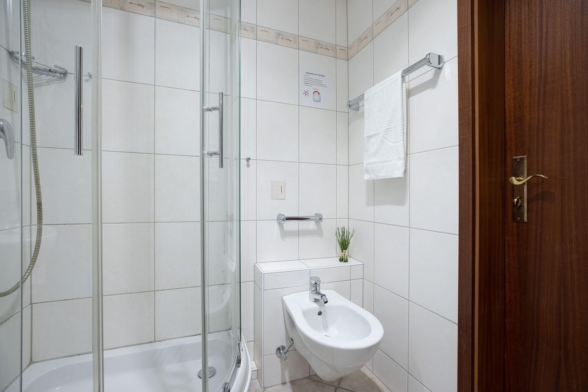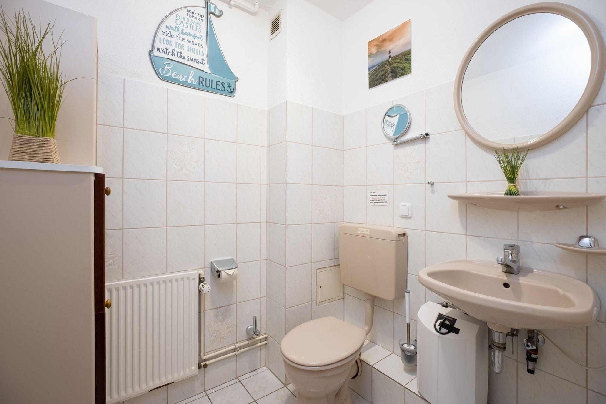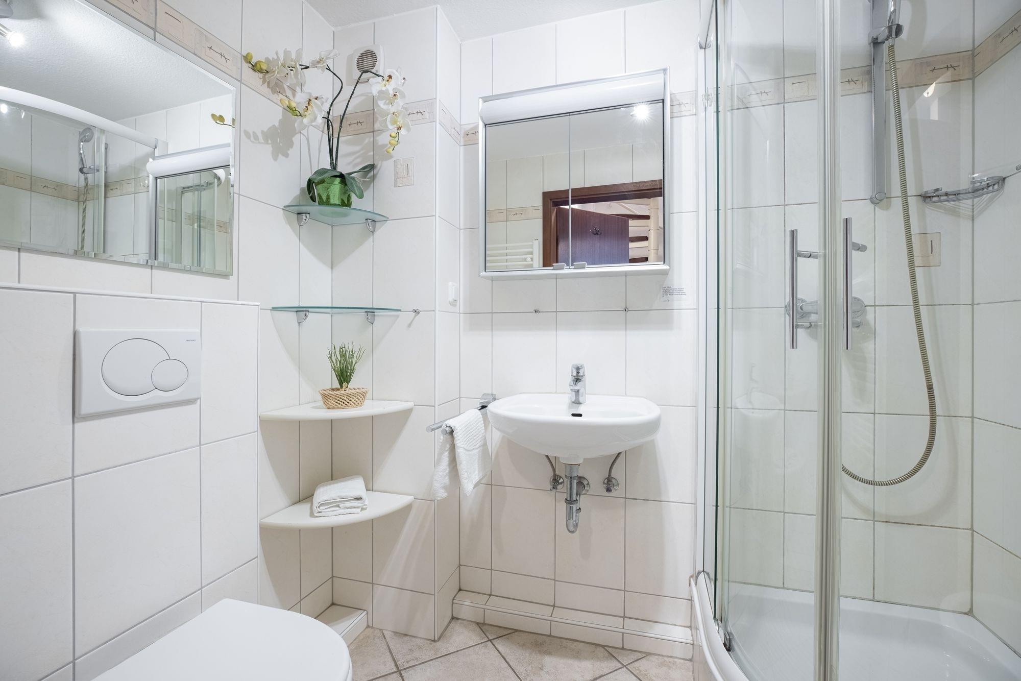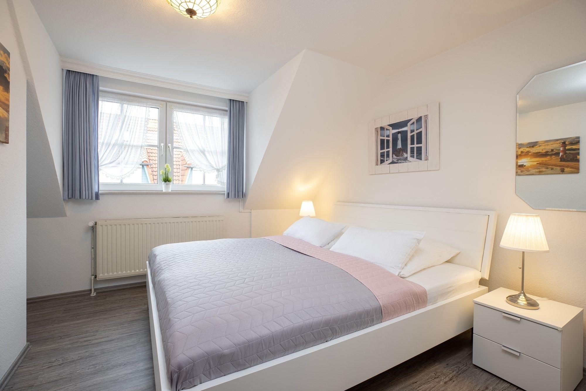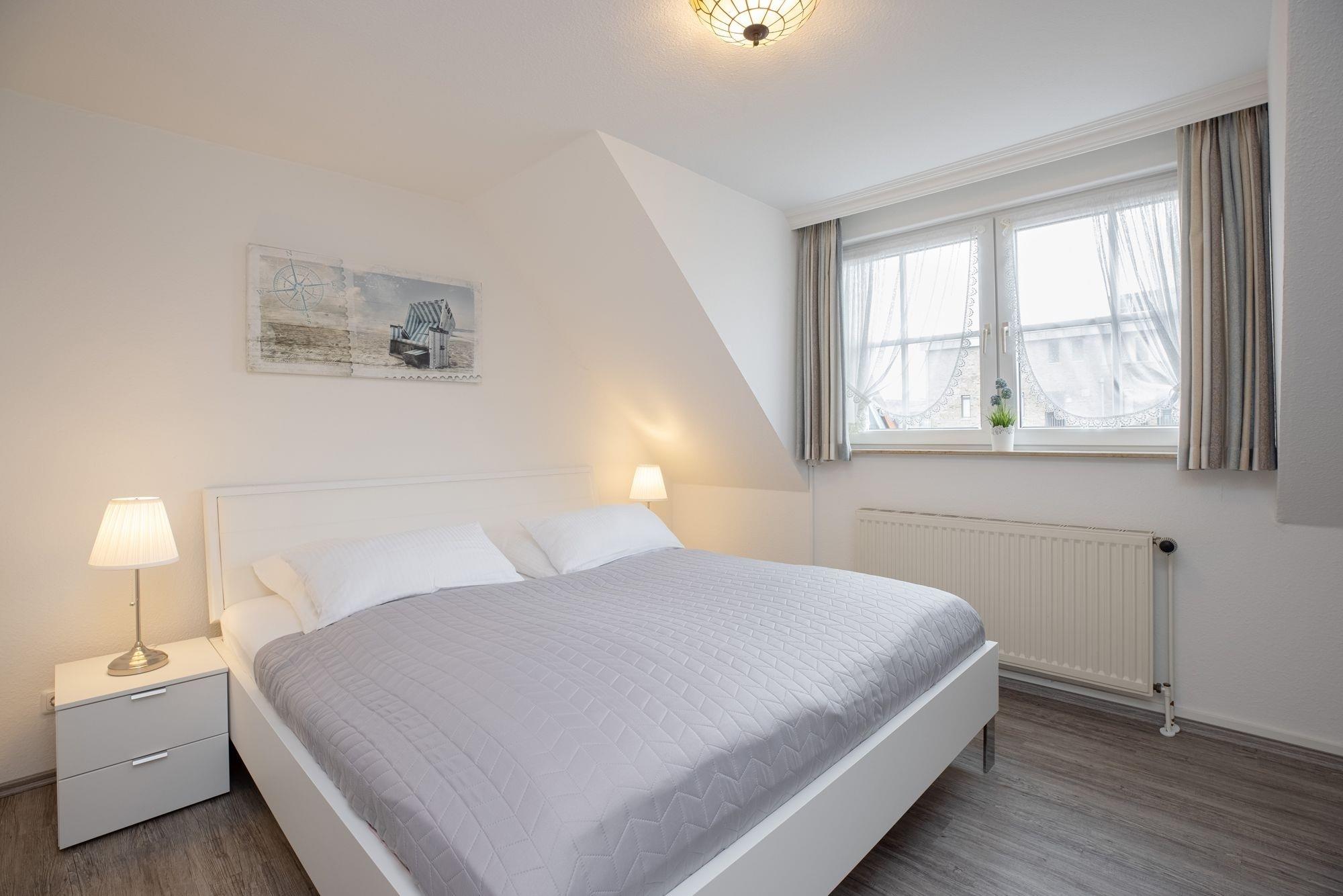In der 1. Etage befinden sich die beiden neu möblierten Schlafzimmer mit jeweils einem Doppelbett (2 x 90x200 cm), Kleiderschrank, Nachtischen und Leselampen. Ein Schlafzimmer verfügt zudem über einen weiteren Fernseher. Das helle Badezimmer ist mit WC, Eckdusche und beleuchtetem Spiegelschrank ausgestattet - Ein Föhn ist auch vorhanden.