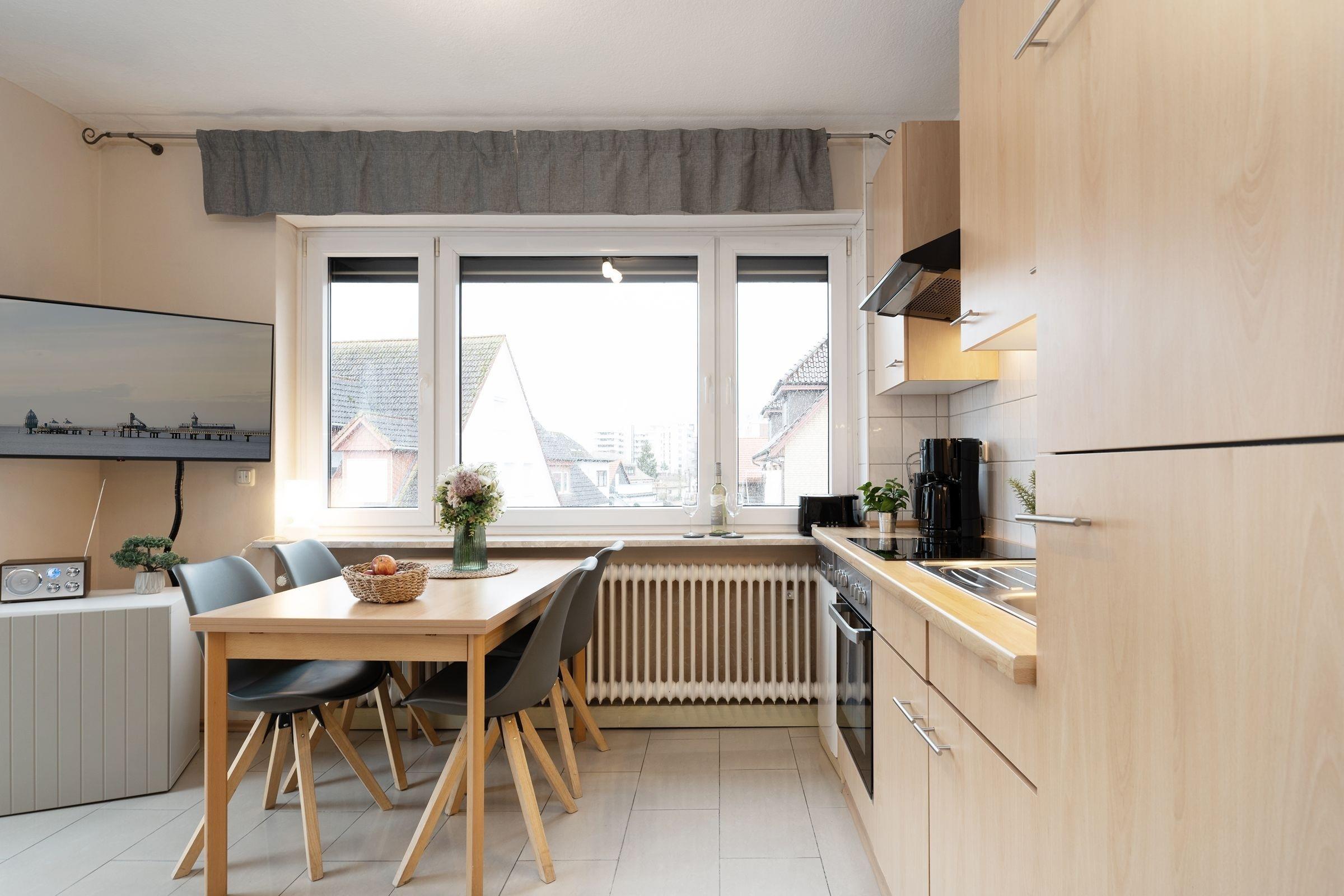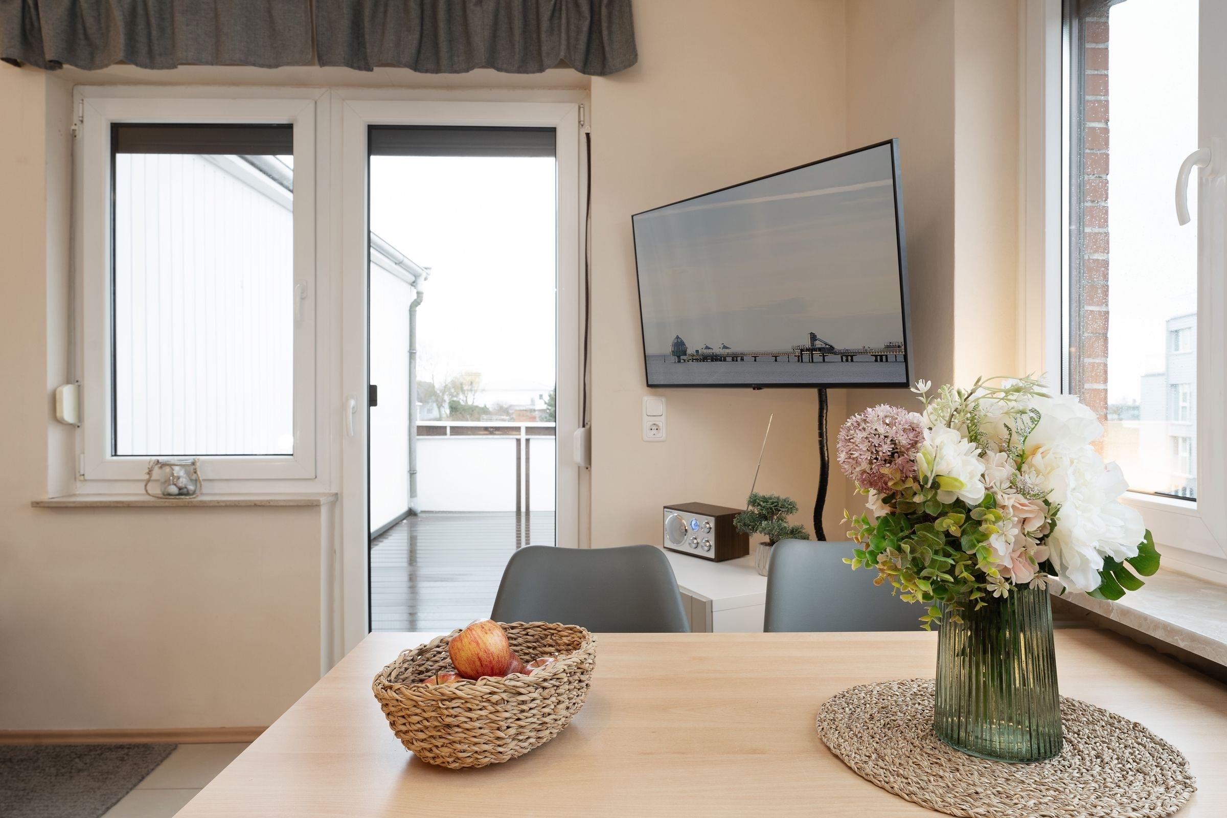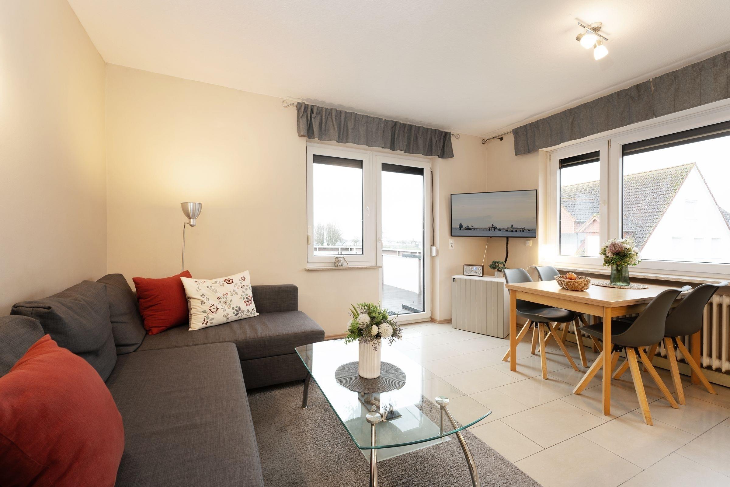 Bis zu 2 Personen können hier einen entspannten Urlaub mit saisonal eingeschränktem Meerblick über den Deich hinweg genießen. Das freundliche Wohnzimmer mit Sofa und Smart-TV sowie Bluetooth-Radio schenkt Ihnen behagliche Urlaubsstunden. Über den kostenlosen WLAN-Anschluss bleiben Sie mit Ihren Lieben in Kontakt. Die integrierte Küche ist auf kleinem Raum gut ausgestattet und gewährleistet eine mühelose Zubereitung schmackhafter Köstlichkeiten. Zum Essen oder Spielen finden Sie am Esstisch ausreichend Platz. Vom Wohnraum aus gelangen Sie auf den großzügigen, möblierten Balkon Richtung Meer, auf dem Sie im Sonnenschein die Seele baumeln lassen können. Bei Bedarf sorgt ein Sonnenschirm für Schatten. Im separaten Schlafzimmer spendet ein großes Doppelbett (180x200 cm) erholsame Nächte und im gepflegten, hellen Duschbad bleiben keine Wünsche offen.