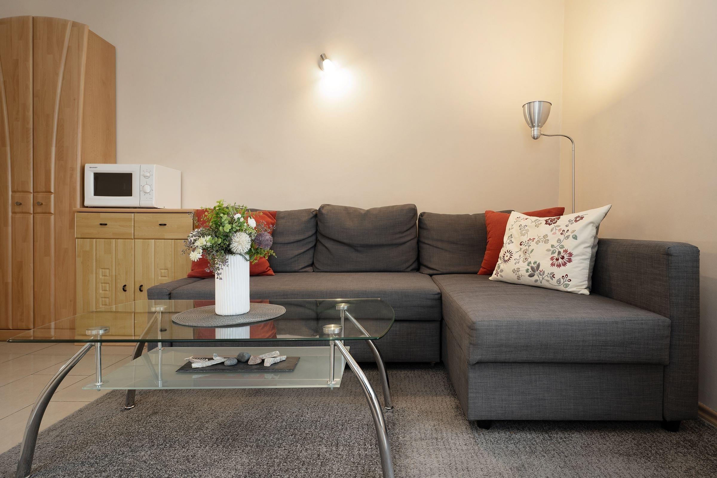 Wohn-/Schlafzimmer: 1 Schlafsofa ( 2x 80x200 cm) oder 1x160 (Bettlaken).
