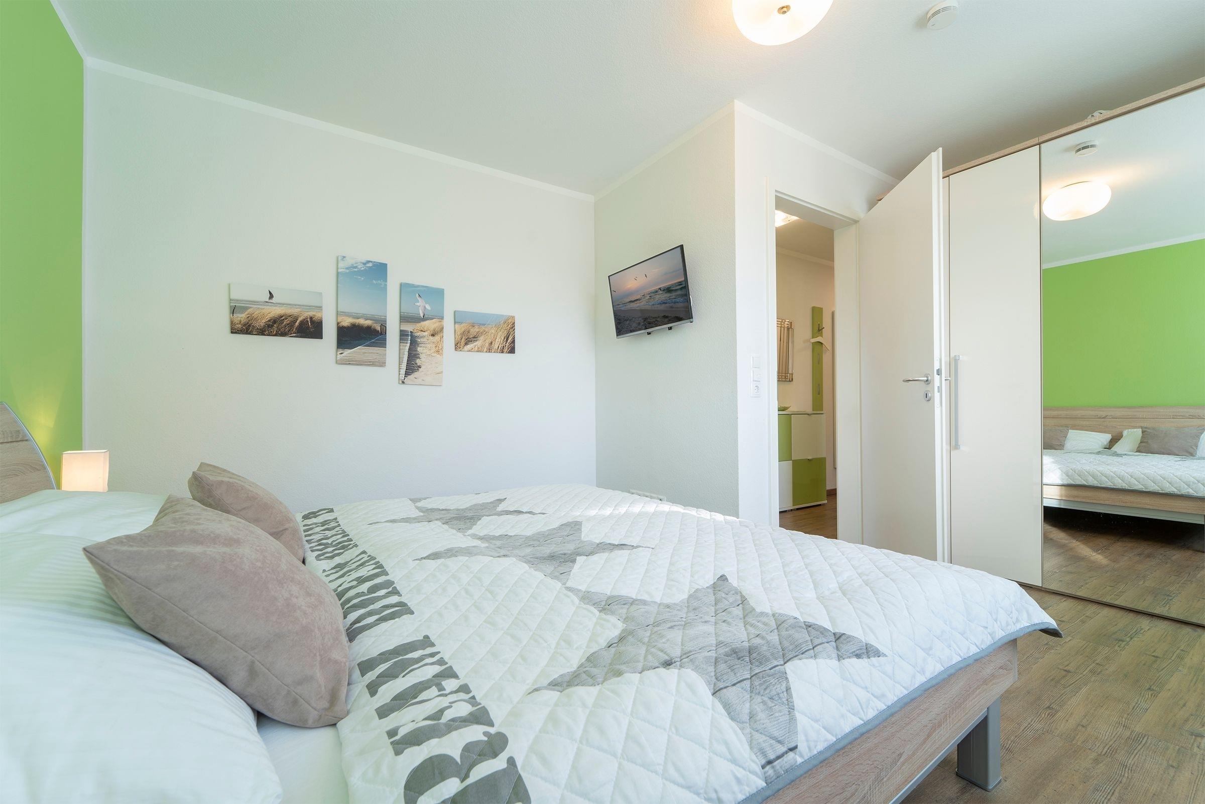 Schlafzimmer: 1 Doppelbett (180x200 cm), TV, Kleiderschrank, Verdunkelung (Außenrollo)