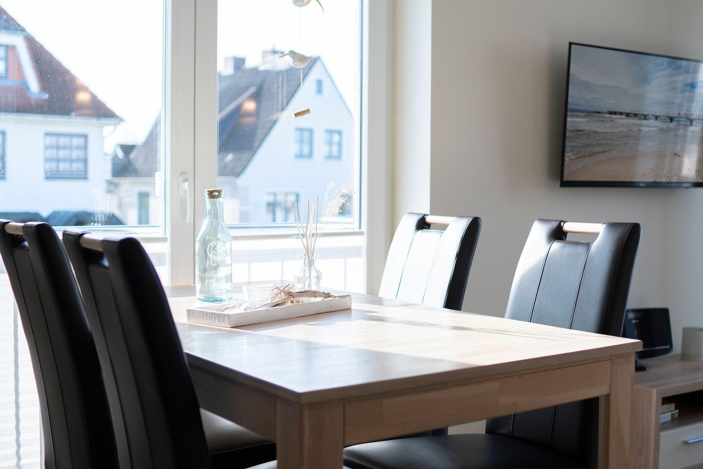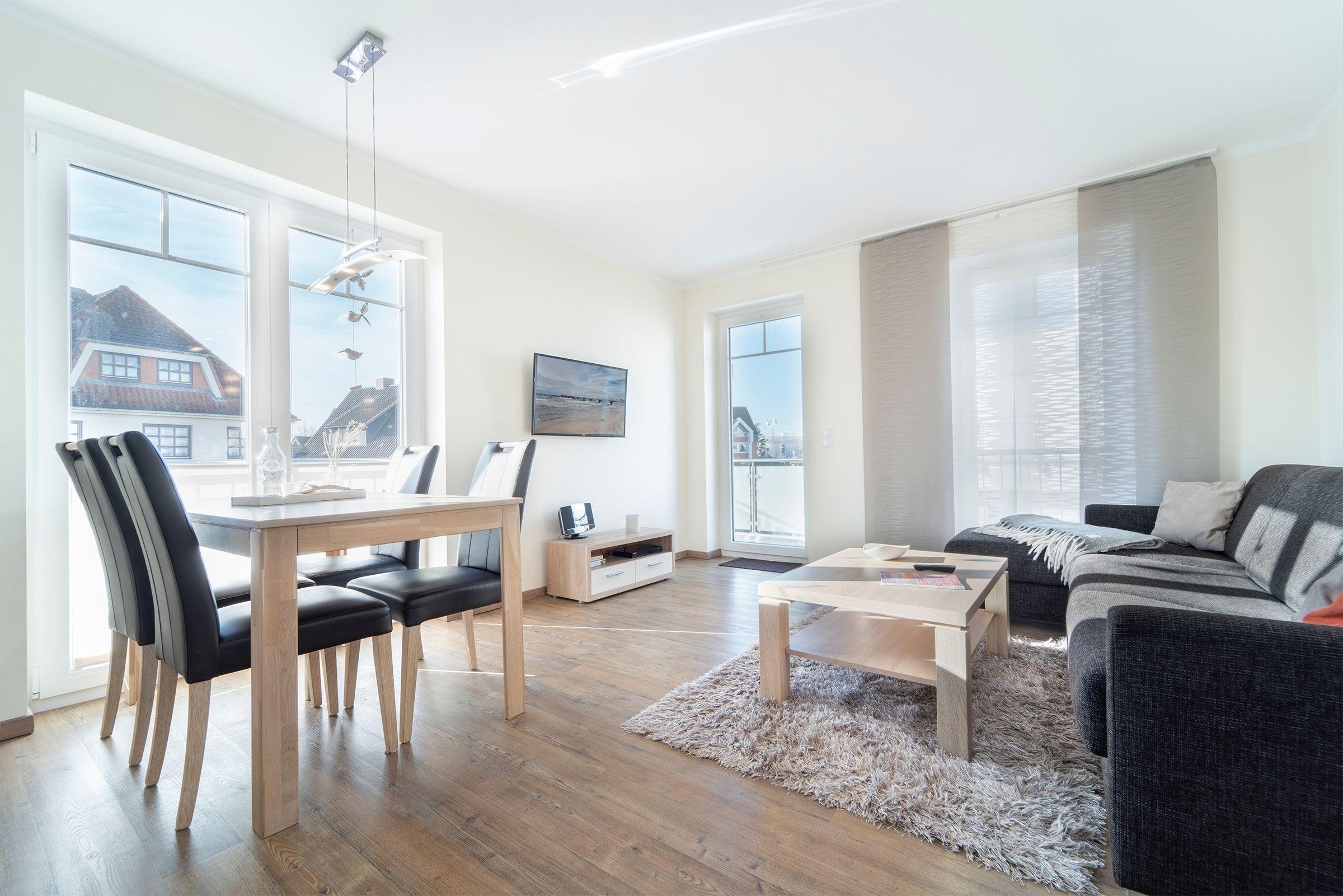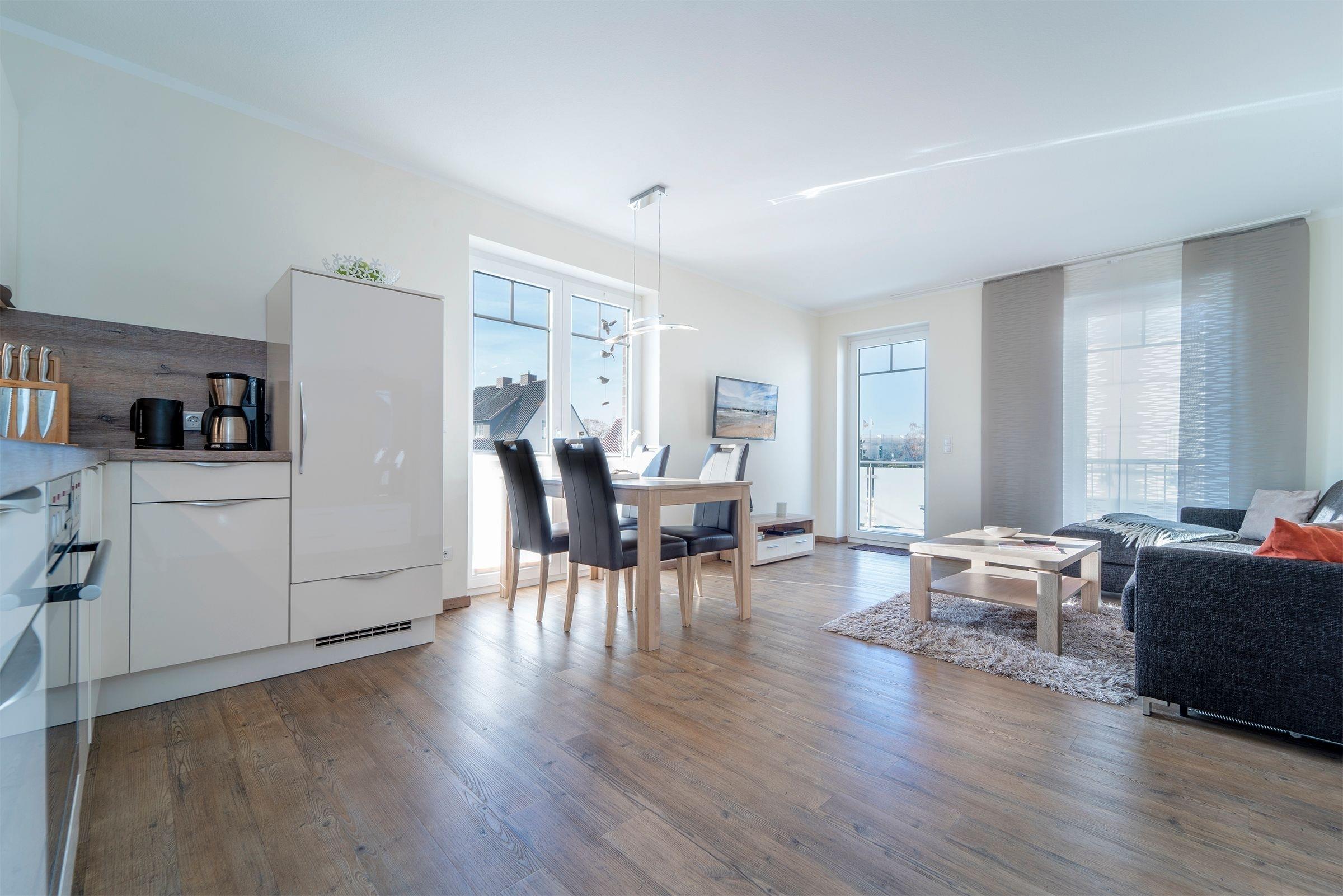 Vom Flur aus gelangen Sie in das geflieste Bad mit Dusche und allem, was Sie brauchen. Im Schlafzimmer finden Sie ein Doppelbett (180x200 cm), einen Kleiderschrank und einen Fernseher, der an der Wand montiert ist. Die Wohnküche lädt alle zum Verweilen ein. Von hier aus gelangen Sie auf den Balkon, ebenso können Sie es sich auf der Eckcouch bequem machen, diese verfügt über eine Schlaffunktion (ca. 160x200 cm). Für einen ungestörten Schlaf sorgen die elektrischen Außenrollos, mit denen die Wohnung ausgestattet ist.