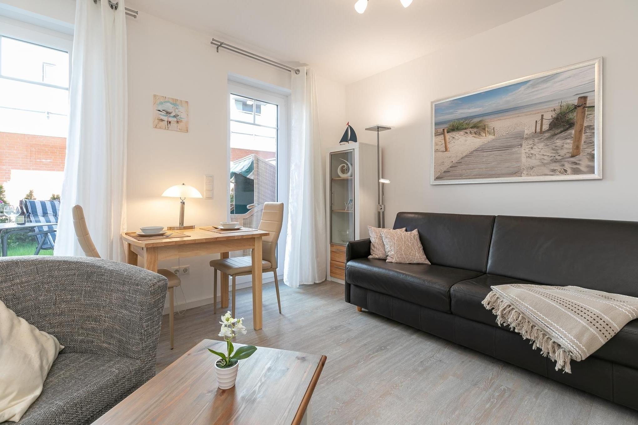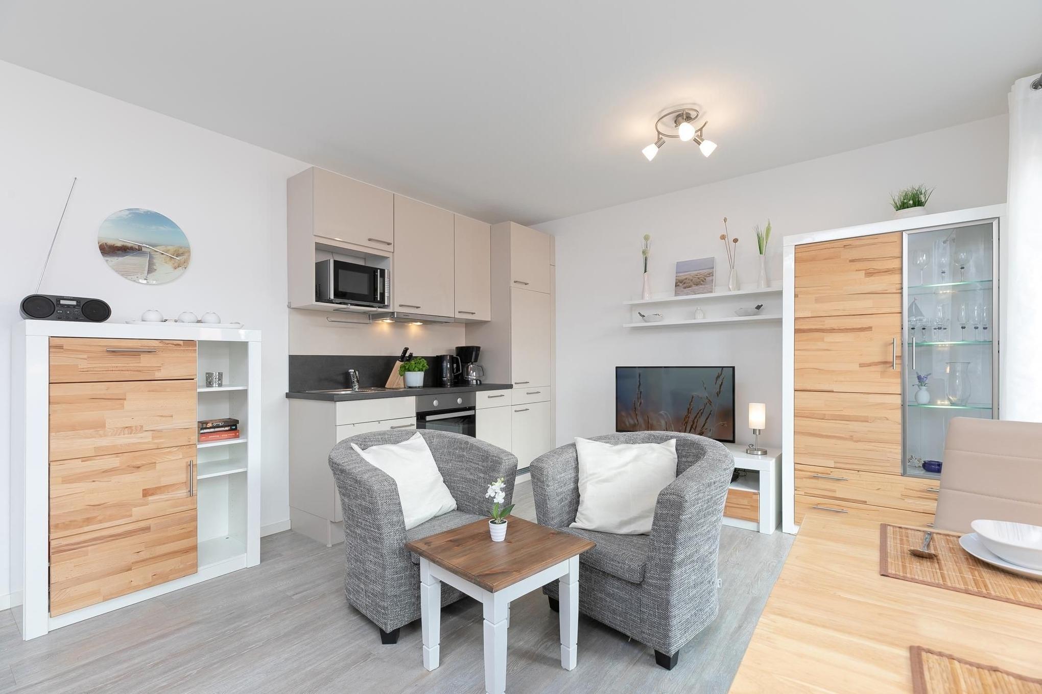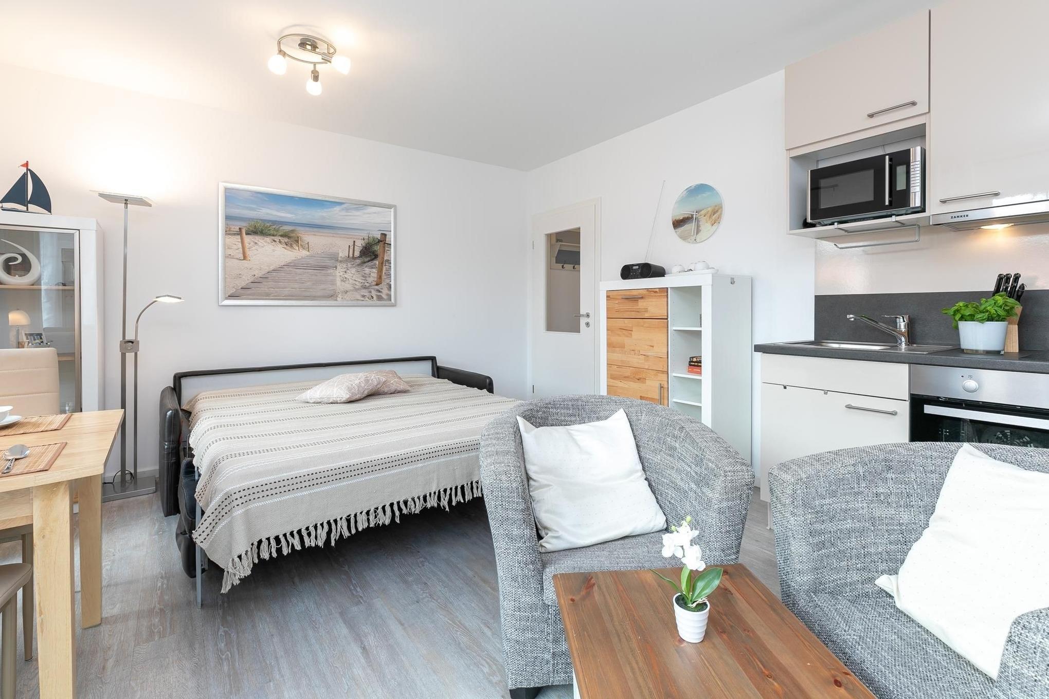 Ihr Feriendomizil überzeugt mit lässig-modernem Design und klarer, frischer Gemütlichkeit. Das gesamte Interieur ist hochwertig, Farben und Materialien sind gekonnt harmonisch aufeinander abgestimmt. Ein angenehmes, ästhetisch ansprechendes Wohnumfeld, indem man sich rundum wohlfühlt. Das Entrée der Wohnung ist elegant und mit praktischen Garderobenhaken und Kleiderschrank versehen. Der offene, lichtdurchflutete Wohn-/Schlafraum mit hochwertiger Schlafcouch (Liegefläche ca. 160x200 cm), einem großen Flatscreen-TV und direktem Ausgang zur Sonnenterrasse begrüßt Sie gemütlich und hell. Raffiniert integriert bietet die gut ausgestattete Küchenzeile mit 2-Platten-Ceranfeld und Geschirrspüler einige Annehmlichkeiten, hier bereiten Sie mit Leichtigkeit leckere Ferienmenüs. Das stilvolle Designbad überzeugt mit ebenerdiger Dusche, Hänge-WC, beleuchtetem Spiegel und eigener Waschmaschine. Kostenfreies WLAN ist vorhanden. Machen Sie es sich auf der sonnigen, möblierten Terrasse bequem und genießen Sie hier im eigenen Strandkorb den ersten Kaffee am Morgen oder besinnliche Abende zu zweit.