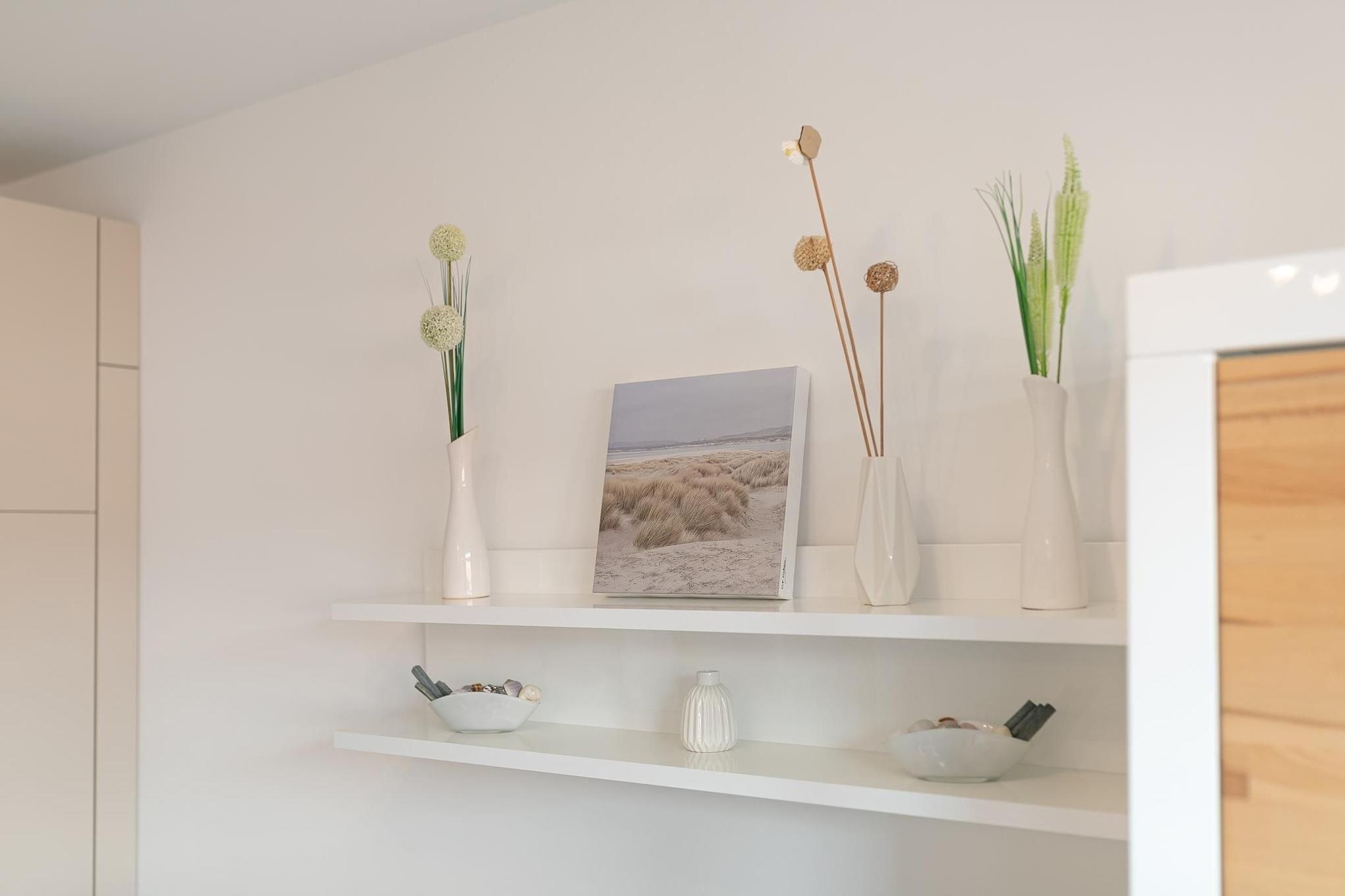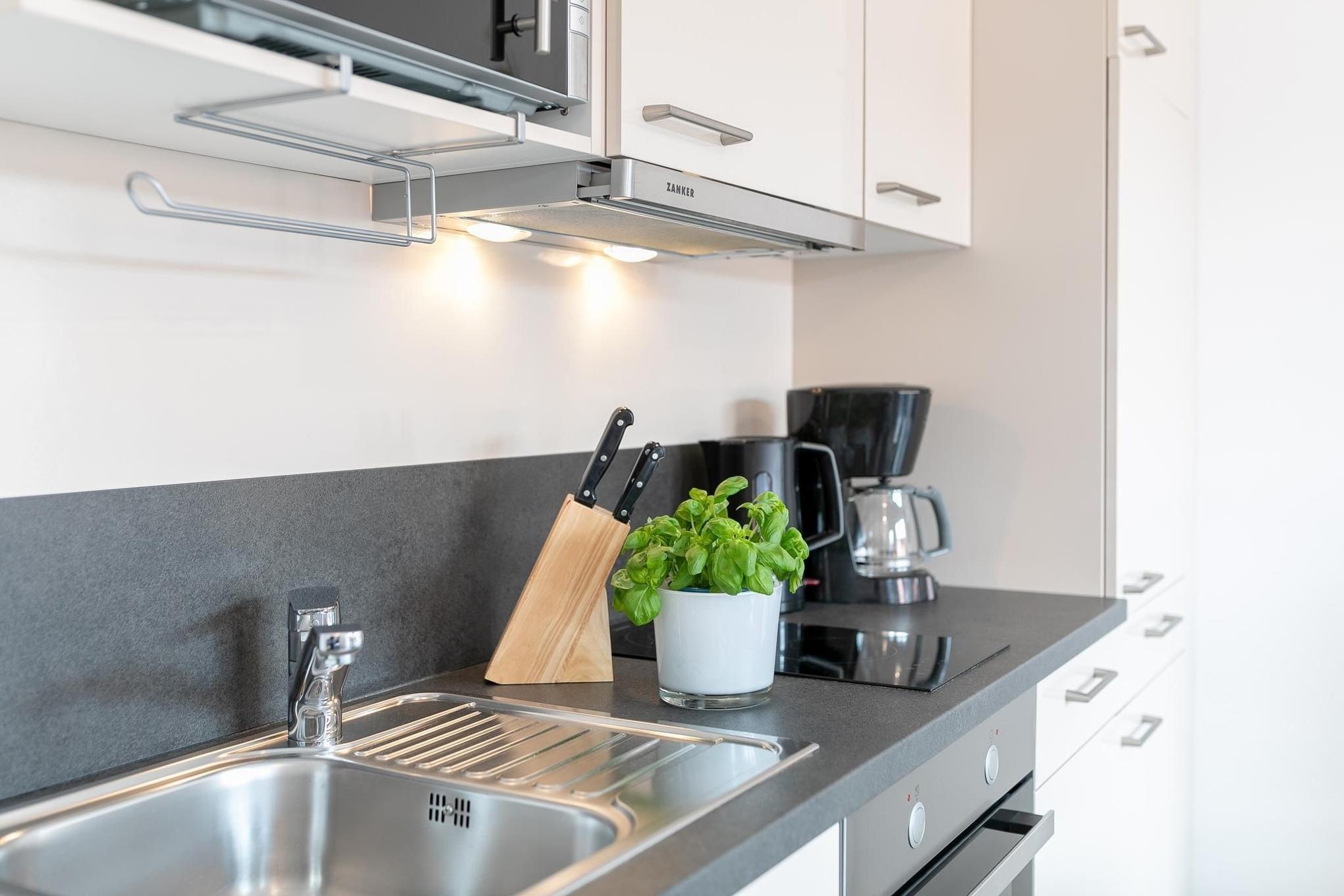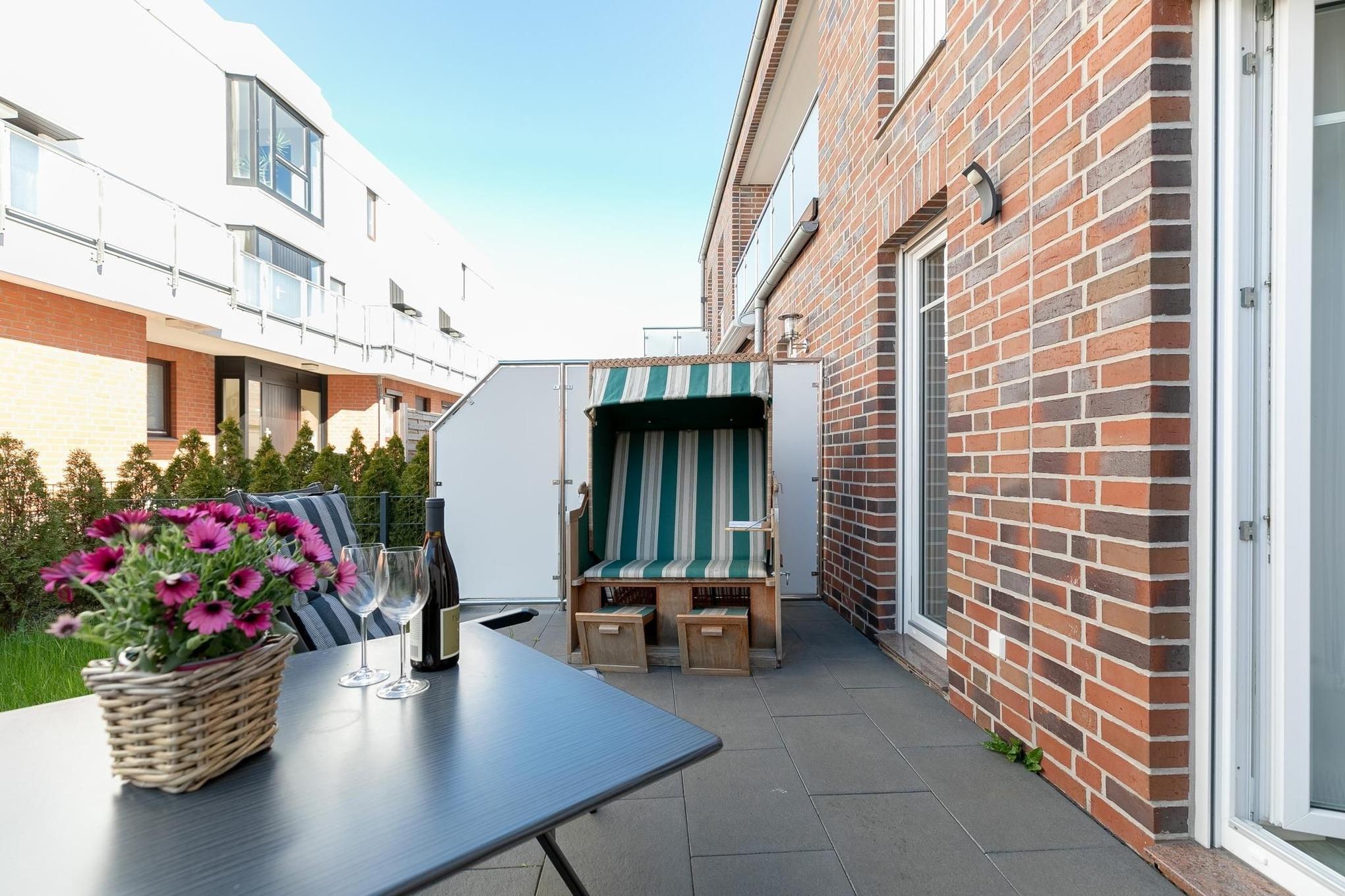 Ihr Feriendomizil überzeugt mit lässig-modernem Design und klarer, frischer Gemütlichkeit. Das gesamte Interieur ist hochwertig, Farben und Materialien sind gekonnt harmonisch aufeinander abgestimmt. Ein angenehmes, ästhetisch ansprechendes Wohnumfeld, indem man sich rundum wohlfühlt. Das Entrée der Wohnung ist elegant und mit praktischen Garderobenhaken und Kleiderschrank versehen. Der offene, lichtdurchflutete Wohn-/Schlafraum mit hochwertiger Schlafcouch (Liegefläche ca. 160x200 cm), einem großen Flatscreen-TV und direktem Ausgang zur Sonnenterrasse begrüßt Sie gemütlich und hell. Raffiniert integriert bietet die gut ausgestattete Küchenzeile mit 2-Platten-Ceranfeld und Geschirrspüler einige Annehmlichkeiten, hier bereiten Sie mit Leichtigkeit leckere Ferienmenüs. Das stilvolle Designbad überzeugt mit ebenerdiger Dusche, Hänge-WC, beleuchtetem Spiegel und eigener Waschmaschine. Kostenfreies WLAN ist vorhanden. Machen Sie es sich auf der sonnigen, möblierten Terrasse bequem und genießen Sie hier im eigenen Strandkorb den ersten Kaffee am Morgen oder besinnliche Abende zu zweit.