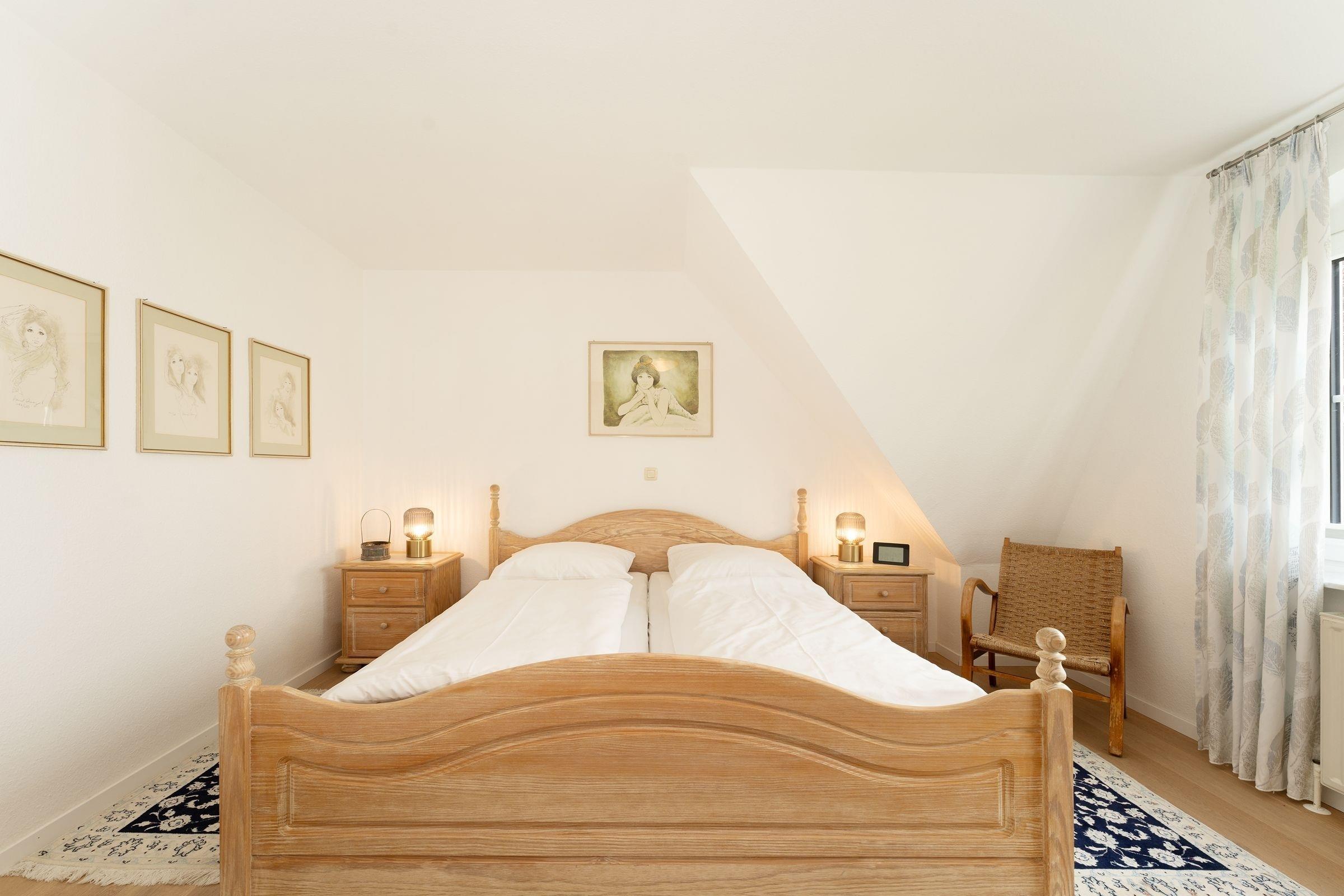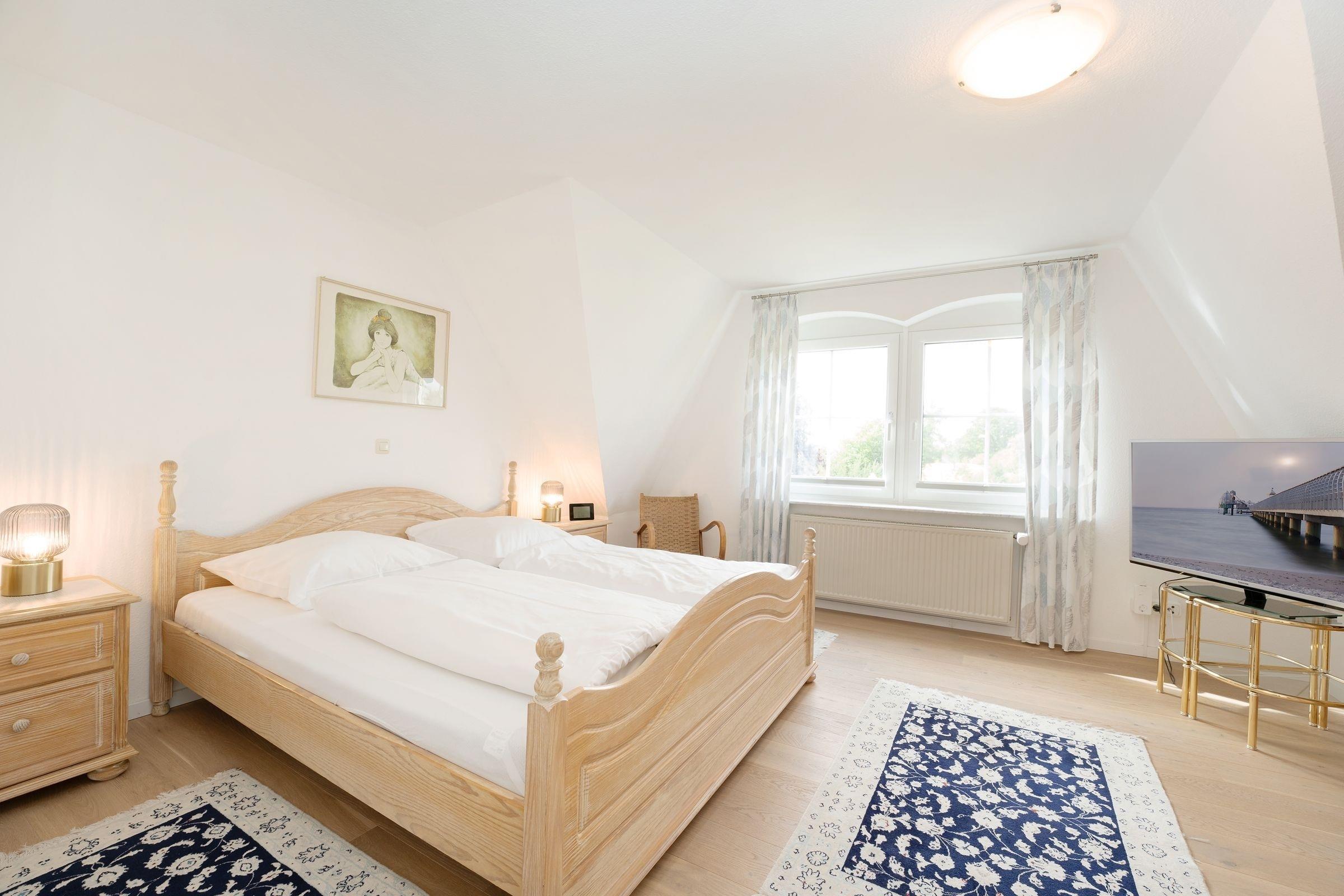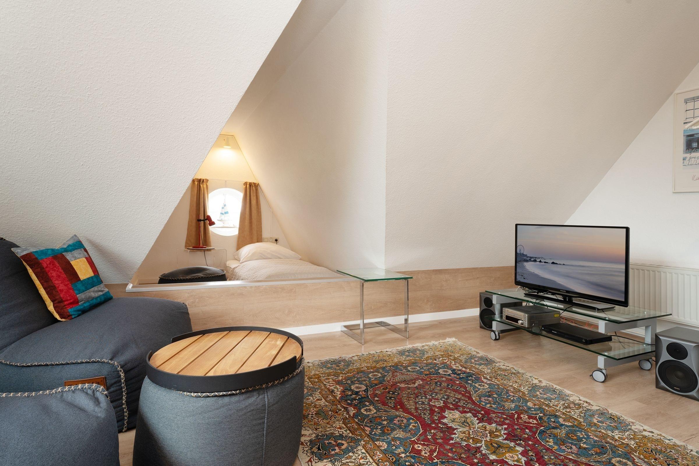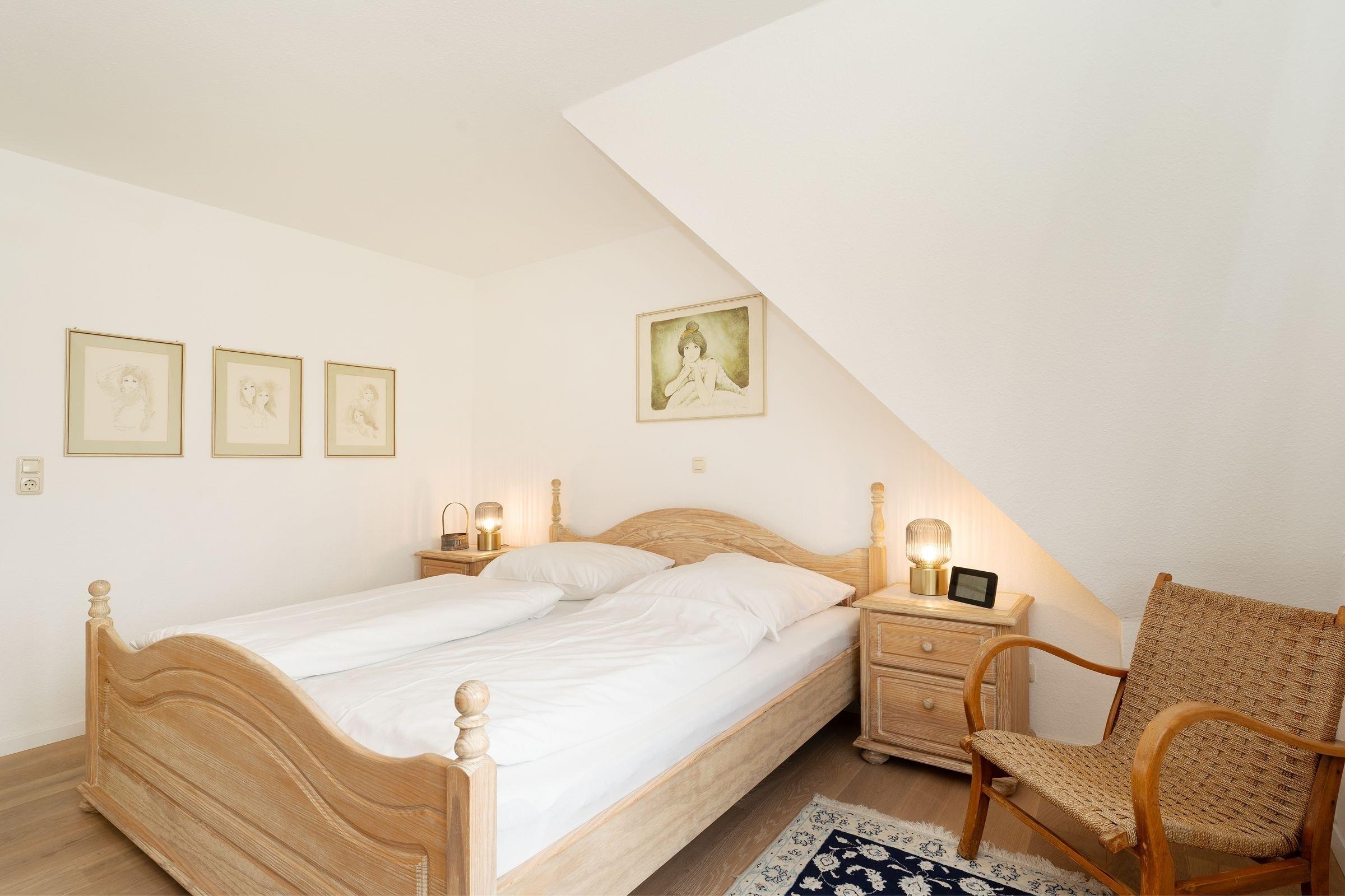 Im Erdgeschoss befindet sich das lichtdurchflutete Wohnzimmer mit moderner, integrierter Küche sowie eine großen Essecke mit sechs Stühlen. Von hier aus haben Sie direkten Zugang zur idyllischen Südwest-Terrasse mit elektrischer Markise (ganztags Sonne) mit entsprechendem Gartenmobiliar. Der große Garten steht Ihnen zur alleinigen Nutzung zur Verfügung. Weiterhin verfügt das Erdgeschoss über ein helles Duschbad. Im 1. Obergeschoss befinden sich zwei Schlafzimmer. Das Elternschlafzimmer bietet neben einem gemütlichen Doppelbett (2x 90x200cm) im Landhausstil einen geräumigen Kleiderschrank für Ihre Urlaubsgarderobe sowie einen zusätzlichen Flachbildfernseher. Ein Schlafzimmer mit zwei Einzelbetten (je 90x200 cm) ist zusätzlich vorhanden. Zudem finden Sie auf dieser Etage ein weiteres Duschbad. Im Dachgeschoss befindet sich ein weiteres Zimmer mit 2 zusätzlichen Schlafmöglichkeiten (je 90x200 cm) für Kinder und einem weiteren Flat-TV mit Blue-Ray und DVD-Player.