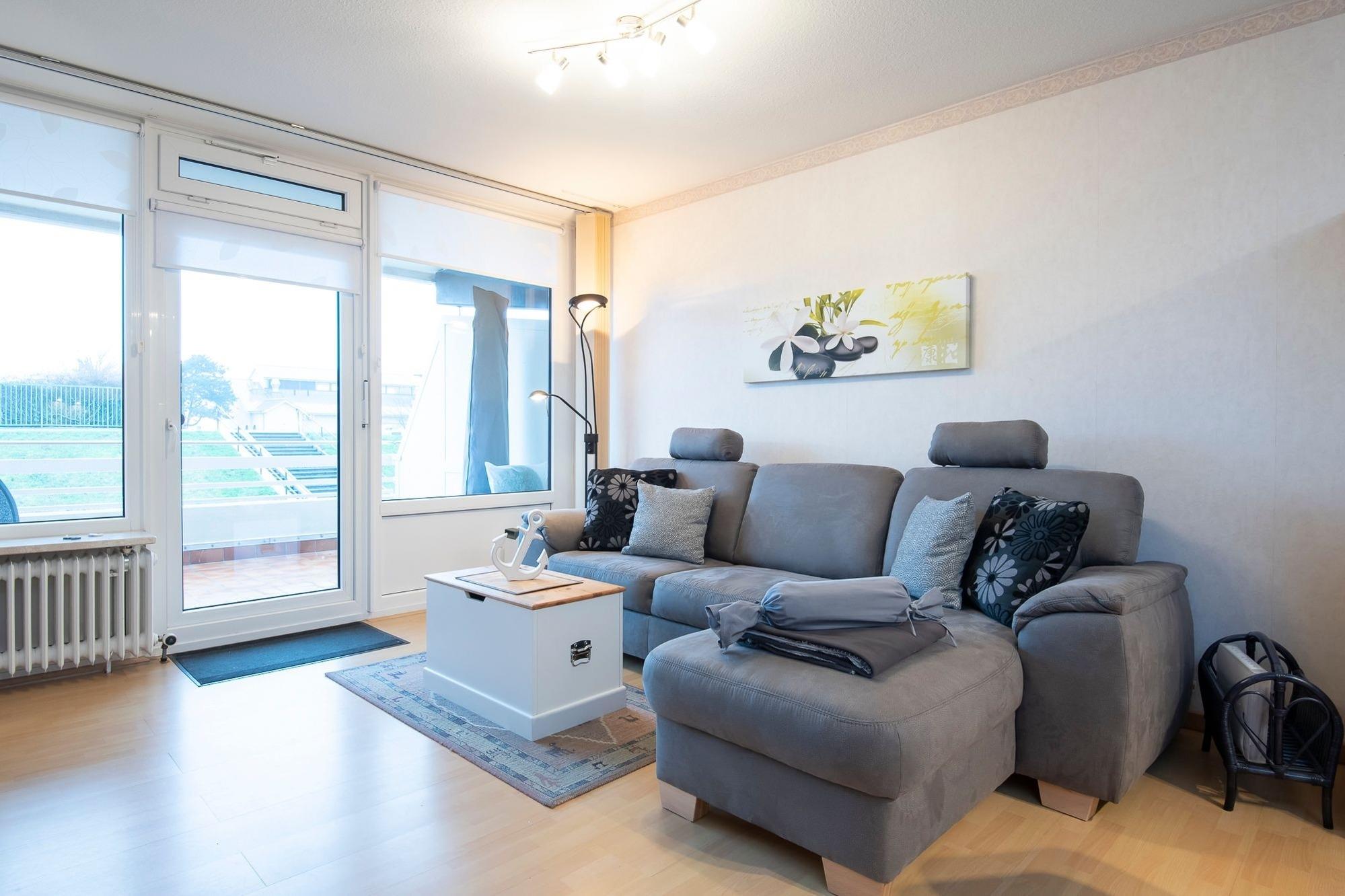 Der lichtdurchflutete Wohn- und Essbereich ist mit einem gemütlichen Ecksofa, einem Esstisch mit 4 Stühlen, einem Flat-TV sowie einer Spielesammlung und diversen Büchern ausgestattet. Das vorhandene Schrankbett (140x200 cm) dient als Schlafmöglichkeit für 2 Personen und ist vom Flur aus über 3 Stufen zu erreichen. Die moderne Küchenzeile ist in den Wohnbereich integriert und mit Annehmlichkeiten wie Kühlschrank mit Gefrierfach, Spülmaschine, Cerankochfeld, Backofen und Mikrowelle ausgestattet. Vom Wohnbereich geht es direkt auf den großzügig geschnittenen und ebenso geschützten Balkon mit Südostausrichtung. Dieser bietet mit einer Fläche von ca. 12 m² eine weitere herrliche Aufenthaltsmöglichkeit mit frischer Seeluft und Blick über den Deich! Ein Sonnenschirm schützt an sonnigen Tagen vor zu starker Sonneneinstrahlung. Im Schlafzimmer befinden sich ein Doppelbett (2x 90x200 cm), 2 Nachttische, ein Flat-TV sowie ein geräumiger Kleiderschrank mit Safe. Ein kostenfreier W-LAN Anschluss steht Ihnen selbstverständlich zur Verfügung. Außenjalousien sorgen für angenehme Verdunklung. Das hell geflieste Badezimmer ist komfortabel mit Eckdusche, WC, Waschbecken und Spiegel ausgestattet.