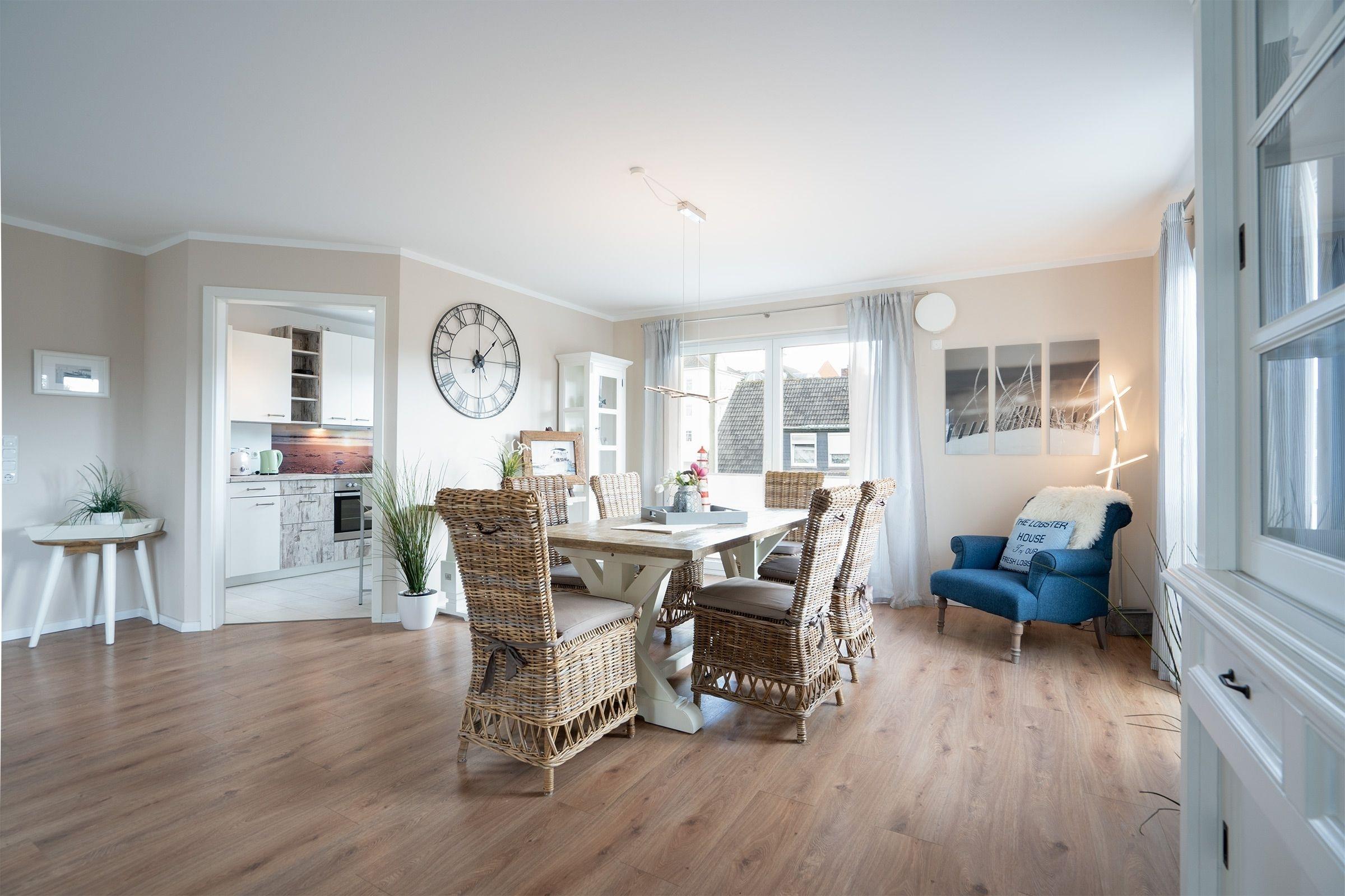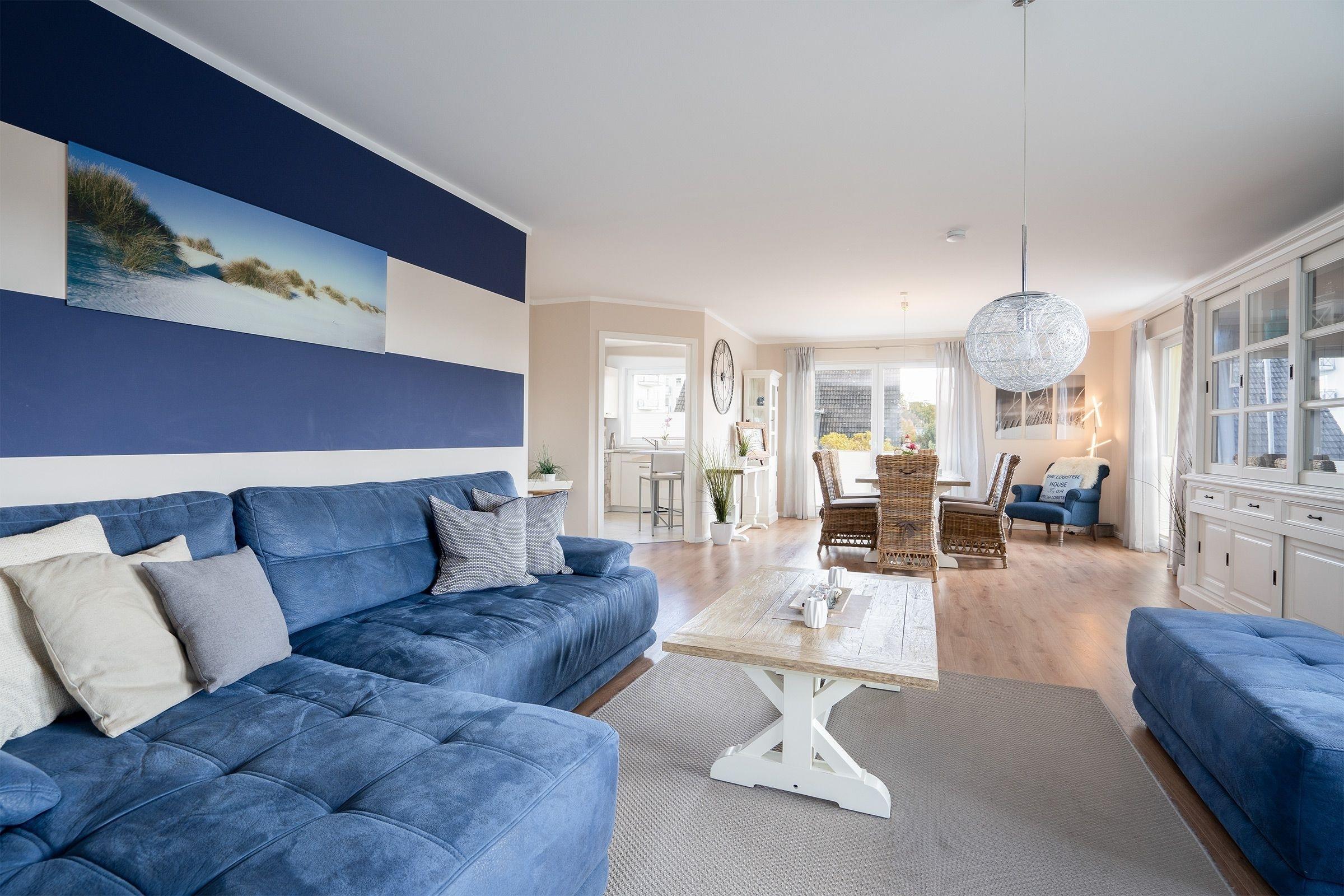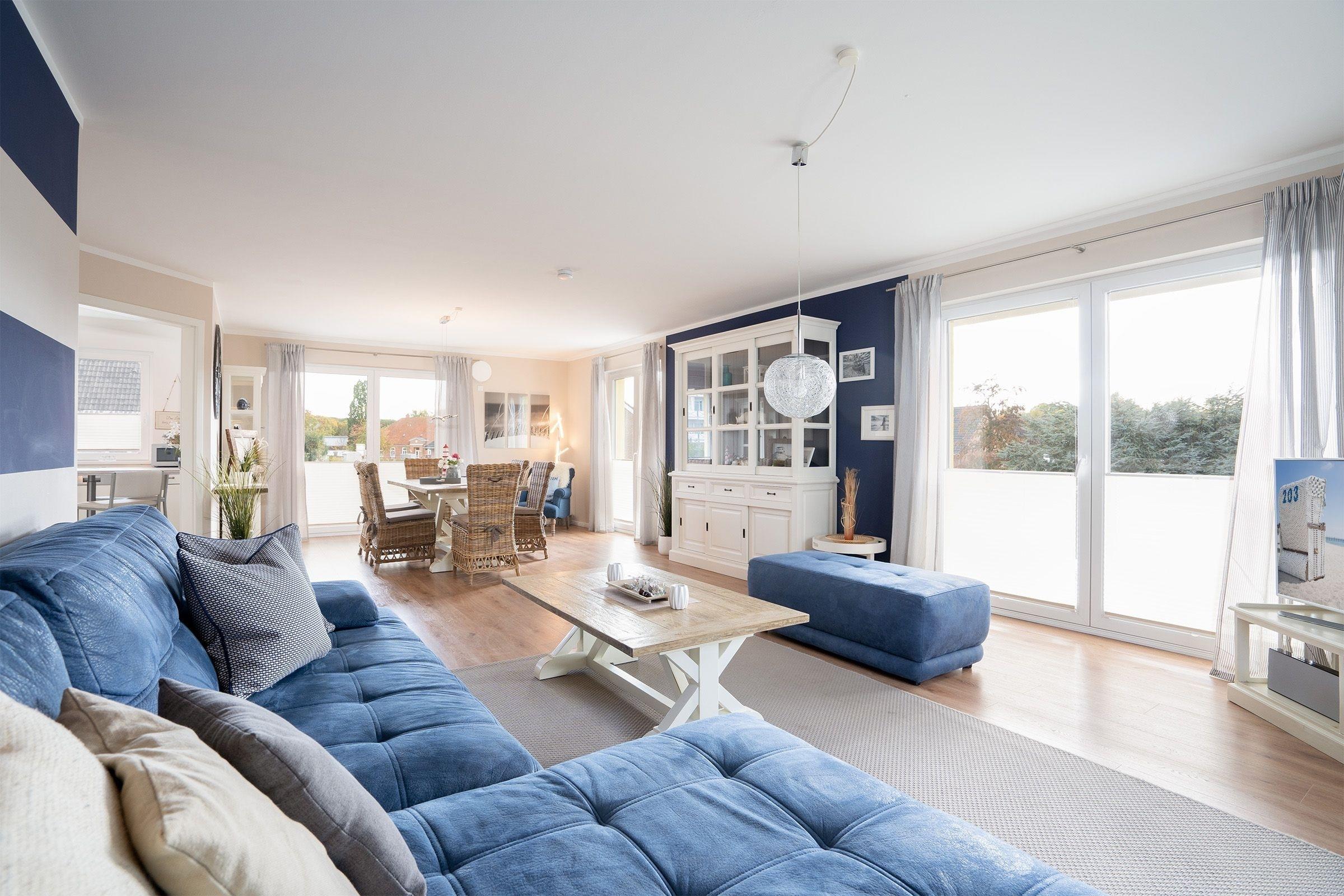 Reichlich Platz bietet diese maritim eingerichtete 3-Zimmer-Ferienwohnung auf ca. 101 m² Wohnfläche für bis zu 4 Erwachsene und 1 Kind. Diese Wohlfühloase ist harmonisch und mit viel Liebe zum Detail eingerichtet. Dieses Feriendomizil ist barrierearm und eignet sich daher ebenfalls für Menschen mit Bewegungseinschränkungen.