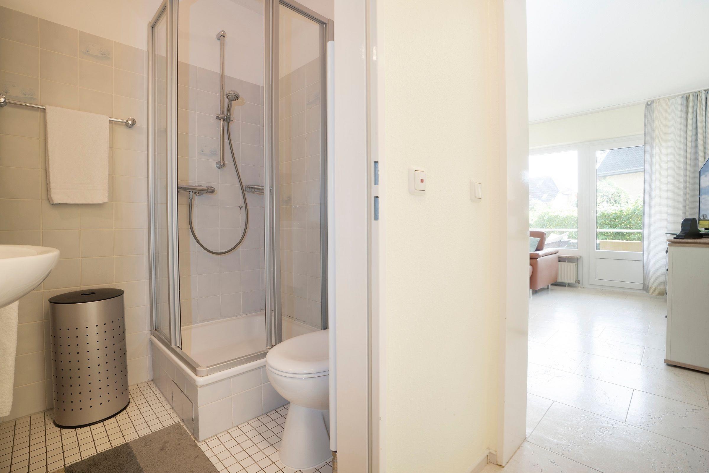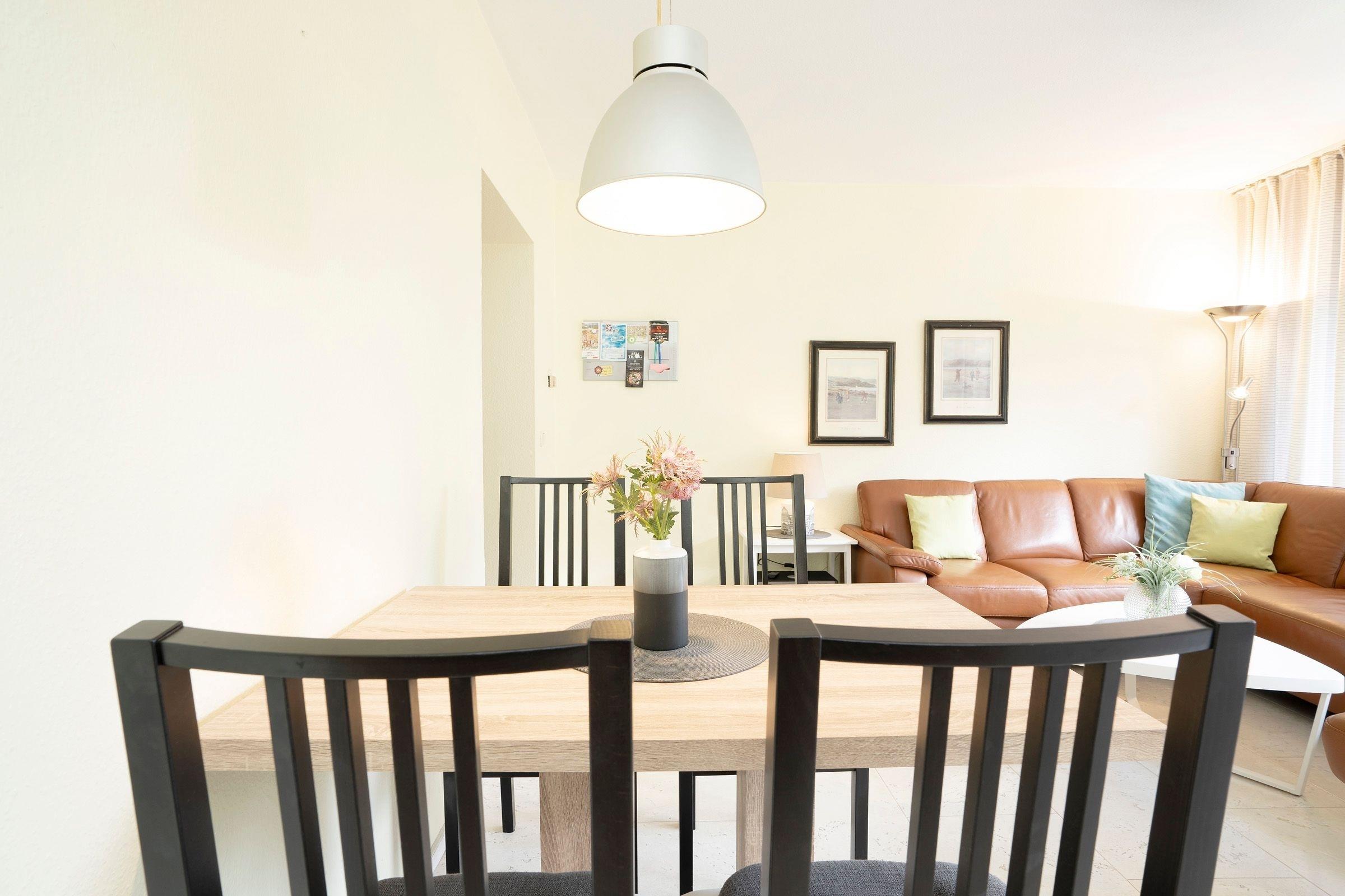 Das moderne Wohnzimmer bietet eine große Couchecke sowie eine Essecke, wo selbst gekochte Speisen genossen werden können. Diese können in der gut ausgestatteten Küche mit Herd/Backofen, Mikrowelle, Kühlschrank, Toaster, Kaffeemaschine uvm. zubereitet werden. Weiterhin finden Sie in der Ferienwohnung einen Flachbild-TV, Stereo-Anlage und einen Video-Recorder vor. Das Schlafzimmer ist ausgestattet mit einem Doppelbett (2x 90x200 cm) und großem Kleiderschrank. Ein Verdunkelungsplissee sorgt für ungestörten Schlaf. Es gibt ein Badezimmer mit Dusche/WC (Badmöbel). Der WLAN-Anschluss ist für Sie inklusive.