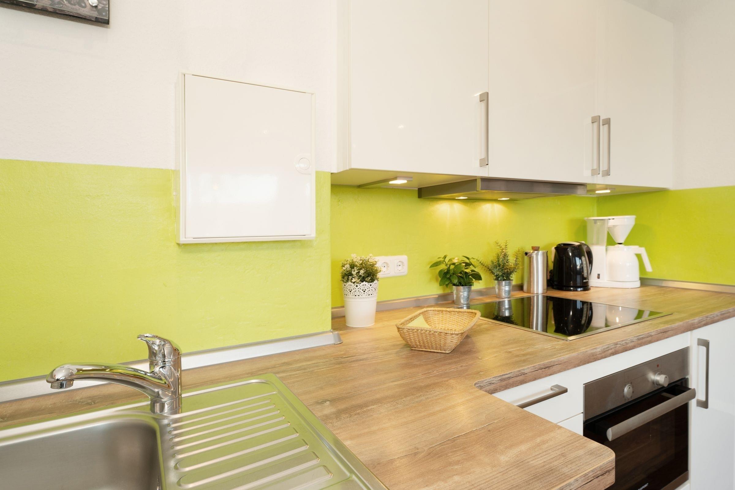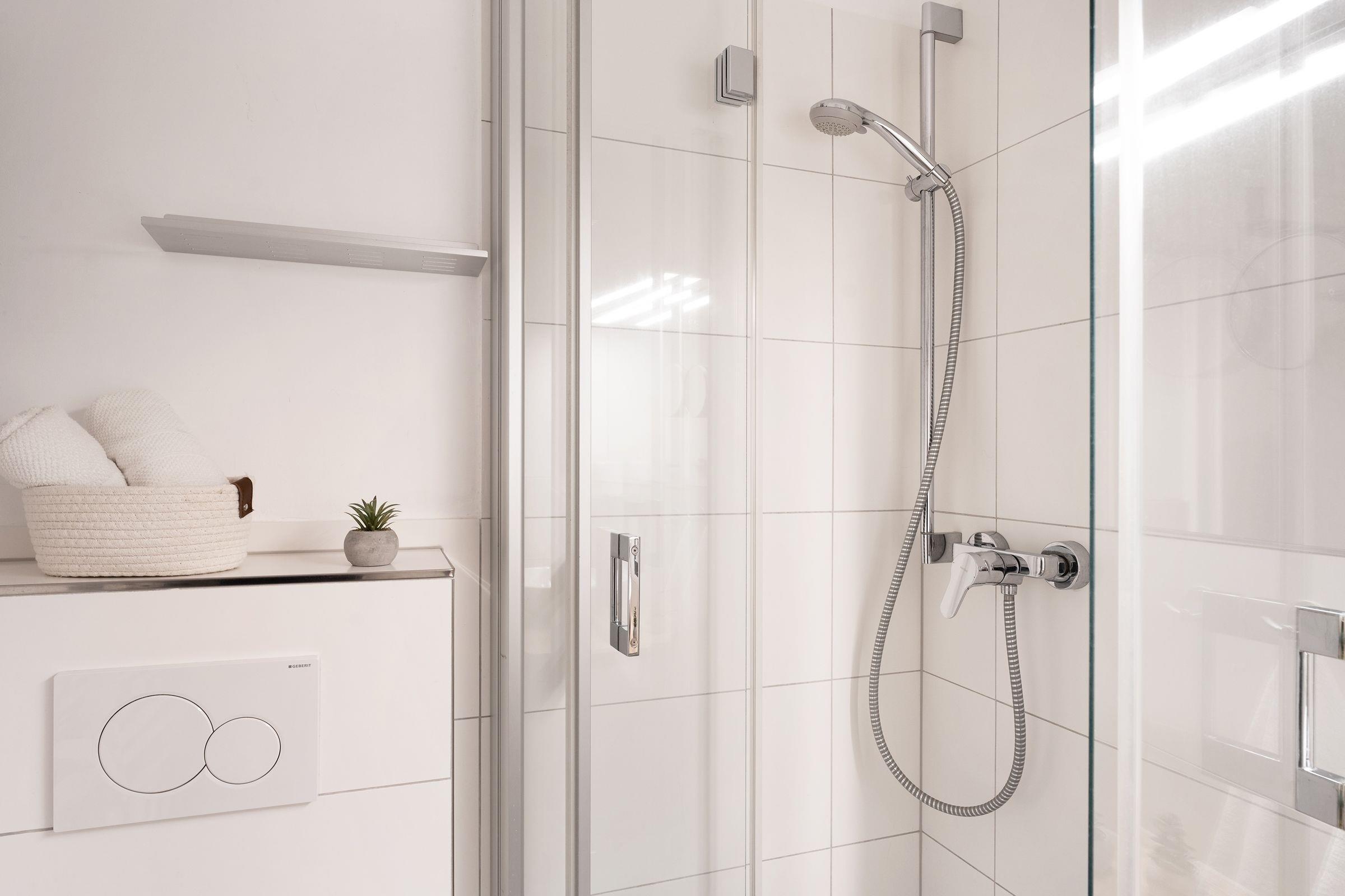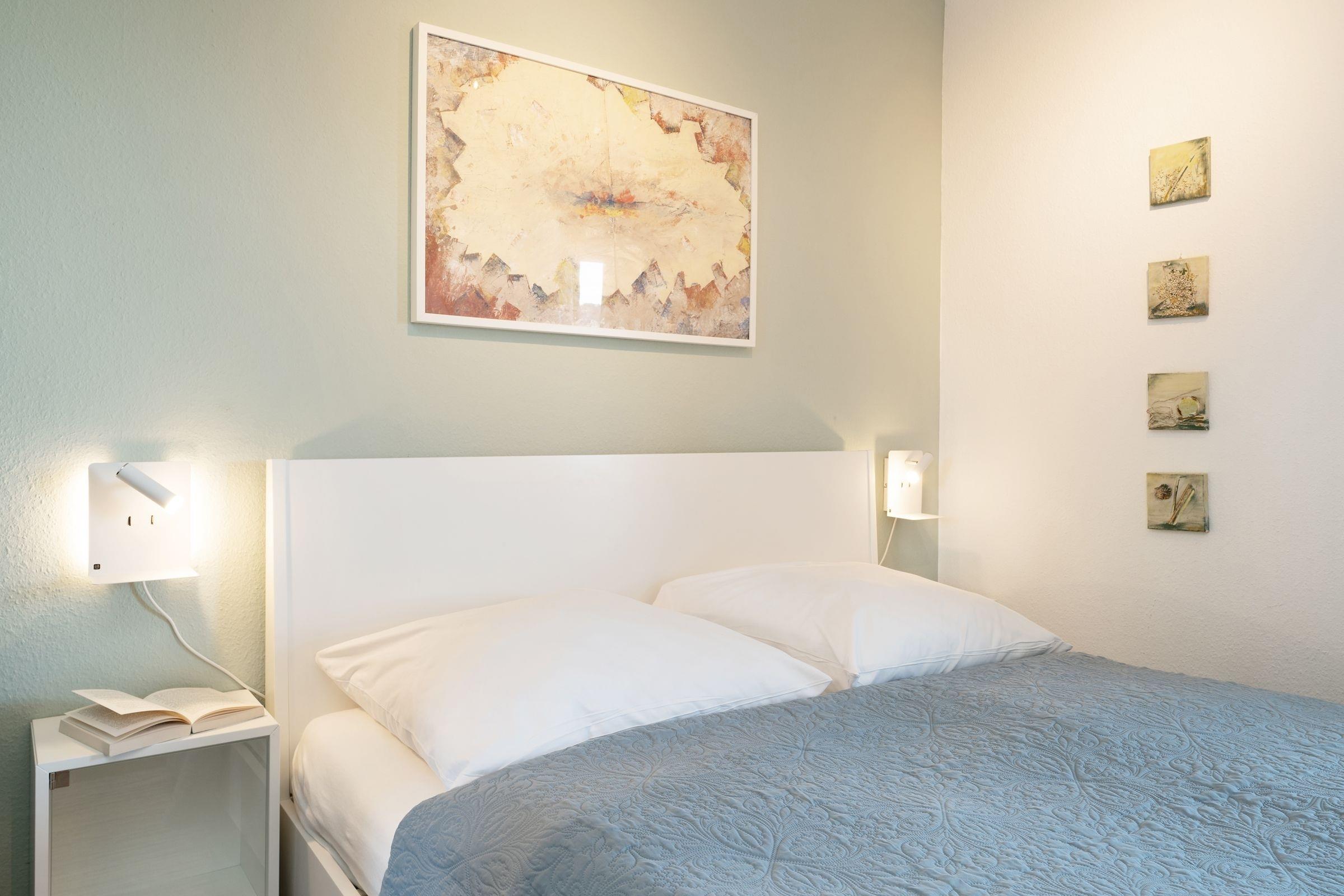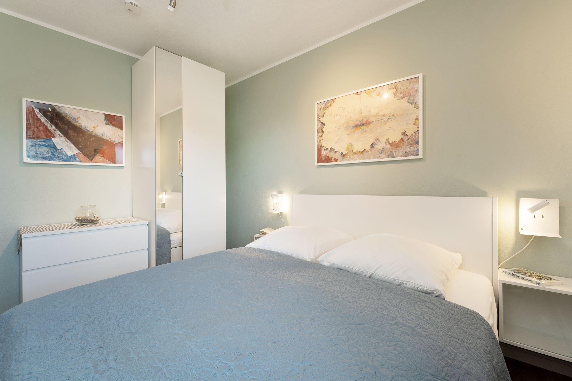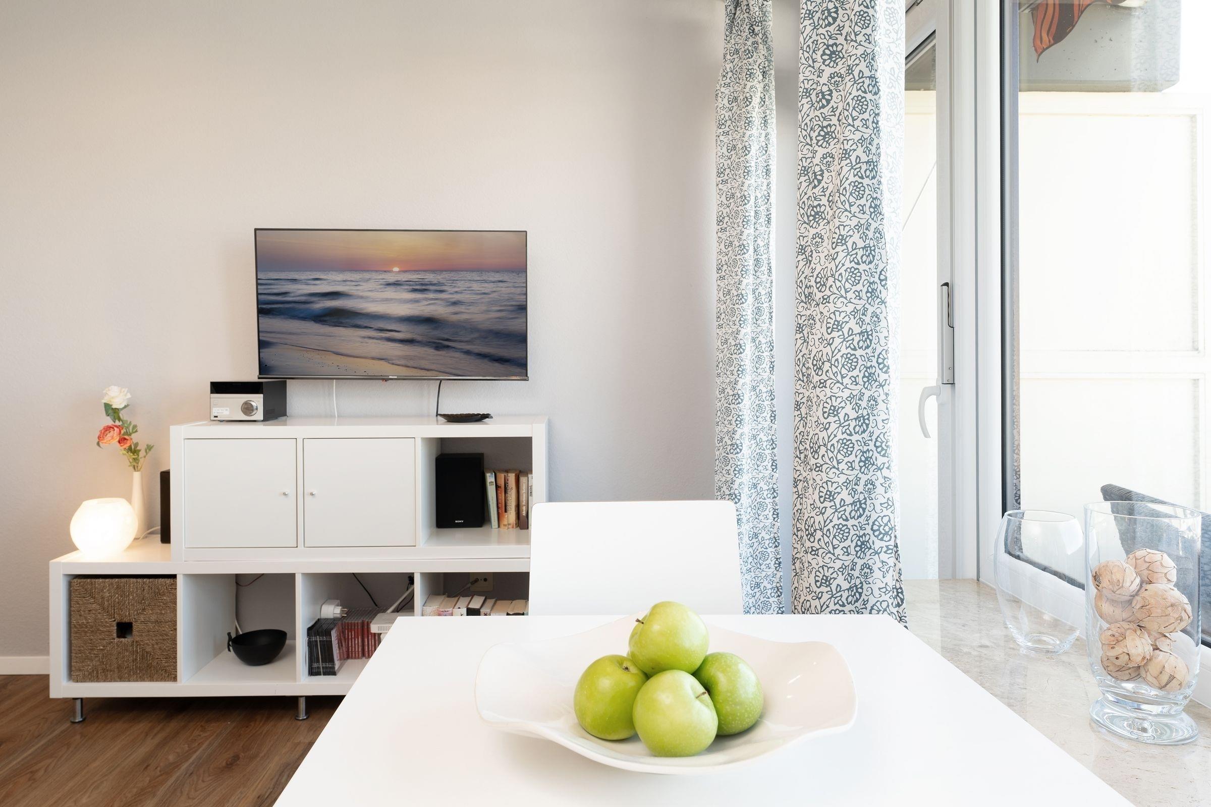 Mittelpunkt der Wohnung bildet der kombinierte Wohn-/Essbereich mit integrierter Küchenzeile und direktem Balkonzugang. Hier lässt es sich auf dem großzügigen Sofa auch an Regentagen gemütlich machen, ein Flachbildfernseher sowie eine Bluetooth-Musikbox sorgen für Unterhaltung. LED Einbaustrahler in der Zimmerdecke sorgen für warmes Licht und eine heimelige Atmosphäre. Das Sofa lässt sich abends bei Bedarf mit wenigen Handgriffen bequem in eine Schlafstätte (140x200 cm)verwandeln. Auf dem Balkon mit seitlichem, saisonalen Ostsee-Fernblick können Sie die Sonne vom Morgen bis zum Nachmittag genießen oder unter der Markise im Schatten sitzen. Ein Tisch mit zwei Stühlen lädt dort zum gemütlichen Frühstück inklusive herrlicher Ostseeluft ein. Die Küche ist voll ausgestattet und lässt keine Wünsche offen, vom Induktionsherd über eine Spülmaschine und einen Backofen, sowie einen Kühlschrank mit Gefrierfach finden Sie hier alles, was einem das Kochen im Urlaub zum Vergnügen macht. Ein ausziehbarer Esstisch rundet den Essbereich ab. Im Schlafzimmer mit gemütlichem Doppelbett (2x 80x200 cm) befindet sich durch einen Kleiderschrank und eine Kommode ausreichend Staumöglichkeit für Ihre Urlaubskleidung. Das geschmackvolle und moderne Badezimmer ist hell gefliest und mit allem ausgestattet, was Sie für die körperliche Hygiene benötigen. Neben WC, Dusche, Waschtisch mit Unterbauschrank und Spiegel steht Ihnen auch ein Föhn zur Verfügung. Die Wohnung ist durchgehend mit einem Designerboden in Holzoptik versehen. Der WLAN-Anschluss ist inklusive.