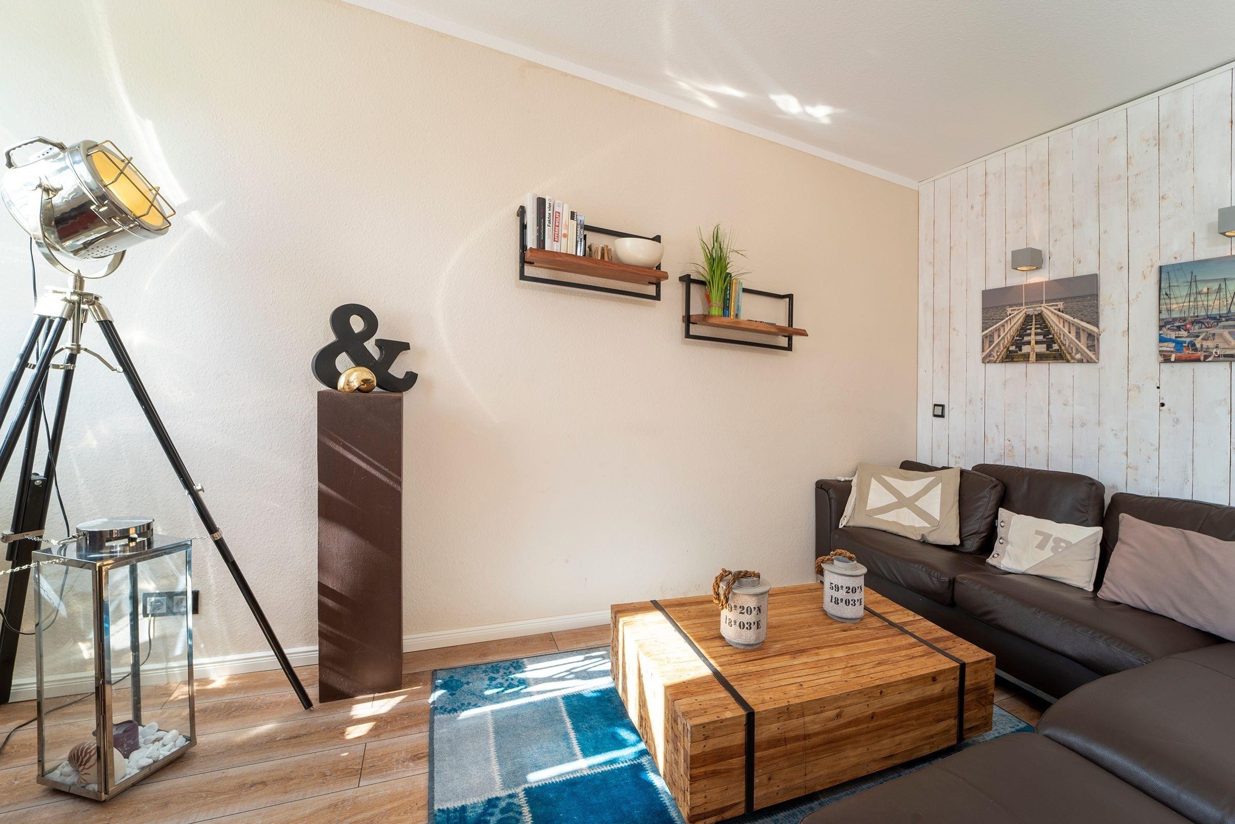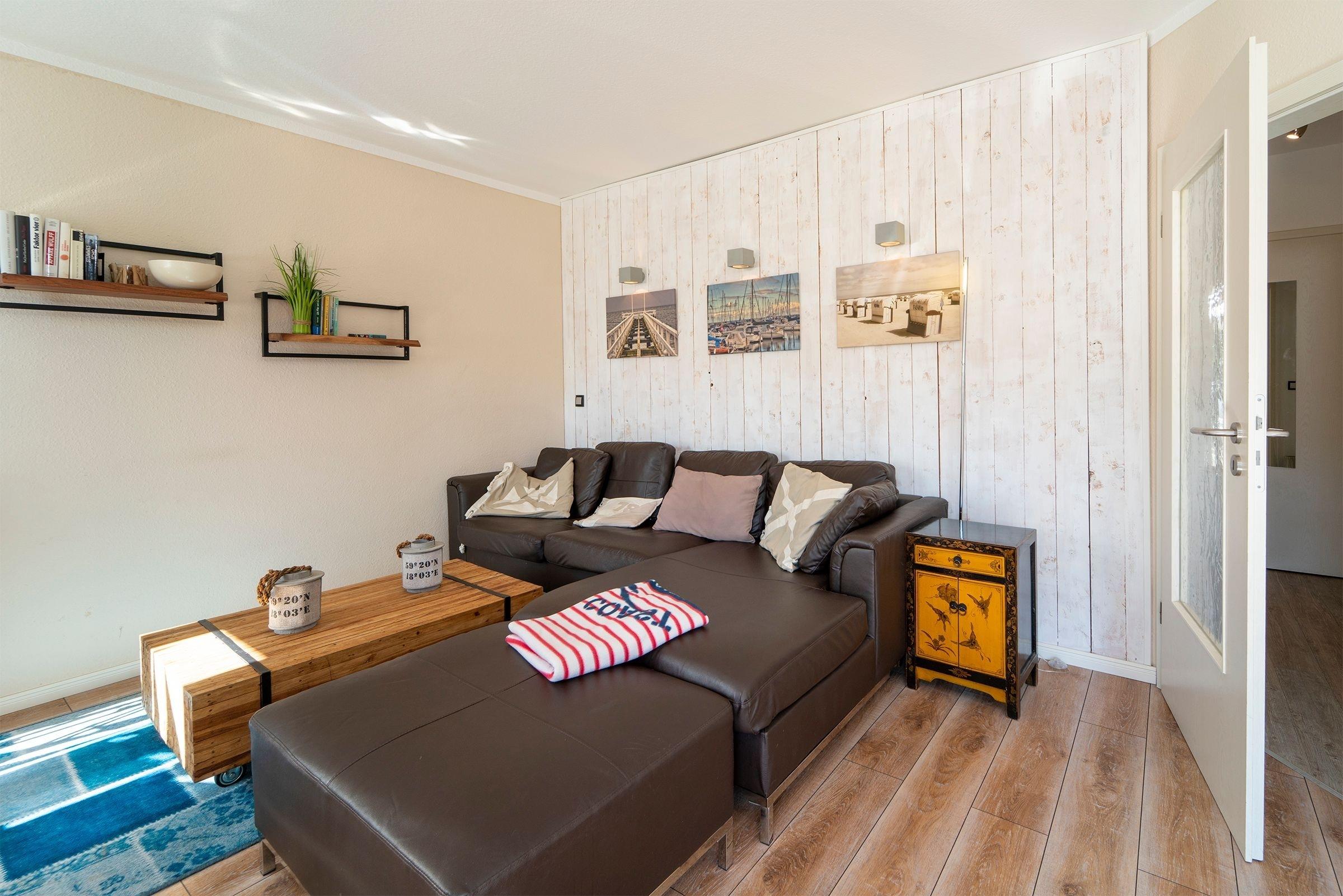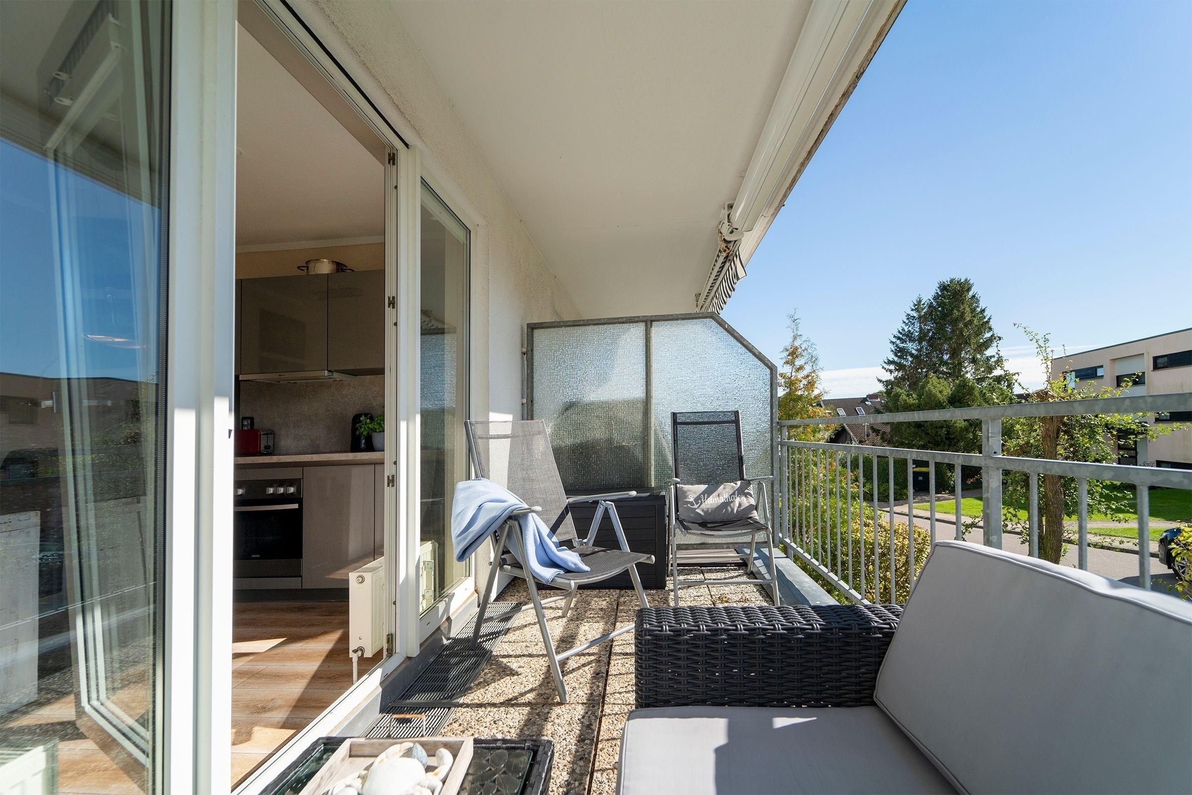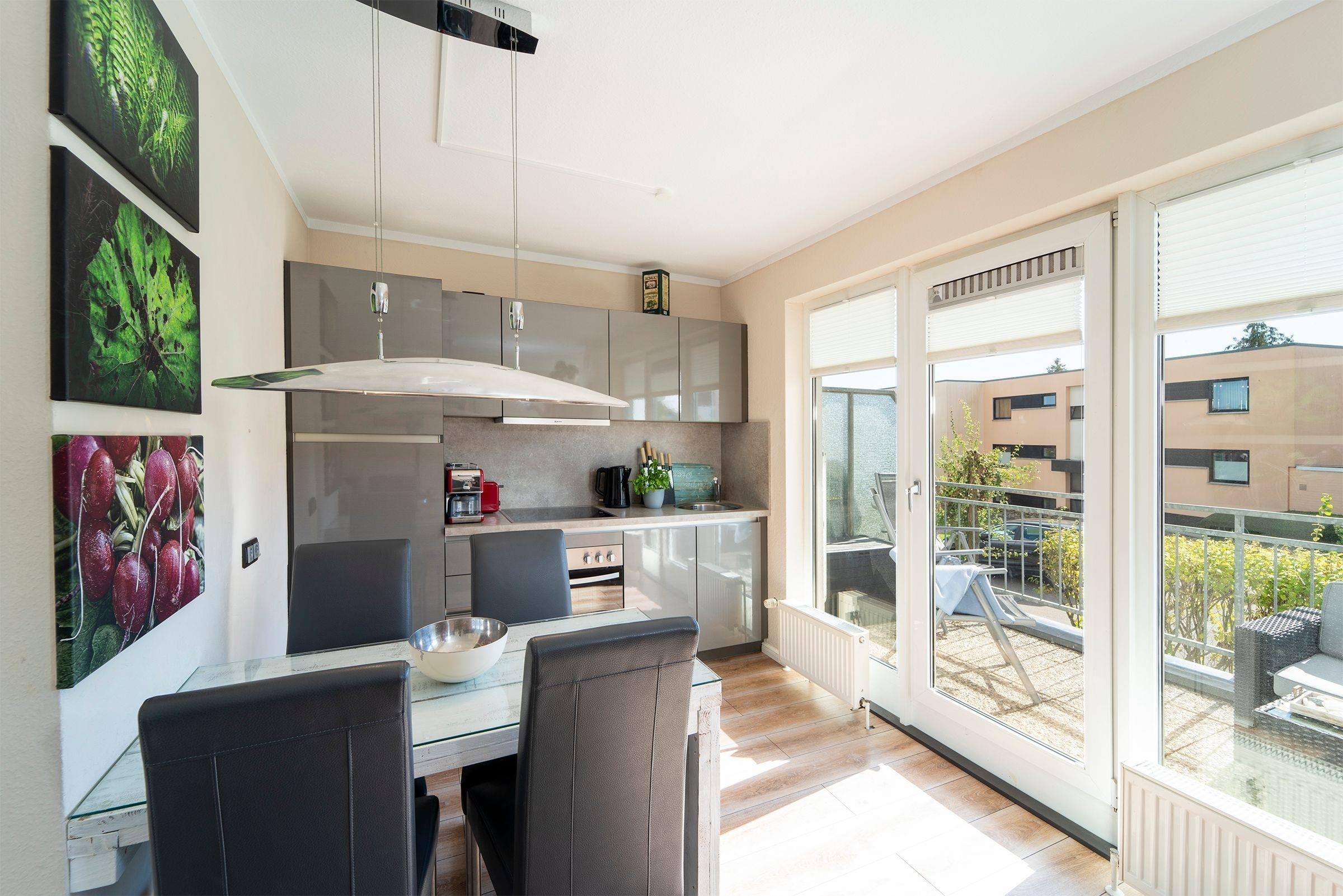 Der helle, modern gestaltete Wohnbereich mit maritimen Akzenten lädt nach einem langen Strandspaziergang zum Entspannen ein. Die mit hochwertigen Geräten (u.a. Smoothiemaker) gut ausgestattete Küche mit stylischem Essbereich lässt auch im Urlaub für den/die Hobbykoch/-köchin keine Wünsche offen. Vom offenen Wohn-Essbereich gelangen Sie direkt auf den nach Süden ausgerichteten Balkon, der mit seinen Loungesesseln zum Verweilen einlädt und in den Nachmittagsstunden Sonnenschutz bietet. Auf der selben Ebene finden Sie das maritim gestaltete Gäste-WC.