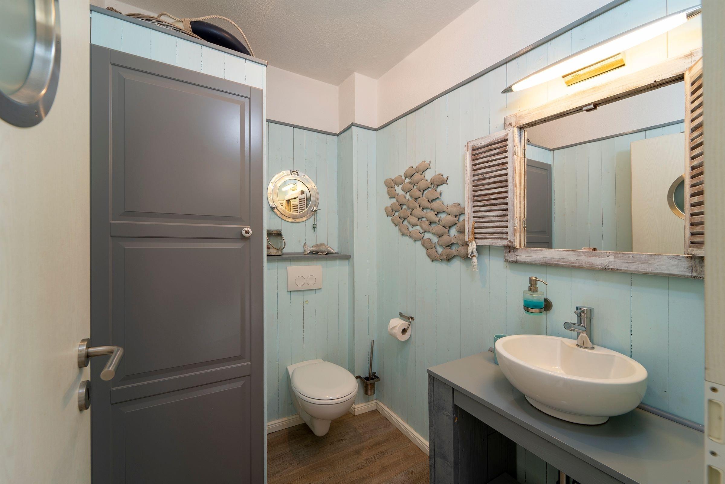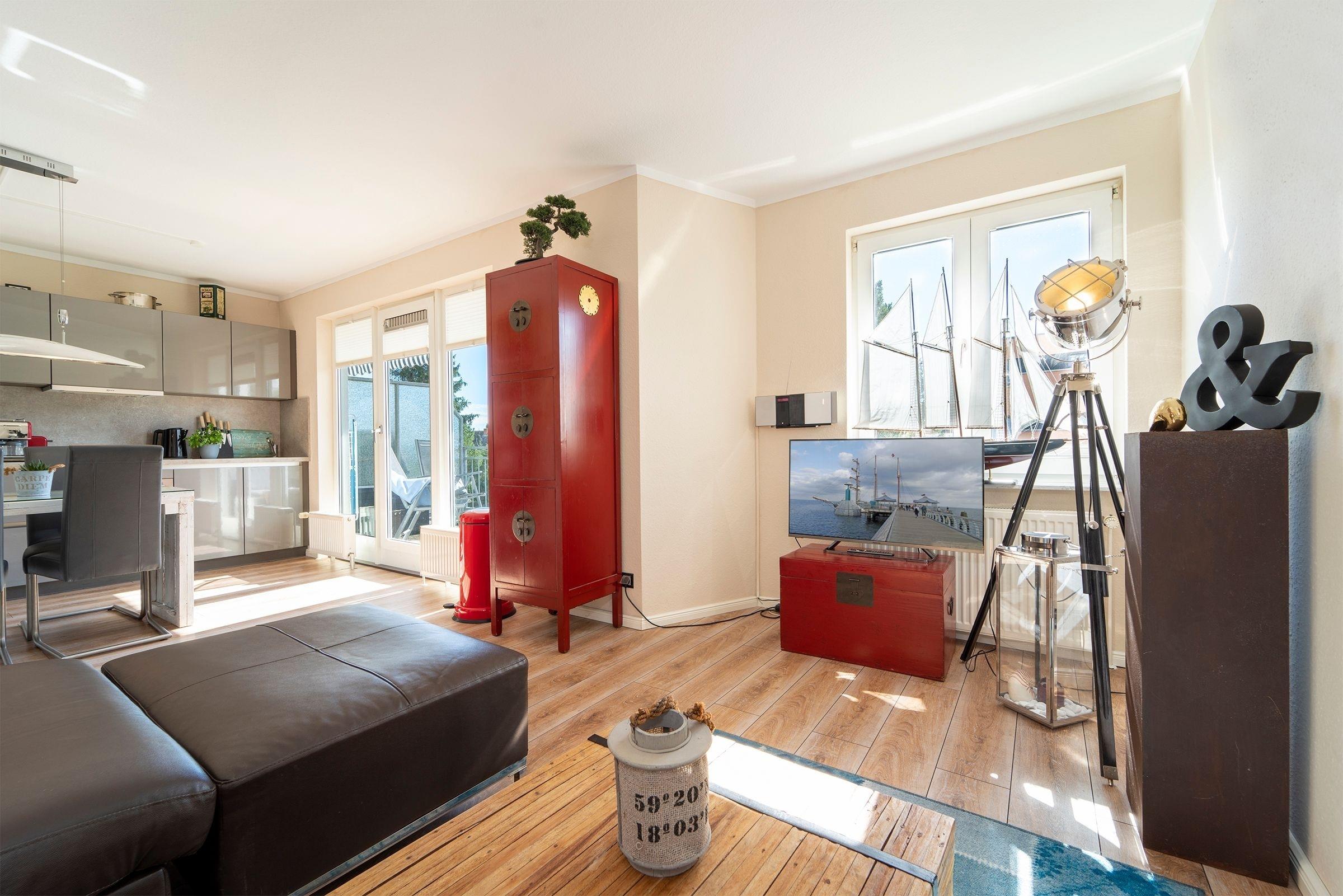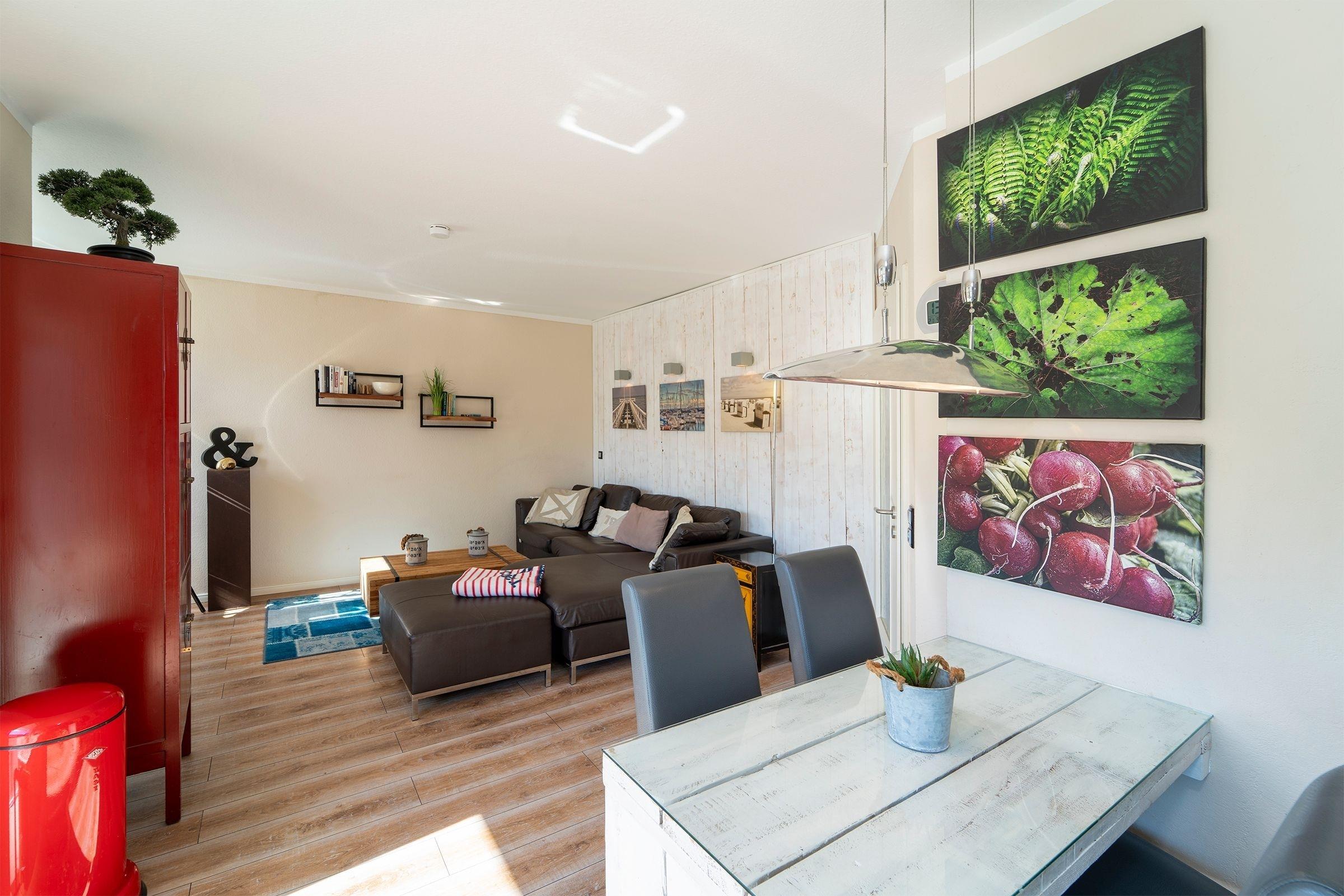 Der helle, modern gestaltete Wohnbereich mit maritimen Akzenten lädt nach einem langen Strandspaziergang zum Entspannen ein. Die mit hochwertigen Geräten (u.a. Smoothiemaker) gut ausgestattete Küche mit stylischem Essbereich lässt auch im Urlaub für den/die Hobbykoch/-köchin keine Wünsche offen. Vom offenen Wohn-Essbereich gelangen Sie direkt auf den nach Süden ausgerichteten Balkon, der mit seinen Loungesesseln zum Verweilen einlädt und in den Nachmittagsstunden Sonnenschutz bietet. Auf der selben Ebene finden Sie das maritim gestaltete Gäste-WC.