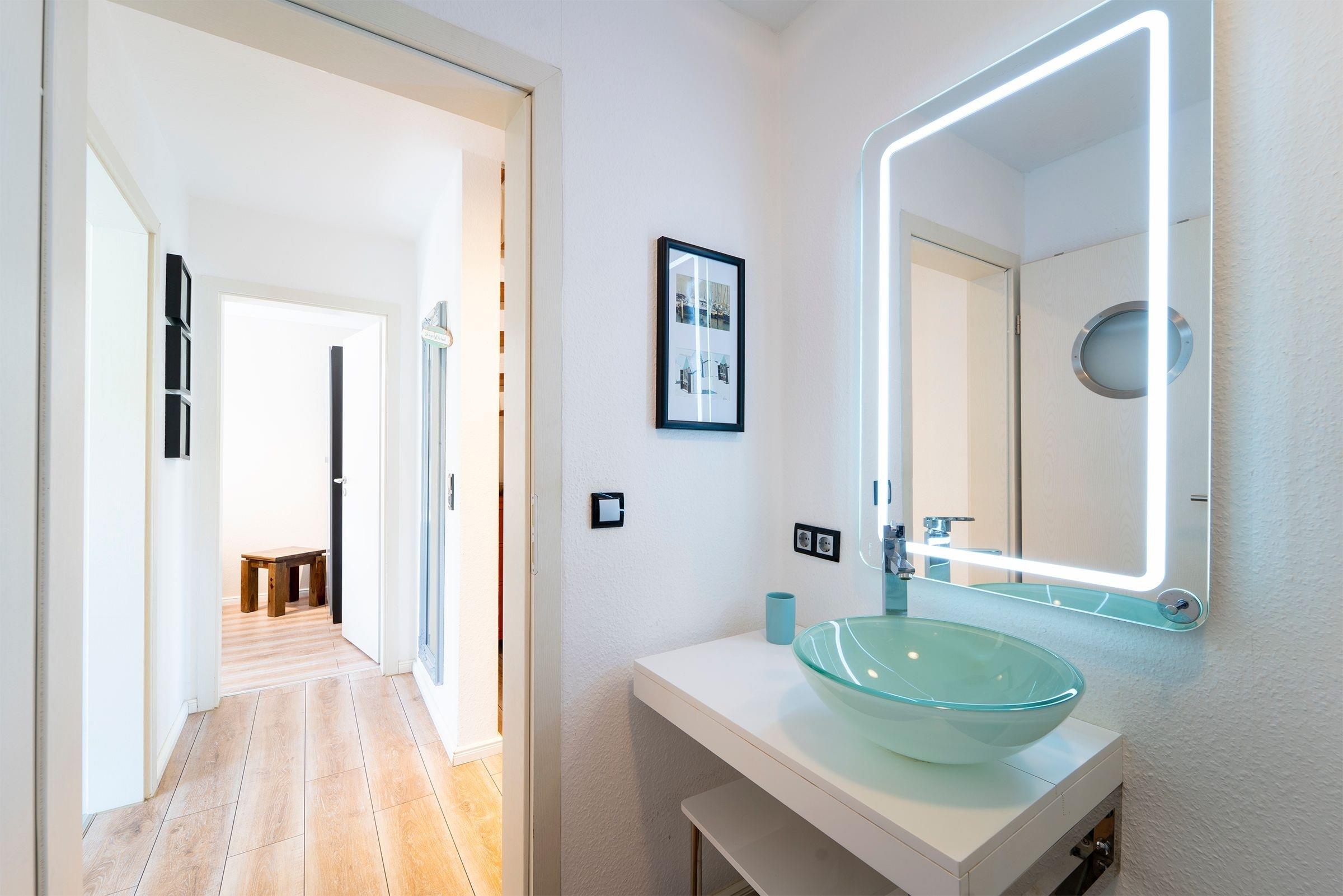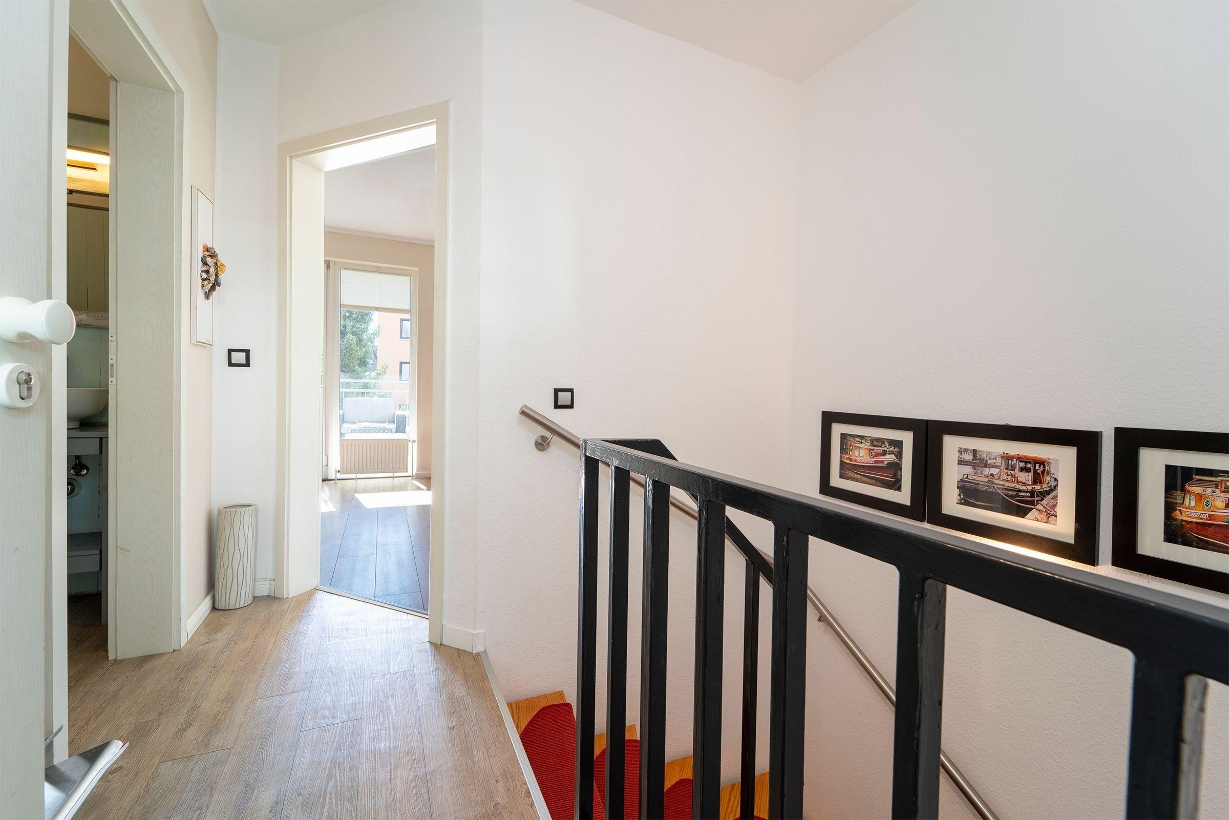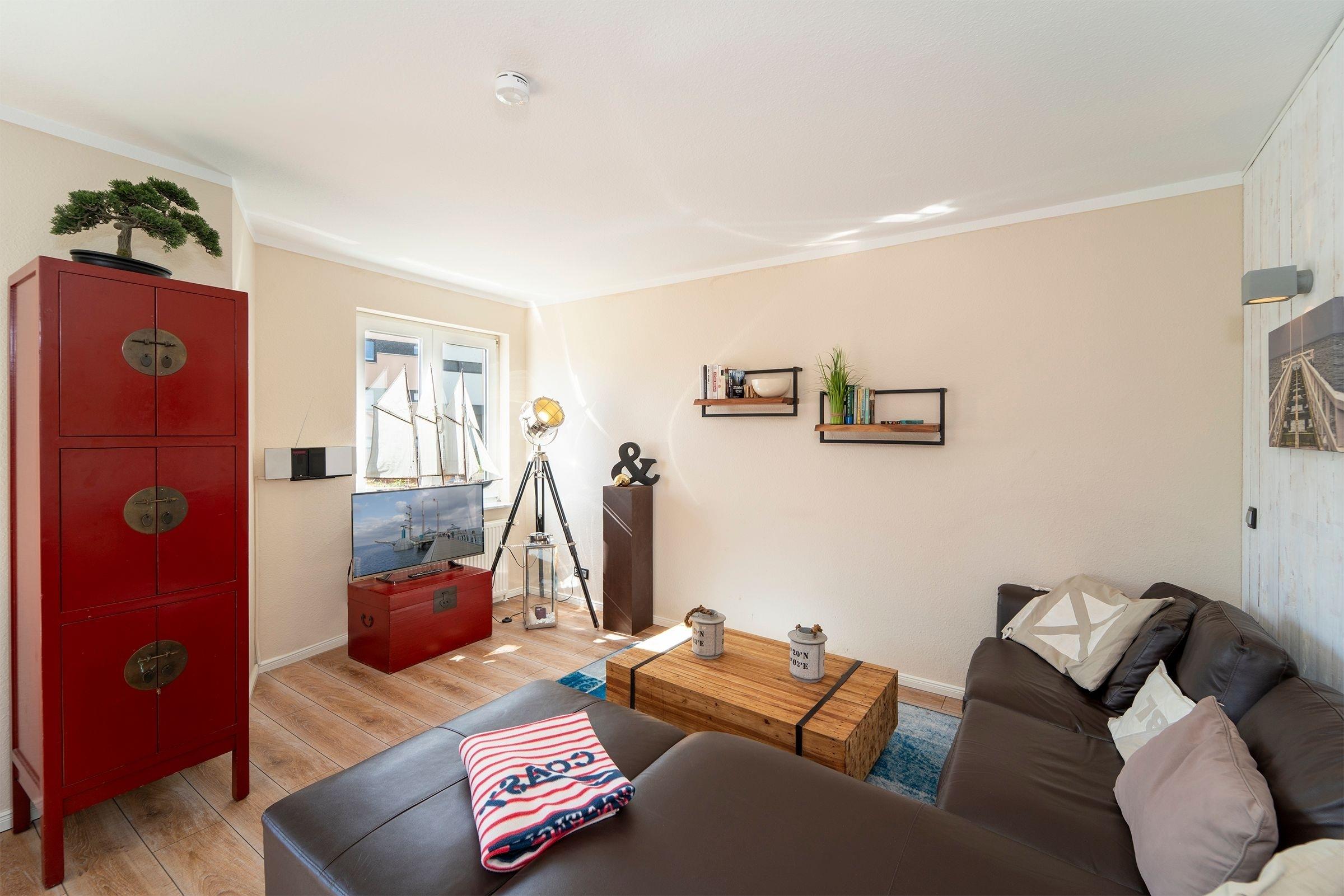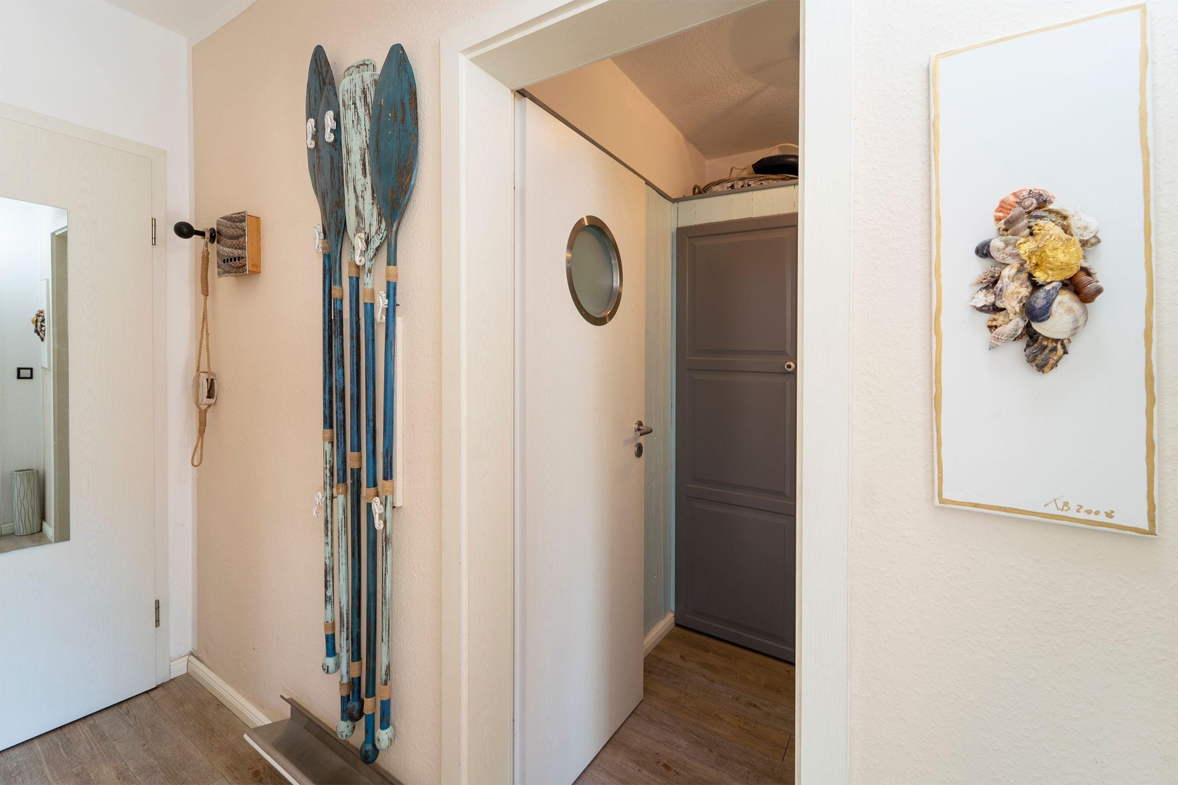 Der helle, modern gestaltete Wohnbereich mit maritimen Akzenten lädt nach einem langen Strandspaziergang zum Entspannen ein. Die mit hochwertigen Geräten (u.a. Smoothiemaker) gut ausgestattete Küche mit stylischem Essbereich lässt auch im Urlaub für den/die Hobbykoch/-köchin keine Wünsche offen. Vom offenen Wohn-Essbereich gelangen Sie direkt auf den nach Süden ausgerichteten Balkon, der mit seinen Loungesesseln zum Verweilen einlädt und in den Nachmittagsstunden Sonnenschutz bietet. Auf der selben Ebene finden Sie das maritim gestaltete Gäste-WC.