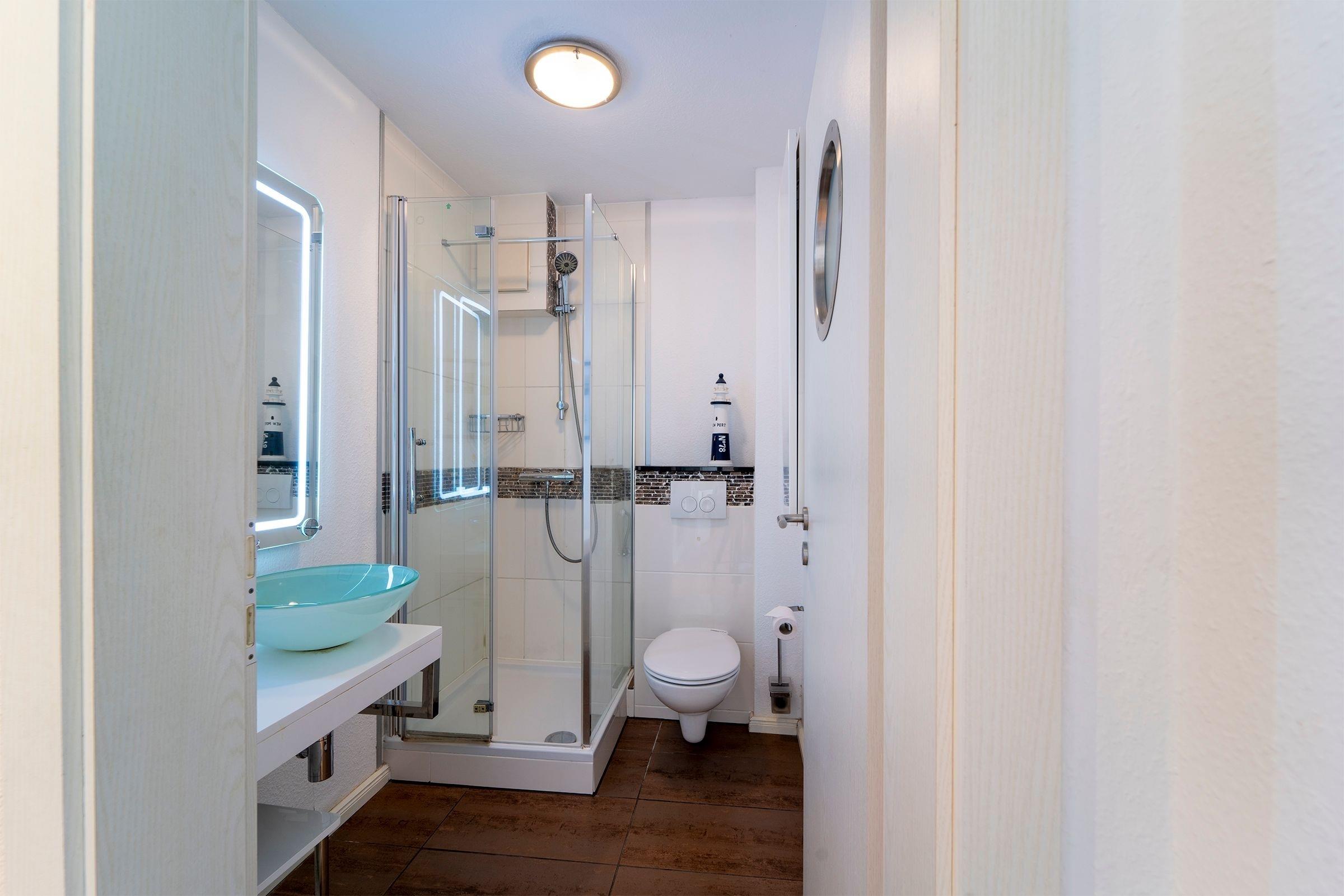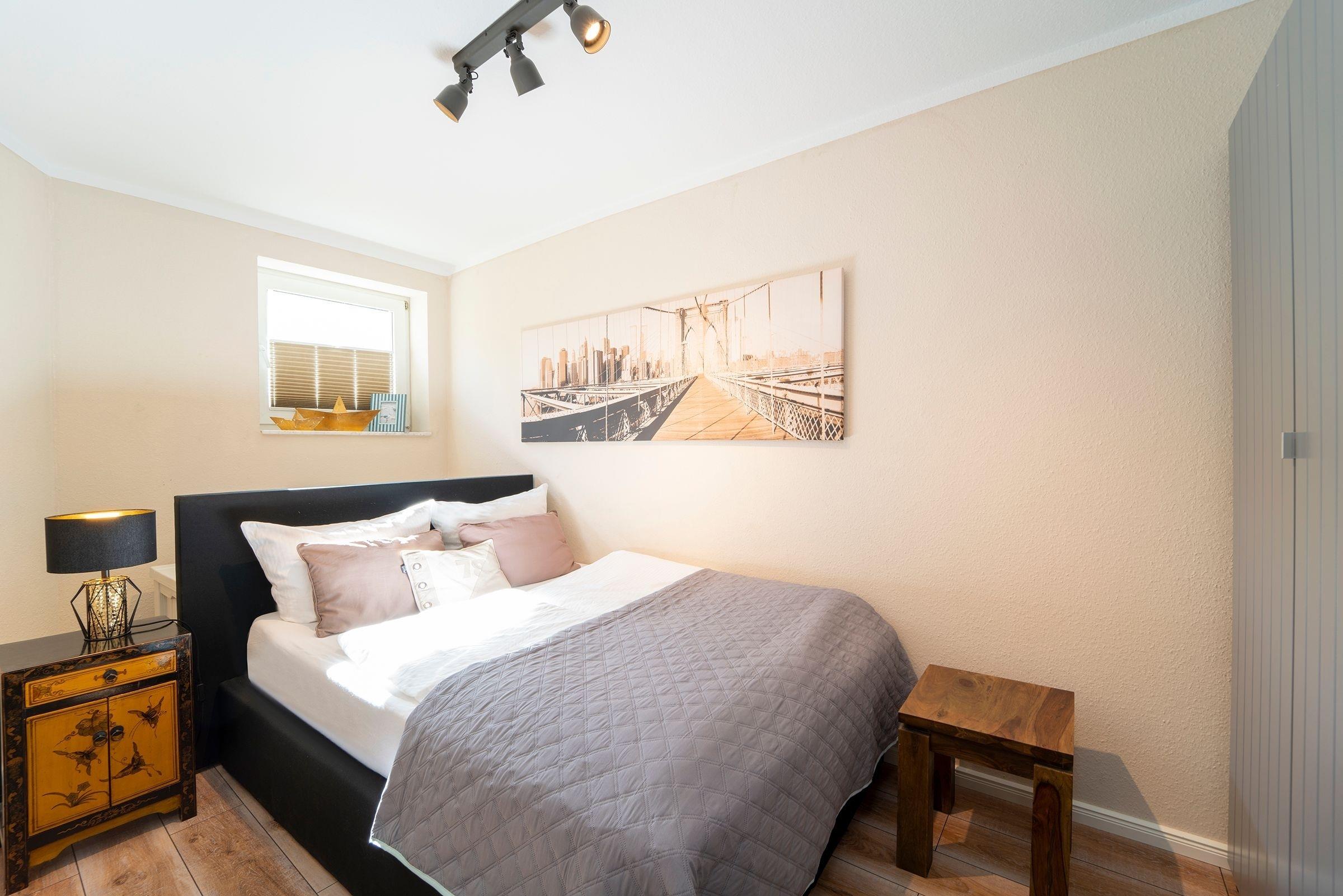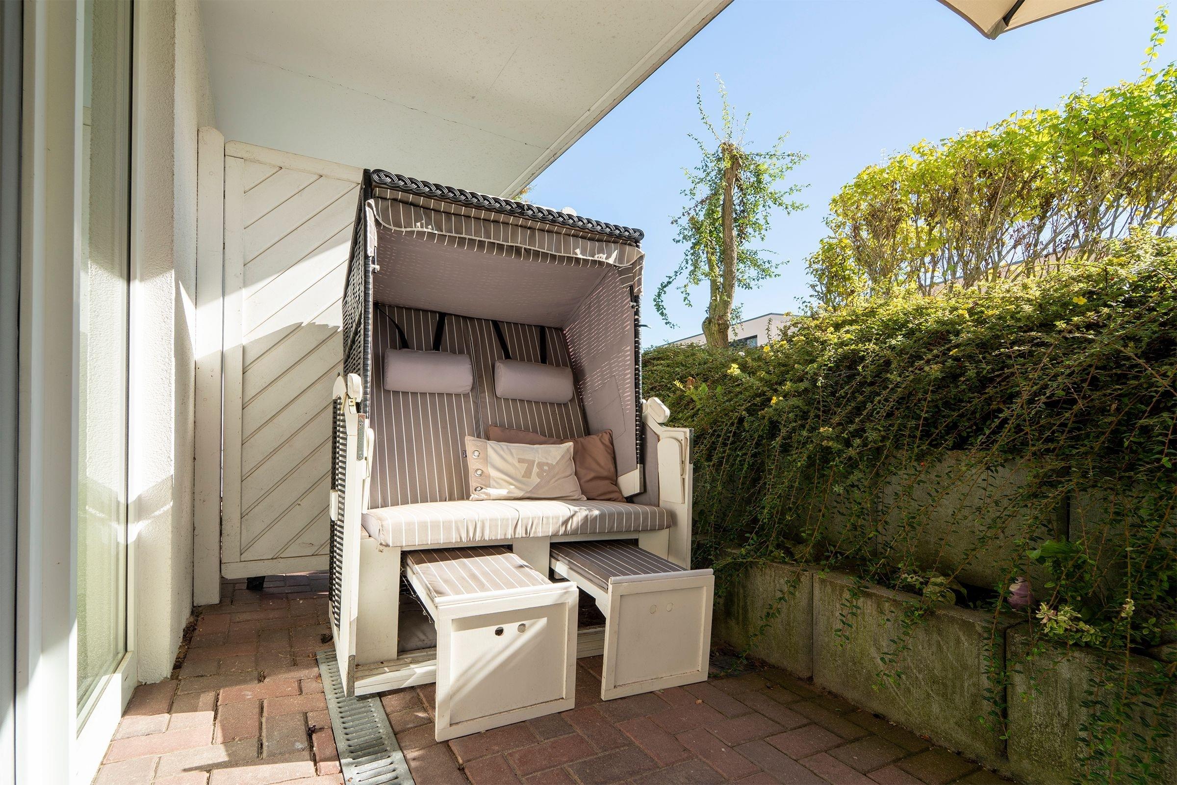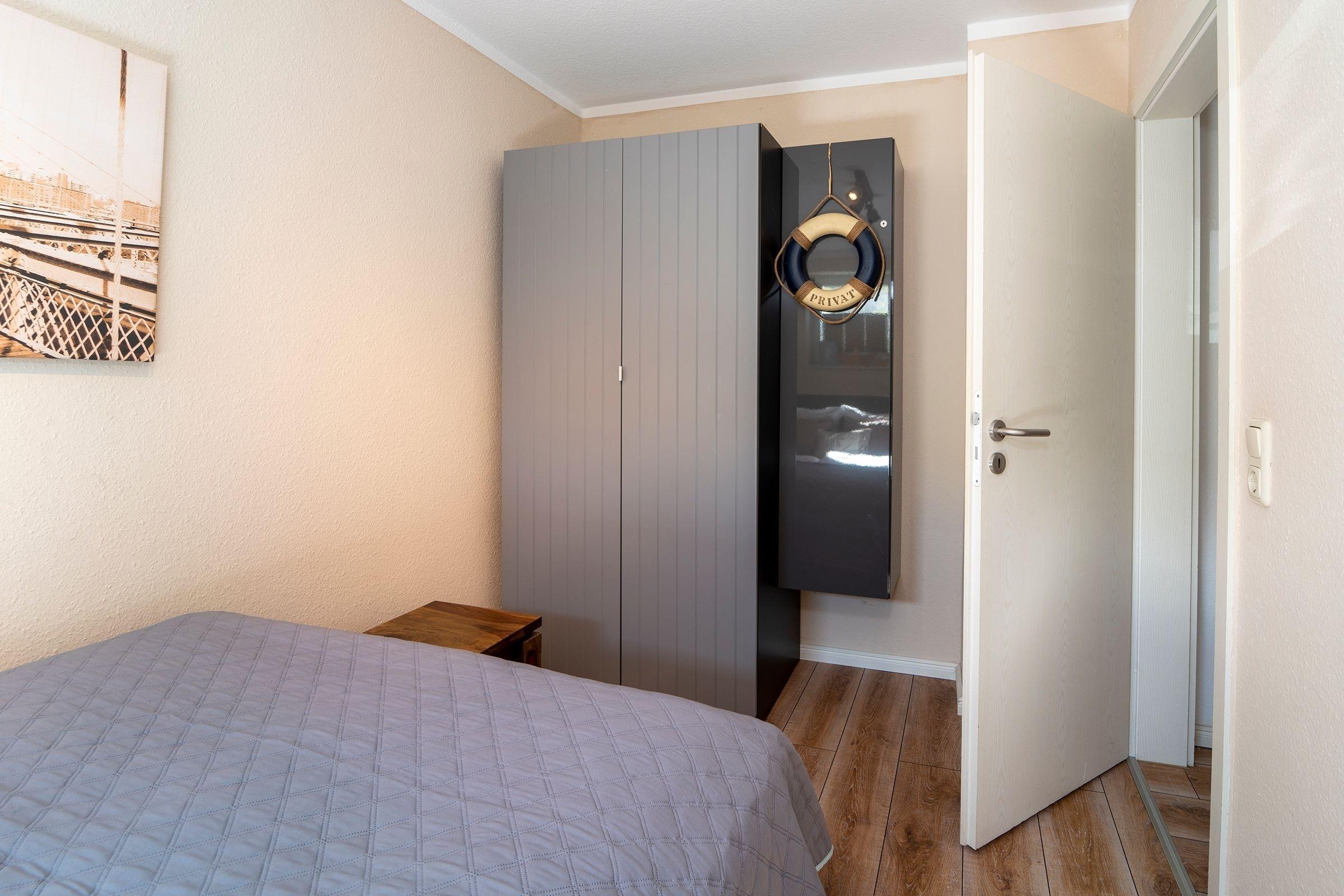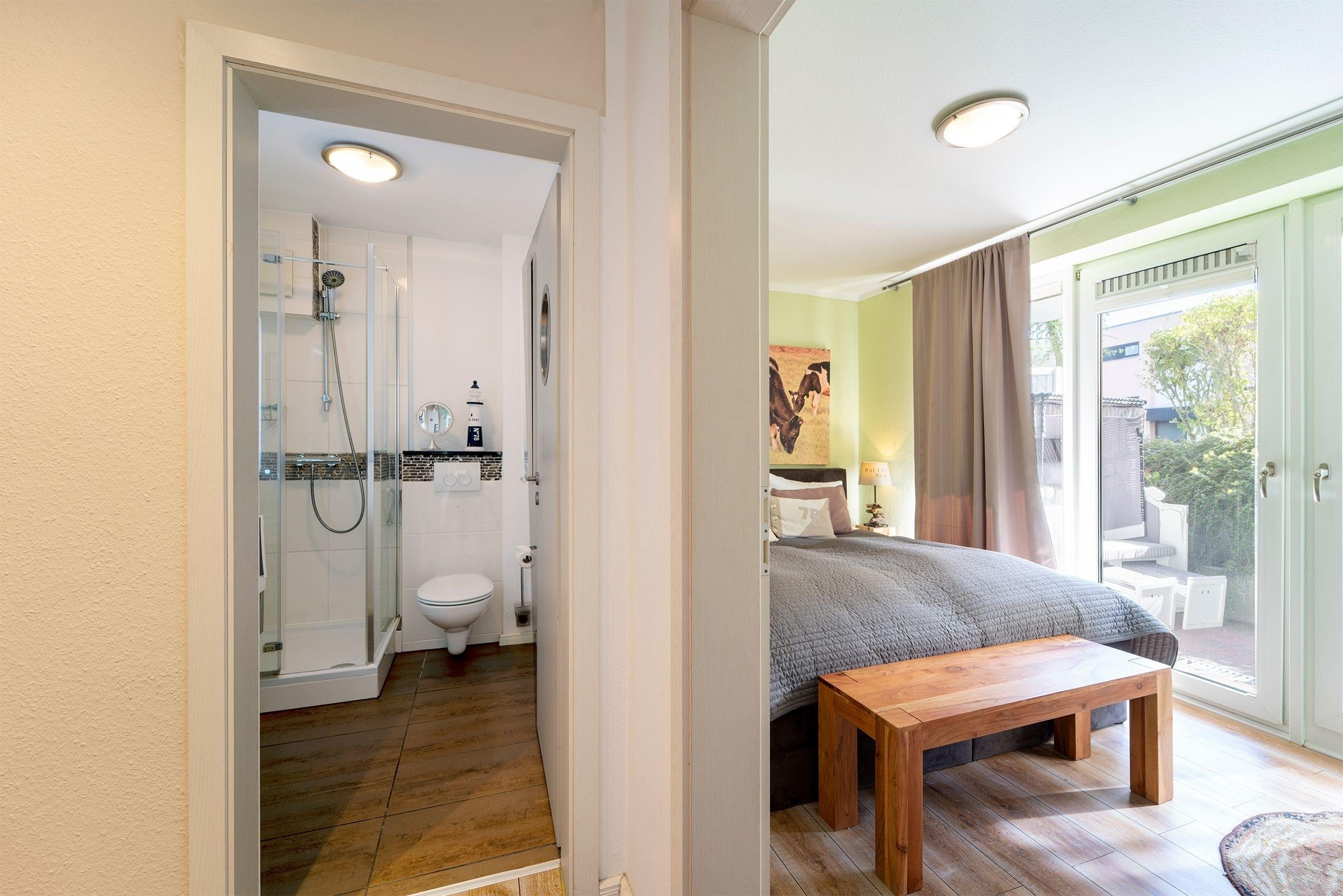 In das freundliche Souterrain gelangen Sie über eine Treppe in der Wohnung. Bitte beachten Sie, dass keine Kindersicherung vorhanden ist. Dort befinden sich zwei geschmackvoll gestaltete Schlafräume. Das erste Schlafzimmer ist u.a. mit einem großen, elektrisch verstellbaren Boxspringbett (180cm x 200cm) und einem Safe ausgestattet. Von hier aus gelangen Sie direkt auf die Terrasse, auf der Sie ab dem Frühjahr ein gemütlicher Strandkorb einlädt, den Abend bei einem Glas Wein ausklingen zu lassen. Das Souterrain präsentiert sich mit der nach Süden ausgerichteten großen Fensterfront hell und freundlich. Das zweite Schlafzimmer verfügt ebenfalls über ein Boxspringbett (140cm x 200cm). Auf dieser Ebene befindet sich das maritim eingerichtete Duschbad. Das gesamte Logis begeistert mit stilsicherer Einrichtung und wertigem Charakter.