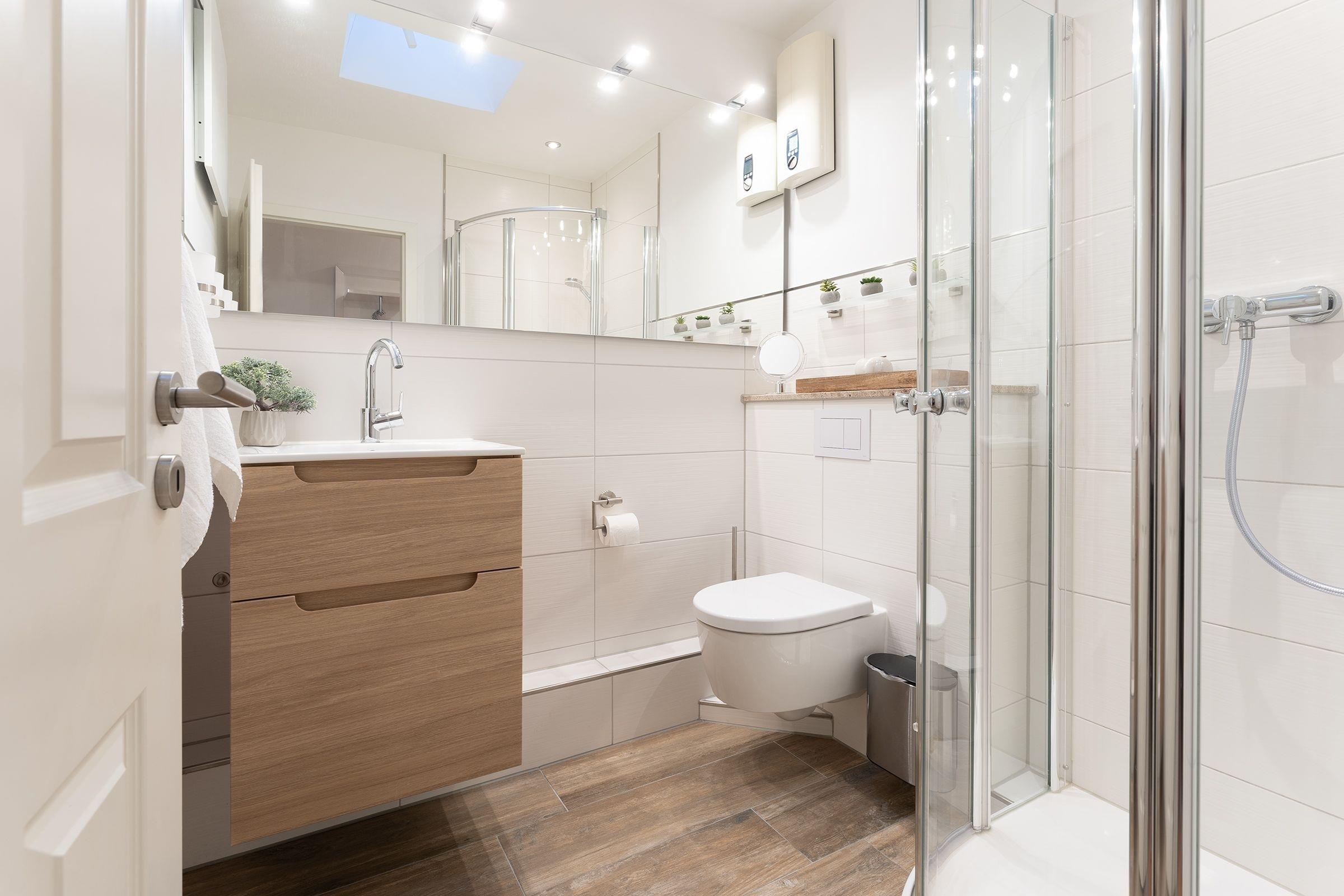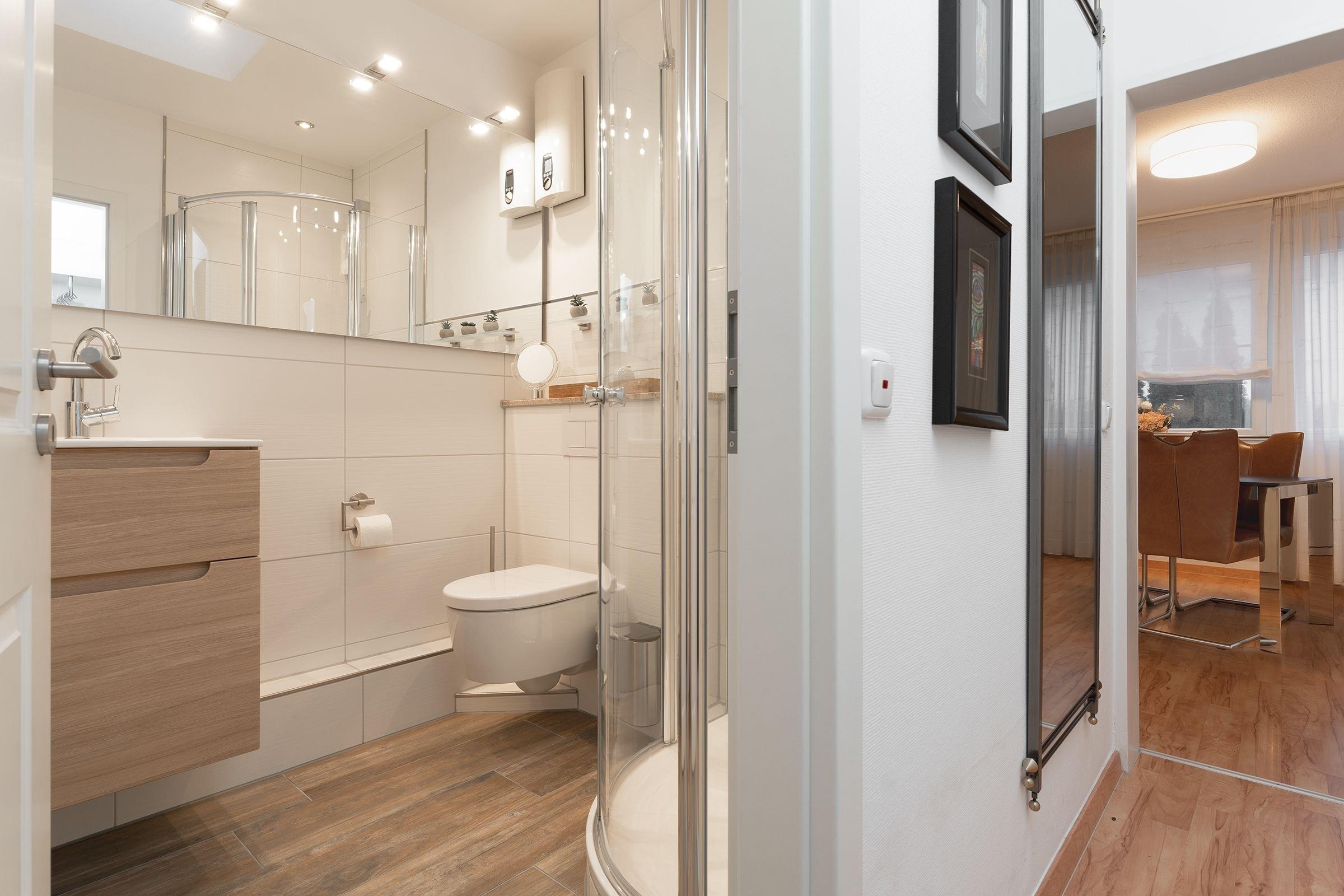 Über eine kleine Treppe gelangen Sie zum absoluten Schmuckstück der Ferienwohnung: Die idyllisch und blickdicht angelegte Terrasse mit Südausrichtung. Völlig ungestört genießen Sie hier einen heißen Kaffee am Morgen oder eine leckere Grillwurst am Abend. Das weiß geflieste Badezimmer verfügt über eine Dusche und reichlich Abstellfläche. Erholsame Nachtruhe finden Sie im angrenzenden Schlafzimmer. Das komfortable Bett verfügt über