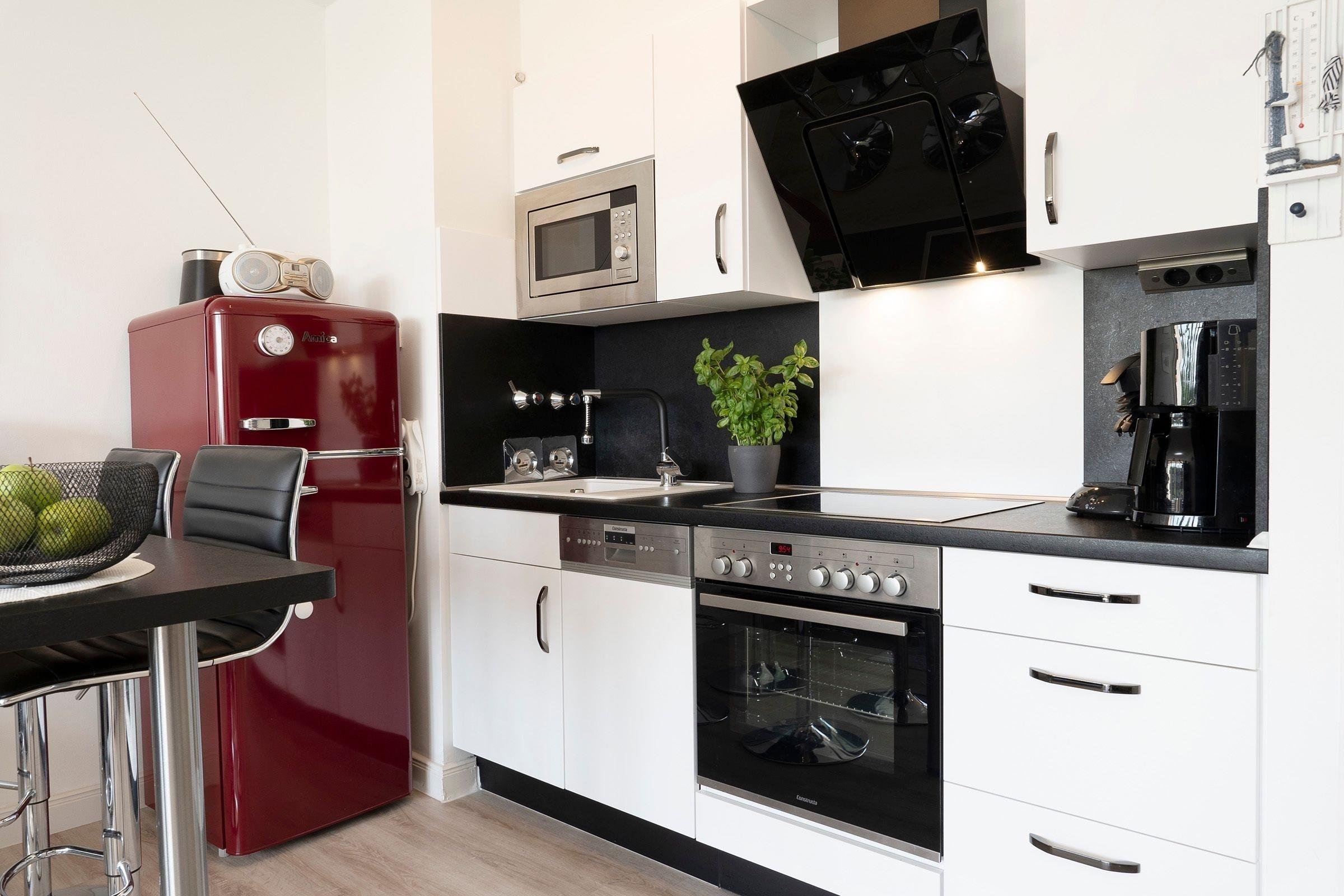 Der geschmackvolle Wohn- und Kochbereich empfängt Sie mit einer hochwertigen und individuellen Ausstattung. Hier können Sie sich eine Auszeit vom Alltag nehmen und auf dem bequemen Sofa abschalten. Dieses lässt sich bei Bedarf in eine gemütliche Schlafstätte (140 cm) für eine Person verwandeln. Hinter der großen, lichtbringenden Fensterfront befindet sich Ihr möblierter Balkon mit saisonal eingeschränktem Meerblick. Die moderne Küche mit Essplatz ist offen gestaltet und perfekt in den Wohnbereich integriert. Sie bietet alles, was Hobby-Koch-Herzen höher schlagen lässt -ein Ceranherd mit Backofen, Spülmaschine, Kühlschrank inkl. Gefrierfach, Mikrowelle, Kaffeemaschine und Senseo Padmaschine, Toaster und Wasserkocher. Bereiten Sie problemlos Ihre Mahlzeiten zu und genießen Sie gesellige Kochabende. Über einen kostenlosen WLAN-Anschluss streamen Sie Ihre Lieblingsmusik und bleiben mit Ihren Lieben daheim in Verbindung. In einem separaten Schlafzimmer lädt ein komfortables Boxspring-Bett (160x200cm, Einstieg von einer Seite und über Fußende) mit TV-Gerät und verdunkelnden Außenrollos zu erholsamen Nächten ein. Im Flur befindet sich ein geräumiger Kleiderschrank, in dem Ihre Urlaubsgarderobe ausreichend Platz findet.