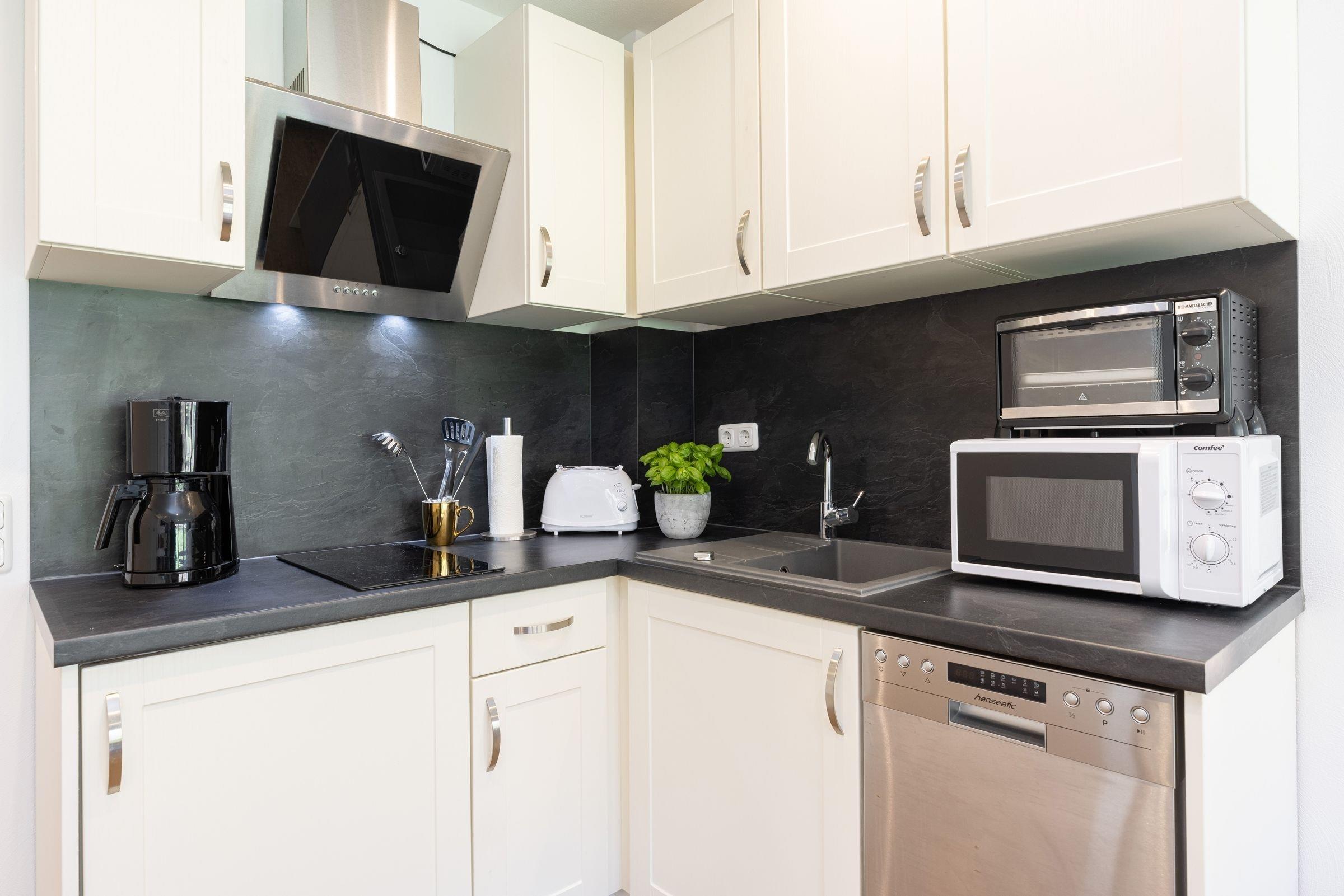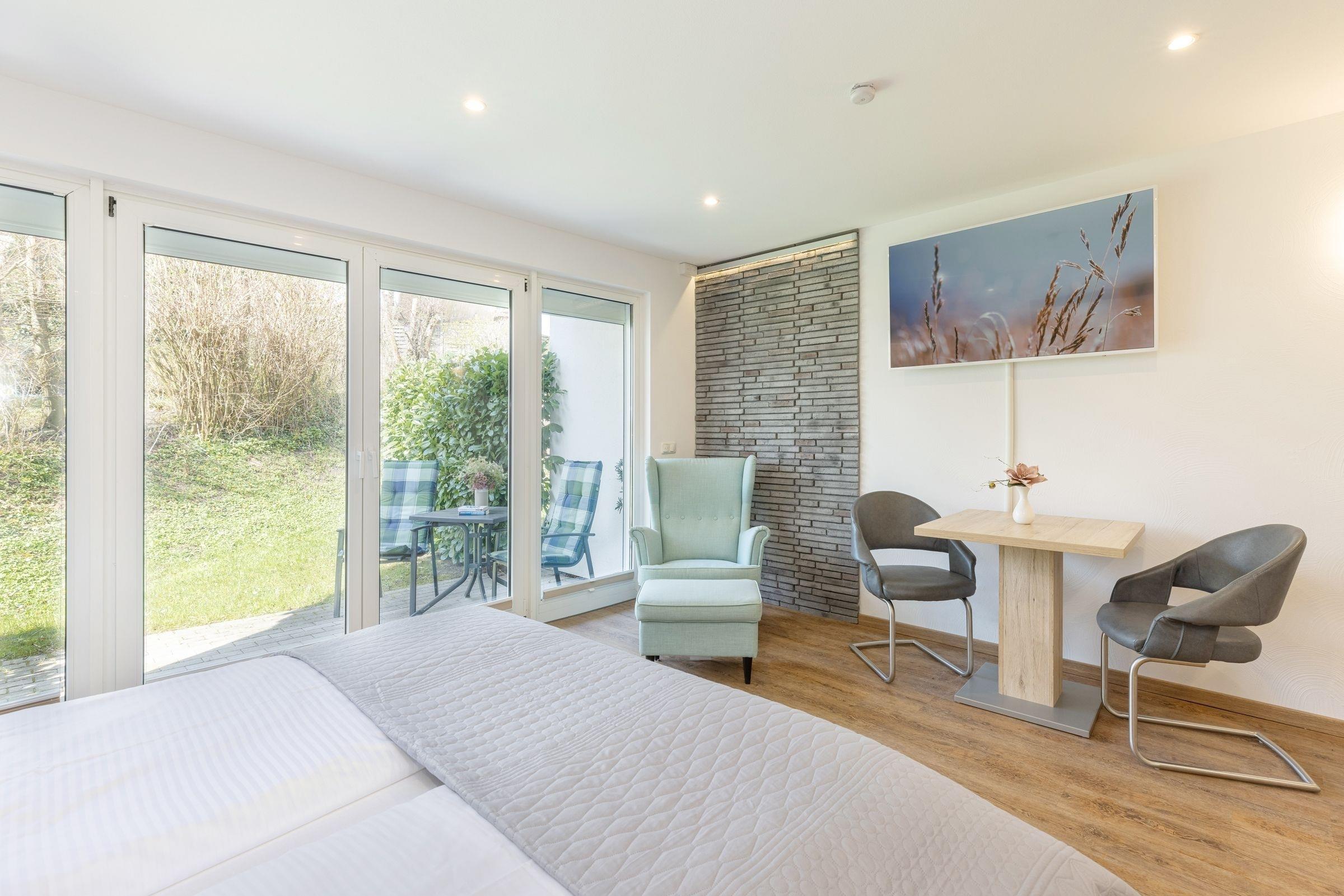 Der kombinierte Wohn-Schlafraum bietet Zugang zur lauschigen Terrasse. Hier starten Sie den Tag mit einem leckeren Frühstück oder lassen die milden Sommerabende ganz in Ruhe ausklingen. Ein hochwertiges Boxspring-Bett (2x 90x200 cm) sorgt für ausreichend Schlaf und Erholung. Keine Lust auf einen Restaurantbesuch? Kein Problem! In der offen integrierten Küche finden Sie alles, was Sie für einen gemütlichen Kochabend zu Zweit benötigen. Das kleine aber feine Luxus-Bad überzeugt mit einer ebenerdigen Dusche und modernem Design.